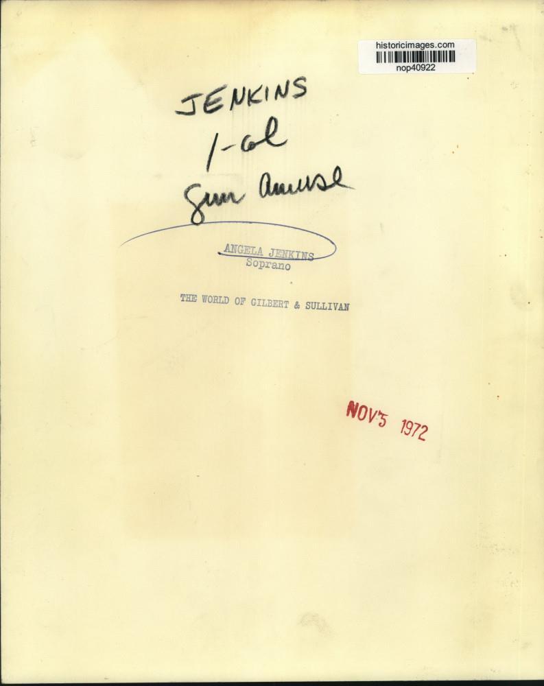 ebay template Note: Please study the images carefully to determine the condition of this vintage photograph, as it may not be in perfect condition. It may contain wrinkles, cracks, and possibly even tears due to its age and how it was handled before it got to us. A scanner may interpret colors and contrast differently than human eyes will, so it is possible that the actual photograph may be slightly darker or lighter in person. This vintage photograph is offered for sale as a collectible item and conveys no transfer of copyright. 1972 Press Photo Angela Jenkins, Soprano in "The World of Gilbert & Sullivan" This is an original press photo. Angela Jenkins, Soprano in "The World of Gilbert & Sullivan" Photo measures 8 x 10.25inches. Photo is dated 11-5-1972. PHOTO FRONT PHOTO BACK Historic Images Part Number: nop40922 Sell Smarter with Kyozou. Inventory and Ecommerce Management