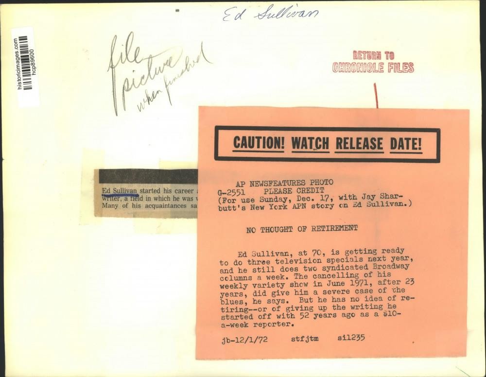 ebay template Note: Please study the images carefully to determine the condition of this vintage photograph, as it may not be in perfect condition. It may contain wrinkles, cracks, and possibly even tears due to its age and how it was handled before it got to us. A scanner may interpret colors and contrast differently than human eyes will, so it is possible that the actual photograph may be slightly darker or lighter in person. This vintage photograph is offered for sale as a collectible item and conveys no transfer of copyright. 1972 Press Photo TV Host Ed Sullivan - hcp89600 This is an original press photo. Ed Sullivan, at 70, is getting ready to do three television specials next year, and he still does two syndicated Broadway columns a week. The cancelling of his weekly variety show in June 1971, after 25 years, did give him a severe case of the blues, he says. But he has no idea of retiring—or of giving up the writing he started off with 52 years ago as a $10-a-week reporter.Photo measures 10.75 x 8.25inches. Photo is dated 12-01-1972. PHOTO FRONT PHOTO BACK Historic Images Part Number: hcp89600 Sell Smarter with Kyozou. Inventory and Ecommerce Management