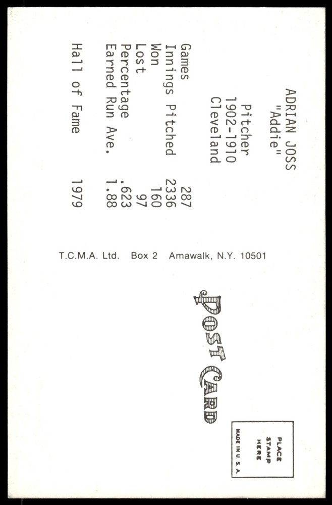 About Me Other Listings Feedback Add to Favorites Contact Me eBay Store Ultimatesports2012 1973 TCMA All-Time Great Baseball Photo Classics Postcards 1973-1979 Addie Joss No stock photo / These are real scans or pictures Details Description: Addie Joss Category: Baseball Year: 1973 Product: TCMA All-Time Great Baseball Photo Classics Postcards Set: 1973-1979 Dimensions: 5½" x 3½" SKU: BL B0001 R01 I (39) Payment Please wait for your invoice before making paymentWe combine shipping please consider 0.99$ per extra card you buyPayment is expected within 72 hours of the end of the auctionIF YOUR INVOICE EXCEEDS $75 YOU NEED TO USE EXPRESS SHIPPING WITH TRACKING NUMBER. Add $3 to the total Shipping We ship once a week on Friday. If you need your item faster please ask us before making an offer and we will confirm if we can ship fasterShipping is made out of Montreal CanadaI use CHITCHATS for my shipping across the borderDelivery can sometimes vary if you use regular shipping Returns and Claims We accept returns within 30 days of auction's endPlease note that return shipping is at the BUYERS expense About Us Ultimatesports2012 is a long time Ebay seller with over 7000 transactionsWe strive on giving good customer service please contact us if you have any questions or inquiries Listing By Kronocard trading cards software v2.8.1.0
