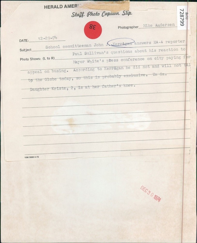 1974 Photo John Kerrigan Paul Sullivan Mayor Whites Conference Krista 8X10 Press Photo Front Photo Back We are selling the original press photos which have been sitting in drawers, folders and boxes at newspapers' offices for decades. All of our photos are in used condition and none have been officially rated. The best indication of condition is the scans you see on the listing which are scans of the individual photo being sold and not a stock image. Please study the images carefully to determine the condition of this vintage photograph, as it may not be in perfect condition. It may contain wrinkles, cracks, and possibly even tears due to its age and how it was handled before it got to us. This vintage photograph is offered for sale as a collectible item and conveys no transfer of copyright. Frequently Asked Questions Q: Can I just download a digital version instead? A: No, we sell only vintage originals and do not make or distribute any copies, including digital ones. Q: Do you combine shipping and invoices? A: Multiple photos won on the same seller ID combine automatically through the eBay checkout process. If you encounter problems with this, send us a message via eBay messaging and we will send you an invoice. Due to eBay limitations, we cannot combine items won on our different seller IDs for a single shipping charge. Q: How quickly do you ship the items once paid? A: We ship within one business day after your payment clears. Q: How do you make sure my photograph arrives safely? A: We package each order between two cross-corrugated pieces of cardboard to ensure that the package is as difficult to bend as possible. We then send each order in a plastic envelope to help protect against moisture. We want you to rest assured that we take every precaution to ensure that the photograph you receive will be in the same condition in your care as it was in ours. Q: Will the "Vintage Image Photos" watermark be on my photo when I receive it? A: No, t he watermark is digitally added to prevent online image theft. It is not on the actual photo. Q: What are your office hours? A: eBay for us is a business, and a very fun one to be in! We are open M-F 9 to 5 (CST). Therefore, we do not return e-mails and phone calls over the weekend. We observe the following holidays: New Year’s Day, President’s Day, Memorial Day, Fourth of July, Labor Day, Columbus Day, Thanksgiving, Christmas Day. Q: Where did all these vintage photos come from? A: These original vintage photographs are from various news service and newspaper photo archives from locations around the country including: Boston, Detroit, Tampa, Chicago, Denver, Seattle, New Orleans, Milwaukee, Portland, Spokane, Miami and more. We do not copy or reproduce any photographs -- every item is a unique vintage piece that was housed in a news archive. Q: Can I use this photograph in my book/blog/website? A: Our official answer to copyright questions is: “This vintage photograph is offered for sale as a collectible item and conveys no transfer of copyright.” Copyright laws are fairly complex. Some, but not all of our photos copyrights have expired into the public domain. These works have expired into the public domain: -All works published in the U.S. before 1923 -All works published with a copyright notice from 1923 through 1963 without copyright renewal -All works published without a copyright notice from 1923 through 1977 -All works published without a copyright notice from 1978 through March 1, 1989, and without subsequent registration within 5 years. Since we don’t know which of these rules apply to each photo, you can contact the newspaper that originally published the photograph (if it’s still in business) to obtain copyright permission if you are wanting to reproduce it. . Q: Do you relist items (in case I miss an auction ending)? A: Auction items that receive no bids are relisted in our store as a fixed-price item and at a higher price than the starting auction price. Q: Do you leave feedback? A: Yes, we always leave feedback for buyers. Our software monitors when our buyers leave us feedback, then notifies us that we can leave feedback for the buyer. Rest assured, if you leave feedback, we will do the same! About Us Vintage Image Photos was formed in December 2010, with a single scanner working out of a home office to digitize newspaper photo archives. We can now archive hundreds of photos per day, which allows us to bring thousands of fresh auctions per week to the world's largest online auction marketplace. We are constantly adding to our inventory, and have assembled an archive of hundreds of thousands of photos to date. We have photos from newspapers from Cleveland, Detroit, Boston, Denver, Seattle, Tampa, St. Petersburg, Chicago, Miami and New Orleans. Satisfaction Guarantee We want to make sure your every transaction you have with Vintage Image Photos is a great buying experience. We do our best to describe and show each item accurately. The pictures in the listing are scans of the actual photo, not a stock image, so you know exactly what to expect. We use tracking for every shipment and respond within one business day to all messages and requests. If, for any reason, you’re not satisfied with a photo, we offer a 60 day return window, the longest one available on eBay. Powered by SixBit's eCommerce Solution