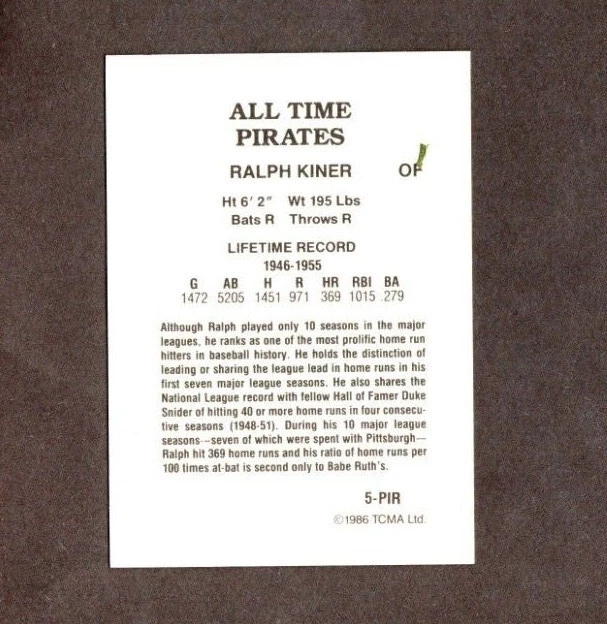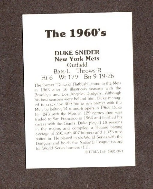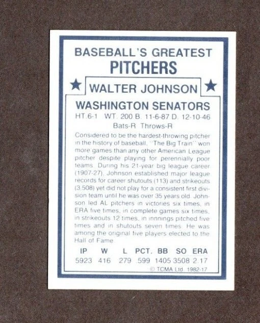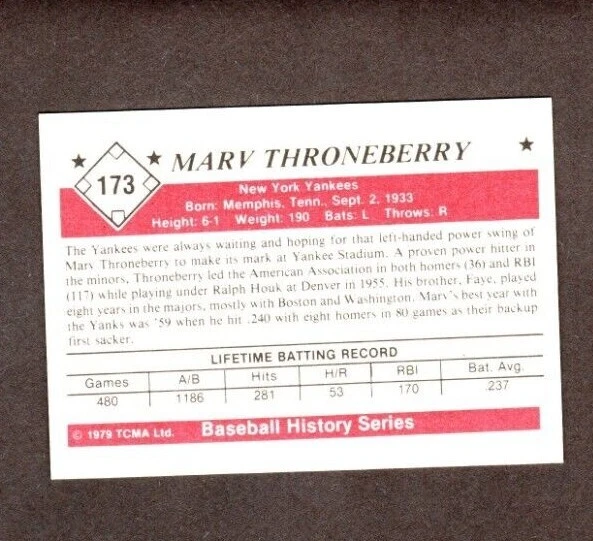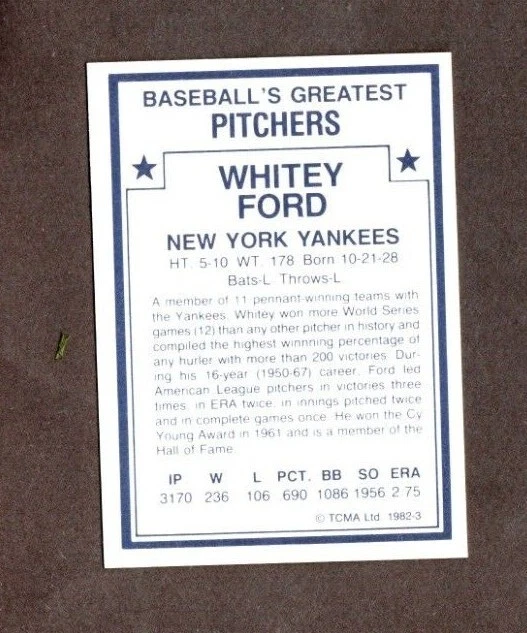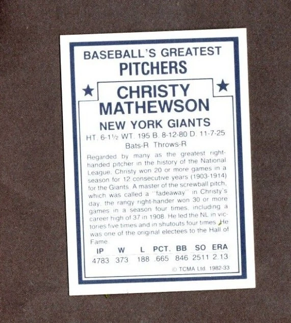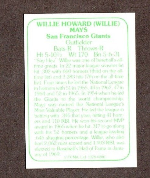 ****DON'T FORGET --- MULTIPLE WINNING AUCTIONS ARE $0.10 FOR EACH ADDITIONAL ITEM (UNLESS NOTED)**** ****Spend $20.00 on 2 or more items and shipping is free (U.S. only)**** Be sure to add me to your favorites list ! Check out my other items ! This auction is for assorted 1978 - 1986 TCMA baseball greats cards - YOU CHOOSE. Cards are in NrMt-Mint in condition. See below for condition guide per Beckett. Cards are on magazine type paper stock, not standard sports card stock. Item(s) will be shipped in a bubble wrap envelope. I accept Paypal, (for additional forms of payment, please contact me). I will ship the item(s) within 24-48 hours from receipt of payment, payment due within 10 days of the end of auction please. I offer combined shipping on multiple winning auctions for $0.10 on each additional item (international buyers add $1.00 per additional item). If for any reason you are not satisfied, I will refund the purchase price (excluding shipping costs) if the item(s) are returned within 14 days. Thanks for bidding!! International buyers, please note: Import duties, taxes, and charges(typically collected upon delivery or pickup) are the buyer's responsibility and are not included in the item price or shipping charges. Please check with your country's customs office prior to bidding/buying to determine what these additional costs may be. Please allow sufficient time for items to clear customs after purchase and shipment. Condition / Grades guide Mint (MT) - No flaws. Four perfect corners. 55/45 or better centering, smooth edges, original color borders and gloss; no print spots, color or focus imperfections. Near Mint - Mint (NrMt-Mint) - Must have 60/40 or better centering, smooth edges, original color borders and gloss. One of the following very minor flaws is allowed; a slight touch of wear on one corner, barely noticeable print spots, color or focus imperfections. Near Mint (NM) - Centering of 70/30 to 60/40. In addition one of the following minor flaws is allowed: a slight touch of wear on two or three corners, slightly rough edges, minor print spots, color or focus imperfections. Excellent-Mint (ExMt) - Centering no worse than 80/20. No more than two of the following flaws are allowed: two or three fuzzy corners, slightly rough edges, very minor border discoloration, minor print spots, color or focus imperfections. Excellent (EX) - Centering no worse than 80/20 with four fuzzy corners. May also have rough edges, minor border discoloration and minor print spots, color or focus imperfections. Very Good (VG) - Handled, but not abused. Slightly rounded corners with slight layering, slight notching on edges, moderate border discoloration, some gloss lost from the surface, but no scuffing. May have hairline creases. Good (G), Fair (F), Poor (P) - Well-worn or abused. Badly rounded and layered corners, scuffing, no original gloss, major border discoloration and serious creases.