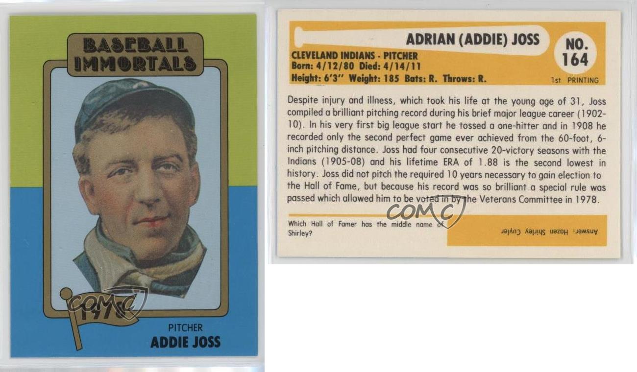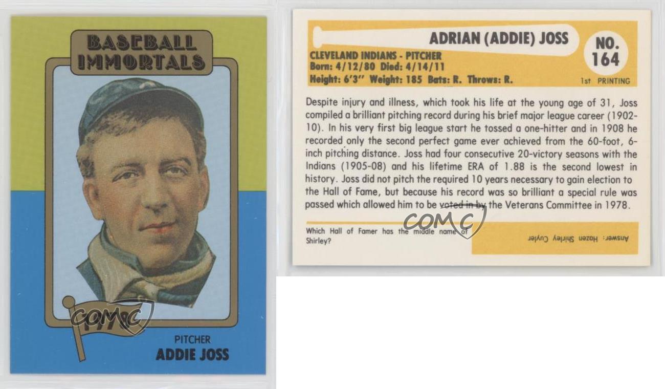 1980-84 SSPC Baseball Immortals 1st Printing - [Base] #164 Addie Joss - Rookie - Baseball Card - Featuring the Cleveland Indians - Featuring Addie Joss Search for more: 1980-84 SSPC Baseball Immortals 1st Printing Search for more: 1980-84 SSPC Baseball Immortals 1st Printing - [Base] View all of our Listings Auctions Buy It Now About Us Located in the beautiful Pacific Northwest, COMC (Check Out My Cards) is the world's largest consignment service for trading card singles. More than 10,000 people have used our consignment service to list over 50 million trading cards. Find out how we can help you consign your items on eBay by contacting us through eBay messaging. COMC -- "The Safe & Easy Way to Buy & Sell" Representative Image - Select Specific Item above to see image of actual item Representative Image - Select Specific Item above to see image of actual item Raw Condition for Modern Cards Unless otherwise noted, raw modern cards are listed in Near Mint-Mint condition or better. A NM-MT card appears to be Mint at first glance, but upon closer inspection, may exhibit some of the following: minor print defects (e.g. roller marks, print line, dimple), minor scratches, slight edge wear, and slight corner wear. Centering is clearly visible in the images provided and does not factor into our condition assessment. Raw Condition for Vintage Cards Unless otherwise noted, raw vintage cards are listed in Excellent condition or better. An EX card may exhibit some of the following: minor rounding of corners, surface wear, print defects, light scratches, and slight edge wear/chipping. Centering is clearly visible in the images provided and does not factor into our condition assessment. Domestic Shipping Combined shipping for multiple items is available. To receive combined shipping, please ensure all desired items are in your eBay shopping cart before proceeding to checkout. eBay limits orders to 40 items per order. We automatically combine multiple orders placed on the same day. If you place multiple orders on the same day, please contact us to request a refund of applicable shipping costs. Signature confirmation may be required on invoices over $400. All cards are protected and shipped securely. International Shipping COMC offers eBay's International Shipping (EIS) for international orders under $2,500* (see country exceptions below). All duties and import fees are paid at checkout; in the rare event that there are additional import fees upon delivery, these are borne by the buyer. EIS packages route through a shipping hub in Erlanger, KY before shipping to their final destination. Please note that EIS does not allow for combined shipments. The shipping rates are determined by eBay and cannot be adjusted. *Maximum sale price exceptions: Colombia, Kuwait ($2,000); Taiwan ($1,539); Chile, Costa Rica, Guatemala, Honduras, Trinidad and Tobago ($1,000); Antigua and Barbuda, Aruba, Belize, Dominica, Grenada, Philippines, Saint Kitts and Nevis, Saint Lucia, Montserrat, Turks and Caicos Islands ($500); Dominican Republic, El Salvador ($200). Please request a shipping quote through eBay messaging for orders that exceed the maximum sale price supported by eBay's International Shipping. You will be responsible for all duties and import fees for international orders shipped outside the EIS. All cards are protected and shipped securely. Payment COMC does not accept offers on our cards through our eBay storefront. COMC utilizes eBay’s managed payments system. If you are experiencing difficulties making a payment, please contact eBay for assistance. Return Policy Returns are only accepted on the rare occasion the item is not as described. If you are making a return, please initiate the return process through eBay so a mailing label can be provided for you. Prior to listing, our expert team carefully assessed this item to represent it accurately. Please review the description and high-definition images prior to purchasing to ensure this item meets your satisfaction. We welcome you to contact us if you have further questions about this item. Trust and Integrity COMC carefully assesses each item consigned to us to prevent fraudulent items from entering the marketplace. If you believe an item offered on COMC may be fraudulent, please contact us with details so we can investigate the issue. Items we determine are outside our supported items policy may be removed. Last Modified: 5/16/2025 5:19:53 AM PDT