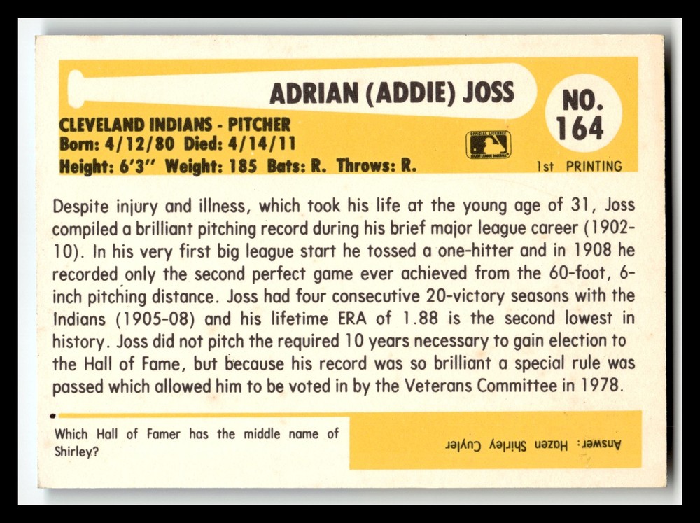 Read Complete Listing Before Purchase. You are bidding on 1980-87 SSPC HOF #164b Addie Joss . Other important information about this card: In 1980 Addie Joss played for the Cleveland Indians. Please check out my other listings for more amazing deals on cards, be sure to save me as a seller because I list hundreds of new inventory daily. - Most of our cards are scanned using a high resolution scanner, cards are scanned with a penny sleeve and or top loader for protection. Light scratches in photos are seen on the penny sleeve/top loader and not on the card itself in most cases. Feel free to request more images if in question. - Coupons and bulk deals don't apply for accepted offers. Shipping Packing/Processing : - USPS Shipping - Ships from smoke-free home. - Over $20.00 will be either a #0 bubble mailer or padded box. - Less then $20.00 will ship in a standard envelope with penny sleeve, top loader for protection. Returns/Cancellations: I do not accept returns, cancellations Please make sure you know what you're buying before placing order. Feel free to ask questions if you don’t understand something or have questions about anything