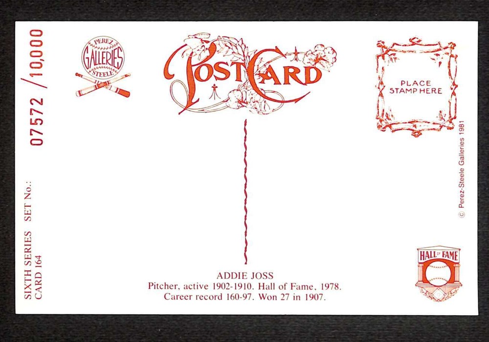 1981 Perez-Steele HOF Postcard #164 Addie Joss HOF NM D83293 This listing is for the item listed in the title. The Battersbox, Tomball, TX . Please check our other auctions! This listing created with GLETech Multiple Selling Channel tools.