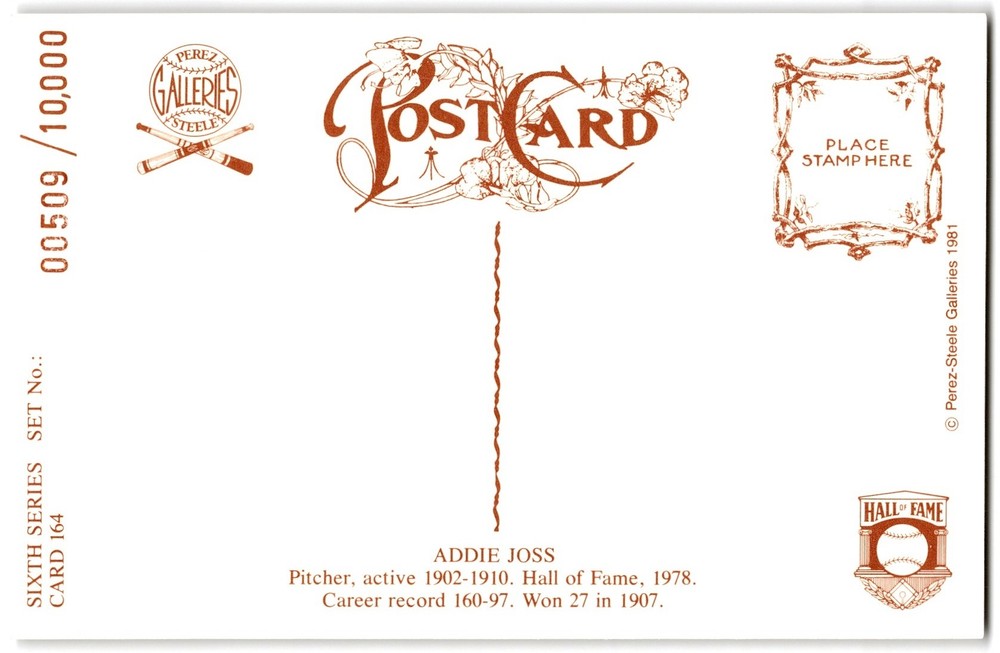 About Me Other Listings Feedback Add to Favorites Contact Me mikeocardshop 1981 Perez-Steele Hall of Fame Series 6 /10000 164 Addie Joss No stock photo / These are real scans or pictures Details Description: Addie Joss Category: Baseball Year: 1981 Product: Perez-Steele Hall of Fame Series 6 Team: Cleveland Indians Card Number: 164 Serial Number: /10000 Dimensions: 5½" x 3½" SKU: BL B0001 R18 O (14) Payment Please wait for invoice when winning multiple items at auction! Shipping Raw cards are generally near mint (NM) condition or better, A NM-MT card appears to be Mint at first glance, but upon closer inspection, may exhibit some of the following: minor print defects (e.g. roller marks, print line, dimple), minor scratches, slight edge wear, and slight corner wear. Please see the image included in the listing for condition details. Domestic shipping is a flat $4.00 for single raw card purchases. The default option is the eBay standard envelope at $1.00 for applicable cards which may take up to 30 business days to arrive and receive less tracking updates. Buy more, save more with combined shipping! About Us Thank you for checking out my eBay store! Listing By Kronocard trading cards software v2.1.2.0