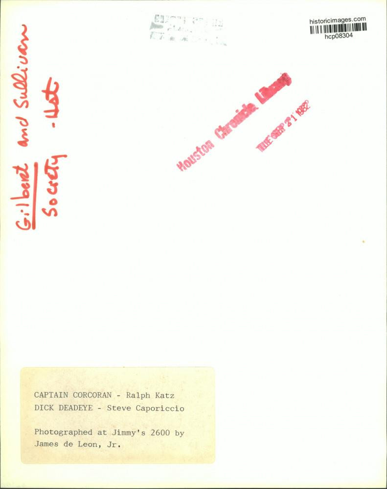 ebay template Note: Please study the images carefully to determine the condition of this vintage photograph, as it may not be in perfect condition. It may contain wrinkles, cracks, and possibly even tears due to its age and how it was handled before it got to us. A scanner may interpret colors and contrast differently than human eyes will, so it is possible that the actual photograph may be slightly darker or lighter in person. This vintage photograph is offered for sale as a collectible item and conveys no transfer of copyright. 1982 Press Photo Ralph Katz, Steve Caporiccio; Gilbert & Sullivan Society scene This is an original press photo. Captain Corcoran - Ralph Katz; Dick Deadeye - Steve Caporiccio. Jimmy's 2600. Gilbert and Sullivan Society, HoustonPhoto measures 8 x 10inches. Photo is dated 09-21-1982. PHOTO FRONT PHOTO BACK Historic Images Part Number: hcp08304 Payment & Checkout We prefer PayPal. Contact us for additional options. You may contact us through eBay messaging or write us at: Historic Images 6073 Mt. Moriah Rd. Ext. Ste. 12 Memphis, TN 38115 Local pickup is available at the above address between 10 a.m. And 4 p.m. for customers in the Memphis, TN area. Tennessee and Washington residents will be charged sales tax on each order. We ship orders Monday through Friday. We do not ship on weekends or holidays. Our standard processing time is one business day from time of payment. FAQs Q: Can I just download a digital version instead? A: No, we sell only vintage originals and do not make or distribute any copies, including digital ones. Q: Can I use this photograph in my book/blog/documentary/website? A: The short answer is no. There is no transfer of copyright for republication or reproduction with these photographs when you purchase them, and only photographs taken before 1923 are currently automatically in the public domain. Permission from the copyright holder, which usually can be identified from the back of each photo, must be sought to republish or reproduce the image for any purpose. Q: Do you combine shipping and invoices? A: Due to eBay limitations, we cannot combine items won on our different seller IDs for a single shipping charge. Multiple photos won on the same seller ID combine automatically through the eBay checkout process. If you encounter problems with this, send us a message via eBay messaging and we will send you an invoice. Q: How quickly do you ship the items once paid? A: We ship within one business day after your payment clears. If you do not receive an "order shipped" email from us by the close of the second business day from submitting payment, please e-mail us via eBay messaging. Q: How do you make sure my photograph arrives safely? A: We package each order between two cross-corrugated pieces of cardboard to ensure that the package is as difficult to bend as possible. We then wrap each order in a plastic sheet to help protect against moisture. We want you to rest assured that we take every precaution to ensure that the photograph you receive will be in the same condition in your care as it was in ours. Q: Will the "Historic Images" watermark be on my photo when I receive it? A: No. This is a digital watermark we use to protect our images. It is not printed on the photo. Q: What are your office hours? A: eBay for us is a business, and a very fun one to be in! We are open M-F 9 to 5 (CST). Therefore, we do not return e-mails and phone calls over the weekend. We observe the following holidays: New Years Day, Memorial Day, Fourth of July, Labor Day, Thanksgiving and the day after Thanksgiving, Christmas Eve and Christmas Day. Q: Where did all these vintage photos come from? A: These original vintage photographs are from various news service and newspaper photo archives from locations around the country including: Boston, Detroit, Tampa, Chicago, Denver, Seattle, New Orleans, Milwaukee, Portland, Spokane, and more. We do not copy or reproduce any photographs -- every item is a unique vintage piece that was housed in a news archive. Check out our family of eBay IDs: historicimages01 Sports Photos historicimages02 Entertainment Photos historicimages03 Americana Photos historicimages04 International & War Photos historicimages05 Transportation Photos historicimages-store Our largest fixed-price selection historicimages-market Hand-picked photos and our New Orleans collection historicimages-gallery Hand-picked photos Saturday night auctions About Us Historic Images was formed in September 2009, with a handful of scanners working out of a basement to digitize newspaper photo archives. We have since moved out of the basement, and we can now archive thousands of photos per day. Our company has worked with magazines and newspapers from Detroit, Boston, Denver, Seattle, Tampa, Chicago, and New Orleans, just to name a few. We are constantly adding to our inventory, and have assembled an archive of millions of photos to date. As our company evolved, we began our eBay business, which brings thousands of fresh auctions per week to the world's largest online auction marketplace. Our custom software systems and team of great employees allow us to efficiently scan and sell large photo archives online. At the very core of our company's DNA is a strong commitment to customer satisfaction and strict integrity for our product. Our promise to you is that we will do everything in our power to provide you a great buying experience. Copyright 2009 - Present, Historic Images, Inc. Sell Smarter with Kyozou. Inventory and Ecommerce Management