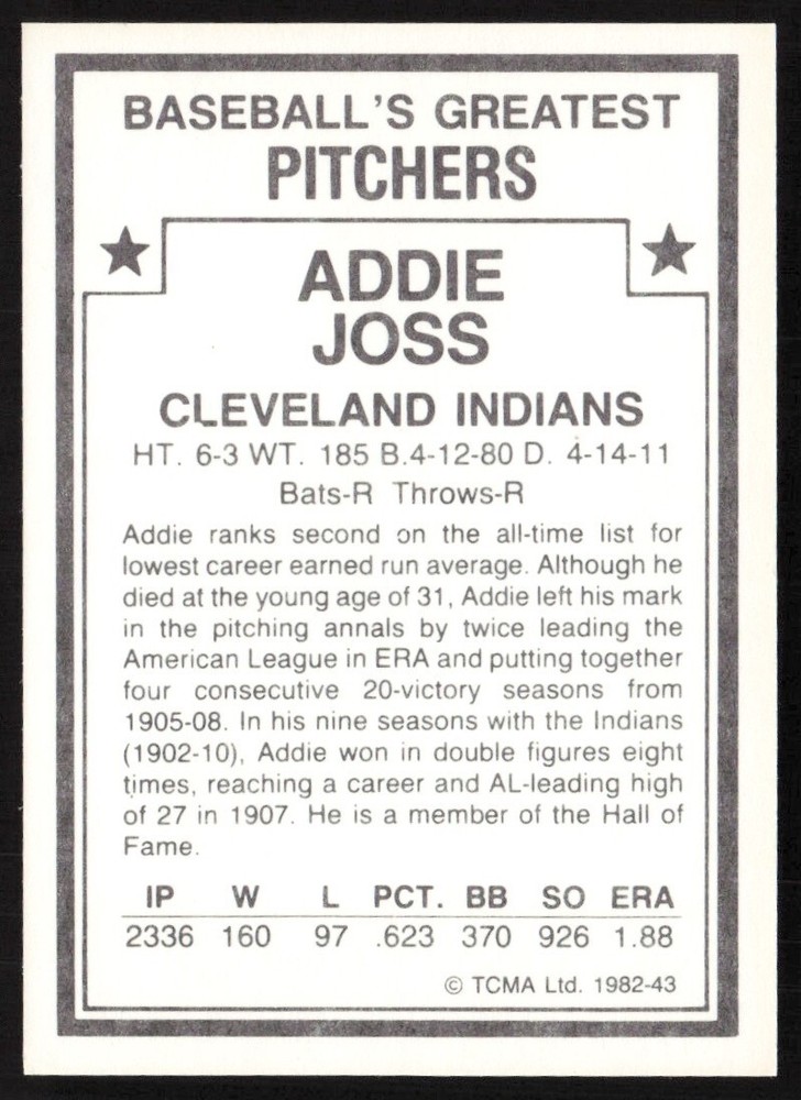 About Me Other Listings Feedback Add to Favorites Contact Me eBay Store DJ Chino Sports 1982 TCMA Baseball's Greatest Pitchers Addie Joss Cleveland Indians #43 No stock photo / These are real scans or pictures Details Description: Addie Joss Category: Baseball Year: 1982 Product: TCMA Baseball's Greatest Pitchers Team: Cleveland Indians Card Number: 43 Dimensions: 3½" x 2½" SKU: BL A0001 R01 M (92) Payment Payment due upon purchase. Shipping Shipping - Please see shipping for pricing and details. - Every card (excluding graded cards) will be shipped in a penny sleeve and Card Saver. Some cases in a top loader. - Any damage to your card during shipping, or not received. I will contact eBay to issue a refund. - I honor combined shipping and discounted shipping for additional items. For standard cards, $.10 each for additional cards. For more information, please check shipping details. - For Graded Cards, I will be shipping in a standard box and well protected. Rookie No returns or cancellations accepted. About Us Welcome to my store. I have been collecting cards for 30+ years and enjoy collecting. I am starting my store so that I can share my collection to the world. Please check out my other listings and feel free to reach out to me with any questions. Thank you. Cards Information - Cards are scanned and immediately after break. - Please refer to photos for additional details. - Cards are in NMINT or better shape may have lines, smudges, different color, or dust due to the scanner. If you would like more details on this card. Please message me and will be happy to send other photos. - Cards may have minor flaws such as slight corner/edge dings, production printing, surface dimples, ect. Please message me if you have questions. - All my cards are stored in a cool environment and in card boxes. - With listings that have multiple quantities. I do label condition, and may not be the card you you see in the picture. If you would like additional photos, please let me know and will eBay message you photos. Listing By Kronocard trading cards software v2.7.0.1