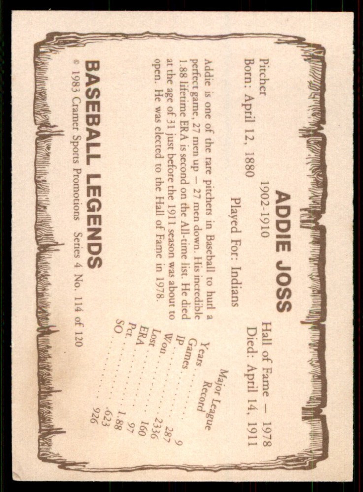 About Me Other Listings Feedback Add to Favorites Contact Me eBay Store Gulf Coast Trading Cards 1983 Cramer Baseball Legends Series 4 114 Addie Joss No stock photo / These are real scans or pictures Details Description: Addie Joss Category: Baseball Year: 1983 Product: Cramer Baseball Legends Series 4 Team: Cleveland Indians Card Number: 114 Dimensions: 3½" x 2½" SKU: BL B0006 R02 C (97) Payment Payment must be recieved with-in 2 days of purchase Shipping Standard Shipping - 1.00 plus 0.50 for each card after the first purchase Free Shipping on all order 20.00+ International Shipping has a flat rate of 15.00. About Us We specialize in oddball baseball cards from the 50's to the present. Please dont forget to check out our other Cards. We also have many that aren't listed so feel free to contact us with any that you are interested in. Listing By Kronocard trading cards software v2.1.2.0