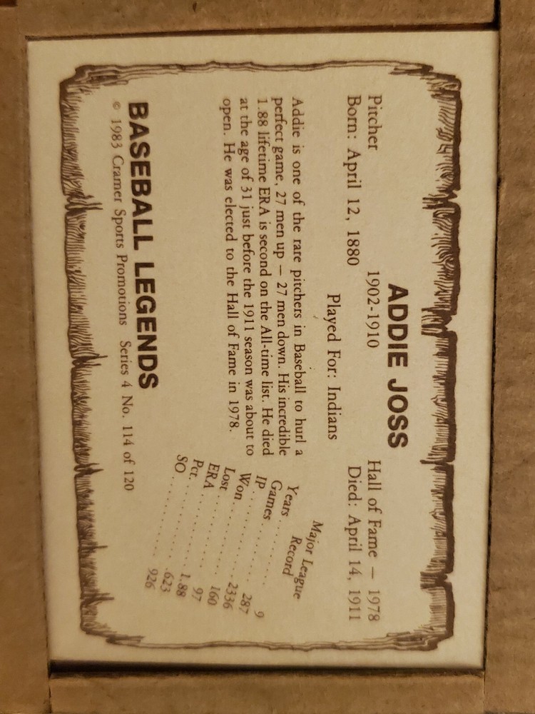 1983 Cramer Baseball Legends Series 4 HOF Addie Joss Baseball Card #114 of 120. Addie was a 2 time ERA title winner and future Hall Of Famer, who was discovered by Connie Mack, played with Ty Cobb and who pitched a perfect game on October 2, 1902. A trophy card for any baseball card collection☆.