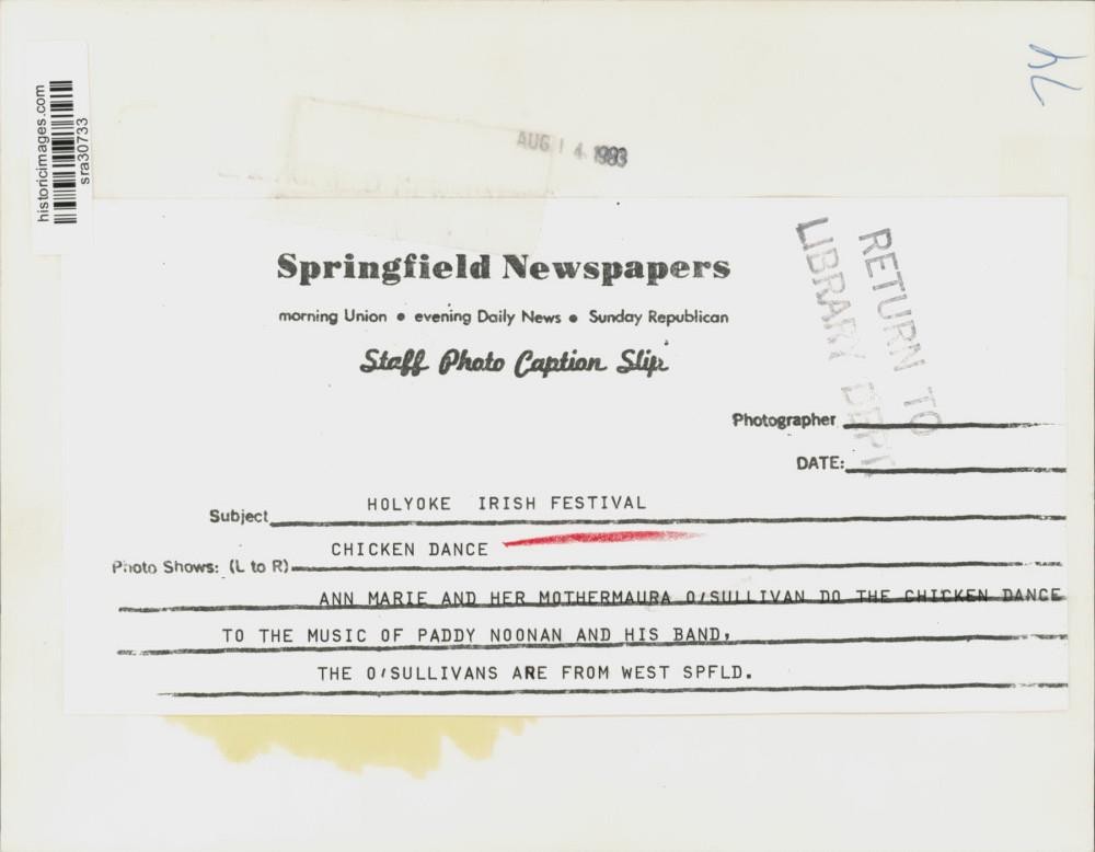 ebay template Note: Please study the images carefully to determine the condition of this vintage photograph, as it may not be in perfect condition. It may contain wrinkles, cracks, and possibly even tears due to its age and how it was handled before it got to us. A scanner may interpret colors and contrast differently than human eyes will, so it is possible that the actual photograph may be slightly darker or lighter in person. This vintage photograph is offered for sale as a collectible item and conveys no transfer of copyright. 1983 Press Photo Ann Marie and Maura O'Sullivan Dance at Holyoke Irish Festival This is an original press photo. Holyoke Irish Festival, Chicken Dance. Ann Marie and her mother Maura O'Sullivan do the chicken dance to the music of Paddy Noonan and his band, the O'Sullivans are from West Springfield.Photo measures 9 x 7inches. Photo is dated 08-14-1983. PHOTO FRONT PHOTO BACK Historic Images Part Number: sra30733 Sell Smarter with Kyozou. Inventory and Ecommerce Management