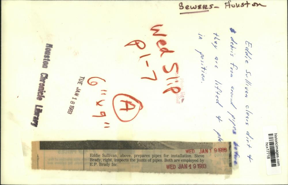 ebay template Note: Please study the images carefully to determine the condition of this vintage photograph, as it may not be in perfect condition. It may contain wrinkles, cracks, and possibly even tears due to its age and how it was handled before it got to us. A scanner may interpret colors and contrast differently than human eyes will, so it is possible that the actual photograph may be slightly darker or lighter in person. This vintage photograph is offered for sale as a collectible item and conveys no transfer of copyright. 1983 Press Photo Eddie Sullivan Prepares Pipe For Installation, Houston, Texas This is an original press photo. Eddie Sullivan, above, clears dirt and debris from around sewer pipes before they are lifted and placed in position in Houston, Texas. Eddie is employed by E.P. Brady, Incorporated.Photo measures 6.5 x 10.25inches. Photo is dated 01-18-1983. PHOTO FRONT PHOTO BACK Historic Images Part Number: hcx17718 Sell Smarter with Kyozou. Inventory and Ecommerce Management