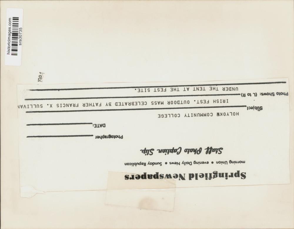 ebay template Note: Please study the images carefully to determine the condition of this vintage photograph, as it may not be in perfect condition. It may contain wrinkles, cracks, and possibly even tears due to its age and how it was handled before it got to us. A scanner may interpret colors and contrast differently than human eyes will, so it is possible that the actual photograph may be slightly darker or lighter in person. This vintage photograph is offered for sale as a collectible item and conveys no transfer of copyright. 1984 Press Photo Mass celebrated by Father Francis X. Sullivan, Holyoke Festival This is an original press photo. Holyoke Community College. Irish Festival outdoor mass celebrated by Father Francis X. Sullivan under the tent at the fest site.Photo measures 9 x 7inches. Photo is dated --1984. PHOTO FRONT PHOTO BACK Historic Images Part Number: sra30735 FAQs Q: Can I just download a digital version instead? A: No, we sell only vintage originals and do not make or distribute any copies, including digital ones. Q: Do you combine shipping and invoices? A: Multiple photos won on the same seller ID combine automatically through the eBay checkout process. If you encounter problems with this, send us a message via eBay messaging and we will send you an invoice. Due to eBay limitations, we cannot combine items won on our different seller IDs for a single shipping charge. Q: How quickly do you ship the items once paid? A: We ship within one business day after your payment clears. If you do not receive an "order shipped" email from us by the close of the second business day from submitting payment, please e-mail us via eBay messaging. Q: How do you make sure my photograph arrives safely? A: We package each order between two cross-corrugated pieces of cardboard to ensure that the package is as difficult to bend as possible. We then wrap each order in a plastic sheet to help protect against moisture. We want you to rest assured that we take every precaution to ensure that the photograph you receive will be in the same condition in your care as it was in ours. Q: Will the "Historic Images" watermark be on my photo when I receive it? A: No. This is a digital watermark we use to protect our images. It is not printed on the photo. Q: What are your office hours? A: eBay for us is a business, and a very fun one to be in! We are open M-F 9 to 5 (CST). Therefore, we do not return e-mails and phone calls over the weekend. We observe the following holidays: New Years Day, Memorial Day, Fourth of July, Labor Day, Thanksgiving and the day after Thanksgiving, Christmas Eve and Christmas Day. Q: Where did all these vintage photos come from? A: These original vintage photographs are from various news service and newspaper photo archives from locations around the country including: Boston, Detroit, Tampa, Chicago, Denver, Seattle, New Orleans, Milwaukee, Portland, Spokane, and more. We do not copy or reproduce any photographs -- every item is a unique vintage piece that was housed in a news archive. Q: Can I use this photograph in my book/blog/website? A: The short answer is no. There is no transfer of copyright for republication or reproduction with these photographs when you purchase them, and only photographs taken before 1923 are currently automatically in the public domain. Permission from the copyright holder, which usually can be identified from the back of each photo, must be sought to republish or reproduce the image for any purpose. Q: Do you relist items (in case I miss an auction ending)? A: Auction items that receive no bids are relisted in our store (historicimages-store on eBay) as a fixed-price item and at a higher price than the starting auction price. Q: Do you leave feedback? A: Yes, we always leave feedback for buyers. Our software monitors when our buyers leave us feedback, then notifies us that we can leave feedback for the buyer. Rest assured, if you leave feedback, we will do the same! Check out our family of eBay IDs: historicimages01 Sports Photos historicimages02 Entertainment Photos historicimages03 Americana Photos historicimages04 International & War Photos historicimages05 Transportation Photos historicimages06 Photos of All Subjects historicimages07 Entertainment Photos historicimages08 Newsworthy Photos historicimages09 Entertainment Photos historicimages10 Sports Photos historicimages-store Our largest fixed-price selection historicimages-gallery Hand-picked photos Saturday night auctions About Us Historic Images was formed in September 2009, with a handful of scanners working out of a basement to digitize newspaper photo archives. We have since moved out of the basement, and we can now archive thousands of photos per day. Our company has worked with magazines and newspapers from Detroit, Boston, Denver, Seattle, Tampa, Chicago, and New Orleans, just to name a few. We are constantly adding to our inventory, and have assembled an archive of millions of photos to date. As our company evolved, we began our eBay business, which brings thousands of fresh auctions per week to the world's largest online auction marketplace. Our custom software systems and team of great employees allow us to efficiently scan and sell large photo archives online. At the very core of our company's DNA is a strong commitment to customer satisfaction and strict integrity for our product. Our promise to you is that we will do everything in our power to provide you a great buying experience. Copyright 2009 - Present, Historic Images, Inc. Sell Smarter with Kyozou. Inventory and Ecommerce Management