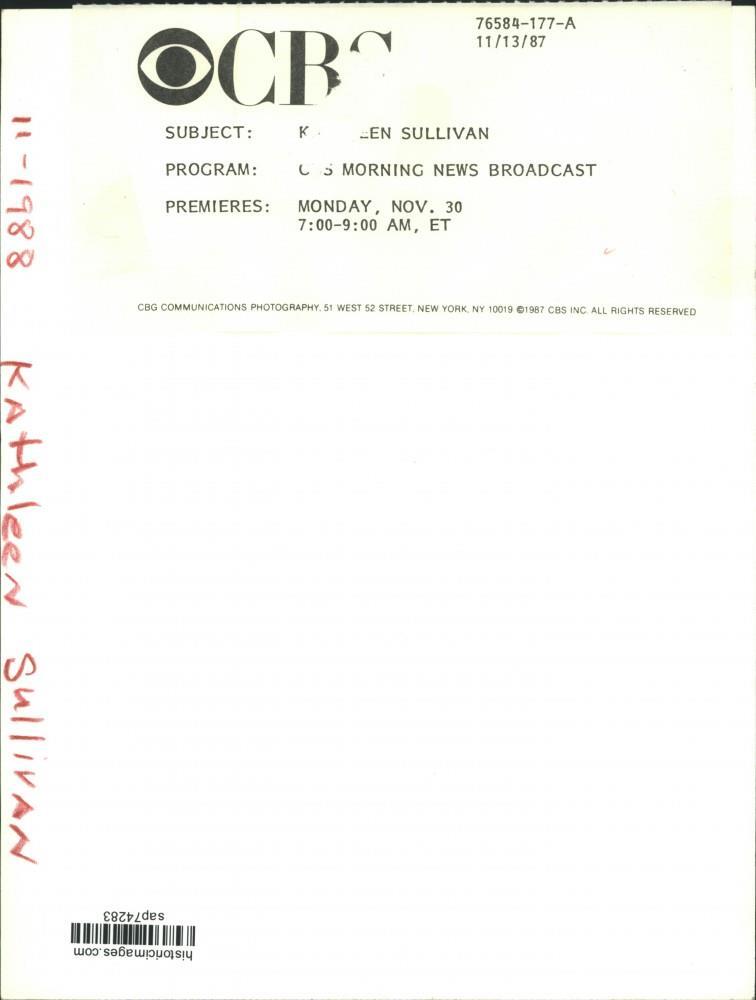 ebay template Note: Please study the images carefully to determine the condition of this vintage photograph, as it may not be in perfect condition. It may contain wrinkles, cracks, and possibly even tears due to its age and how it was handled before it got to us. A scanner may interpret colors and contrast differently than human eyes will, so it is possible that the actual photograph may be slightly darker or lighter in person. This vintage photograph is offered for sale as a collectible item and conveys no transfer of copyright. 1987 Press Photo Kathleen Sullivan of CBS Morning News Broadcast - sap74283 This is an original press photo. Kathleen Sullivan of CBS Morning News BroadcastPhoto measures 7 x 9.25inches. Photo is dated 11-13-1987. PHOTO FRONT PHOTO BACK Historic Images Part Number: sap74283 Sell Smarter with Kyozou. Inventory and Ecommerce Management