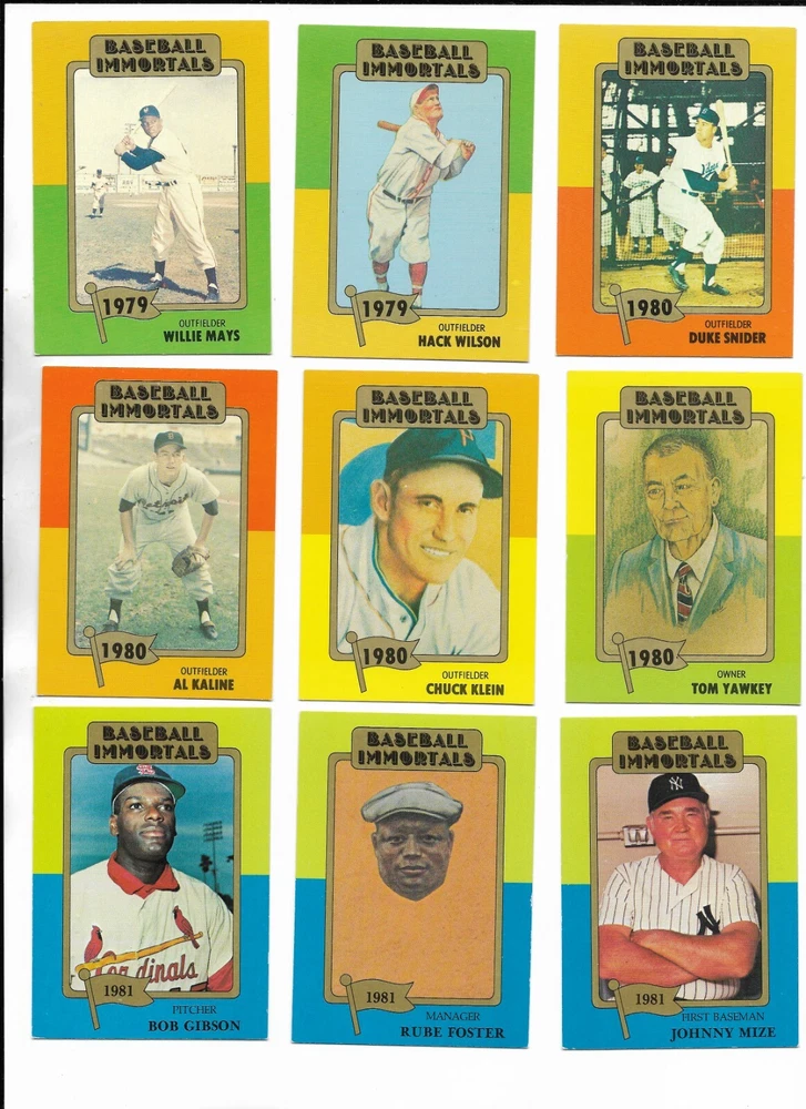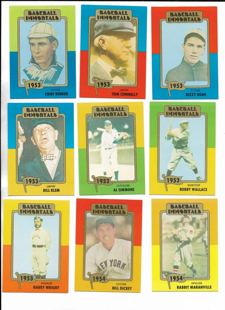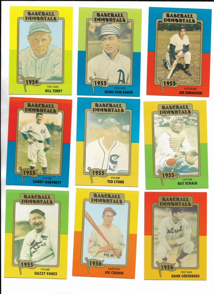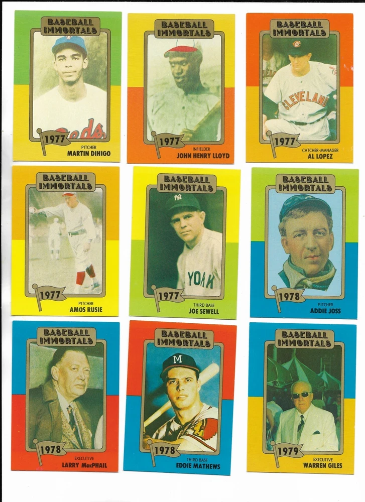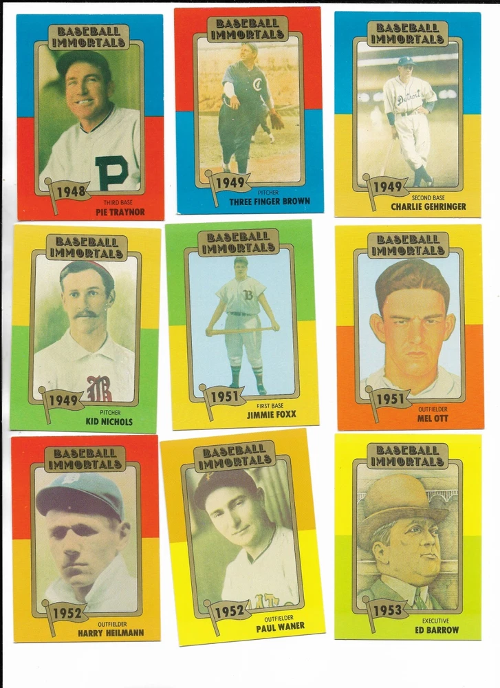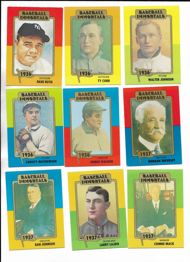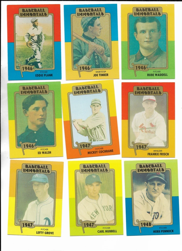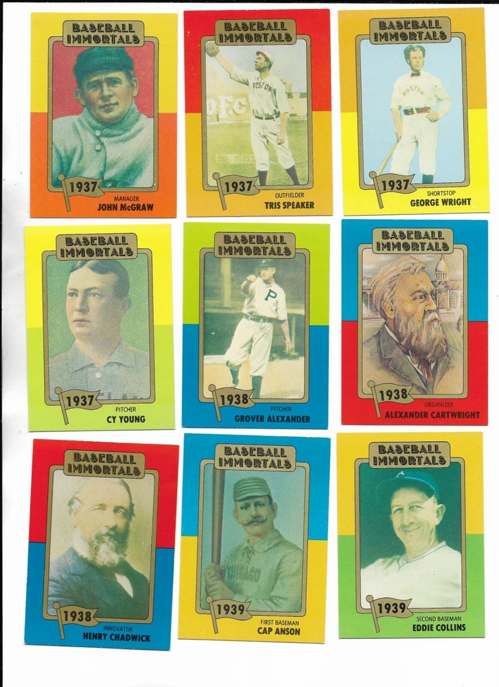 From 1980 - 1987 "BASEBALL IMMORTALS" by SSPC... "BASE CARDS" : Choose from the list of available cards While the scans are group photos, each card is offered separately; See the text description of each individual card available The highest number card I have from the first printing is 189. 190 - 199 do not have 1st printing markings Some cards are not marked 1st printing - check with me if you only want 1st printing markings Overall cards are EXMT - but some are NM or better From 1980 through 1987 SSPC issued a set commemorating each inductee to the BASEBALL HALL OF FAME . Each card shows the inductee and the year of induction The first 10,000 sets indicate first printing of the set (some cards in this listing are from the first printing, but not all) See the details for discounts on combined shipping lnternational Bidders please contact for shipping costs See details for savings on combined purchases THanks for visiting my listings - LVRipken