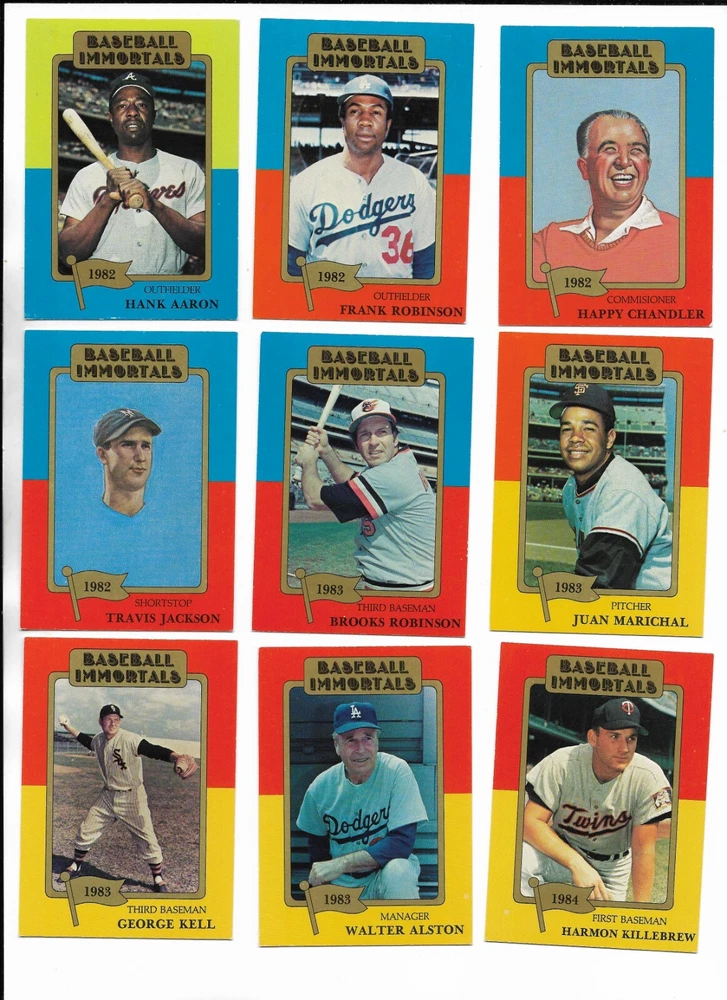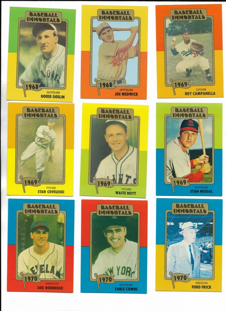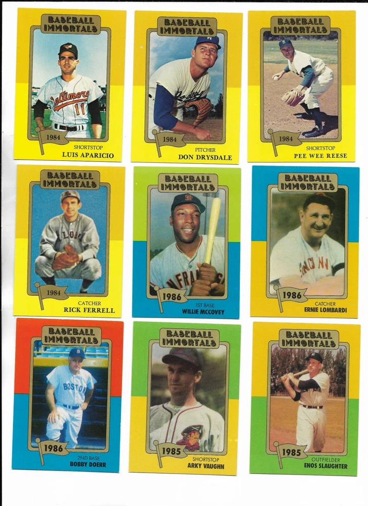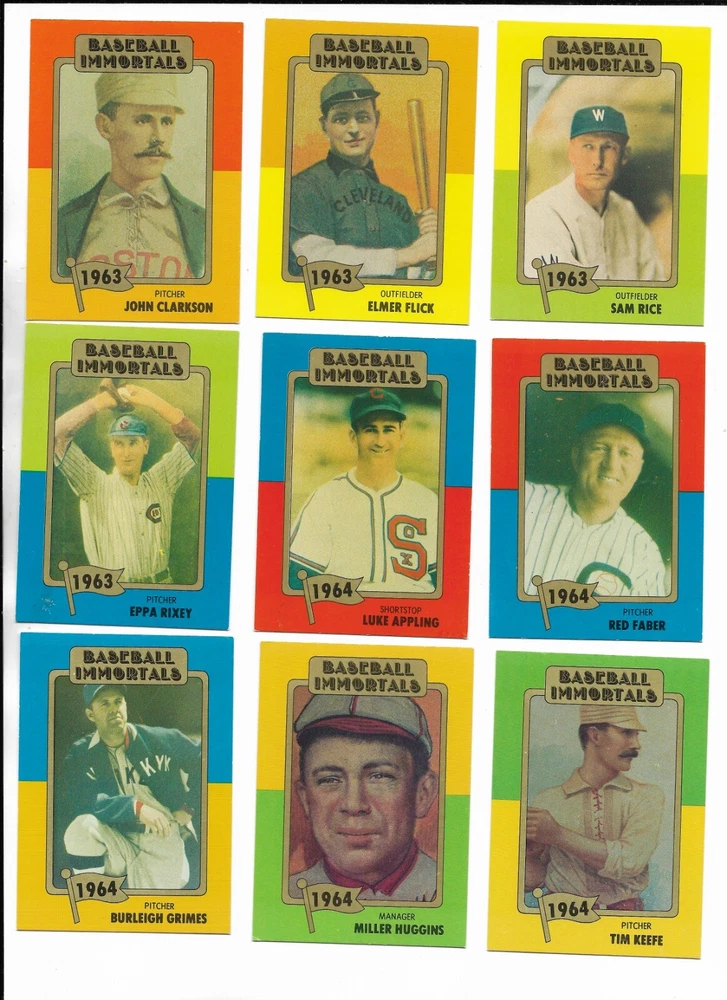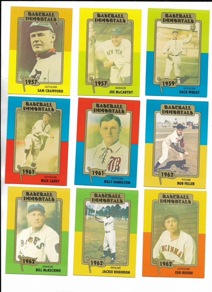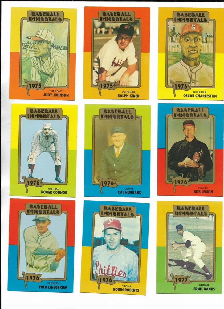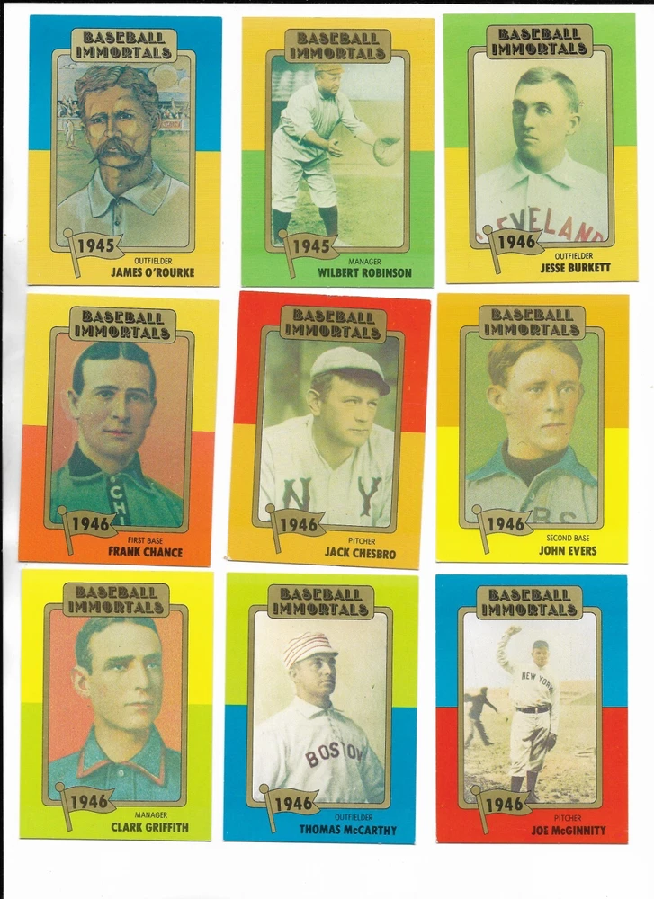 From 1980 - 1987 "BASEBALL IMMORTALS" by SSPC... "BASE CARDS" : Choose from the list of available cards While the scans are group photos, each card is offered separately; See the text description of each individual card available The highest number card I have from the first printing is 189. 190 - 199 do not have 1st printing markings Some cards are not marked 1st printing - check with me if you only want 1st printing markings Overall cards are EXMT - but some are NM or better From 1980 through 1987 SSPC issued a set commemorating each inductee to the BASEBALL HALL OF FAME . Each card shows the inductee and the year of induction The first 10,000 sets indicate first printing of the set (some cards in this listing are from the first printing, but not all) See the details for discounts on combined shipping lnternational Bidders please contact for shipping costs See details for savings on combined purchases THanks for visiting my listings - LVRipken