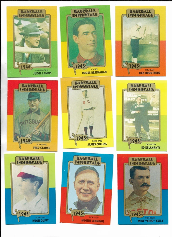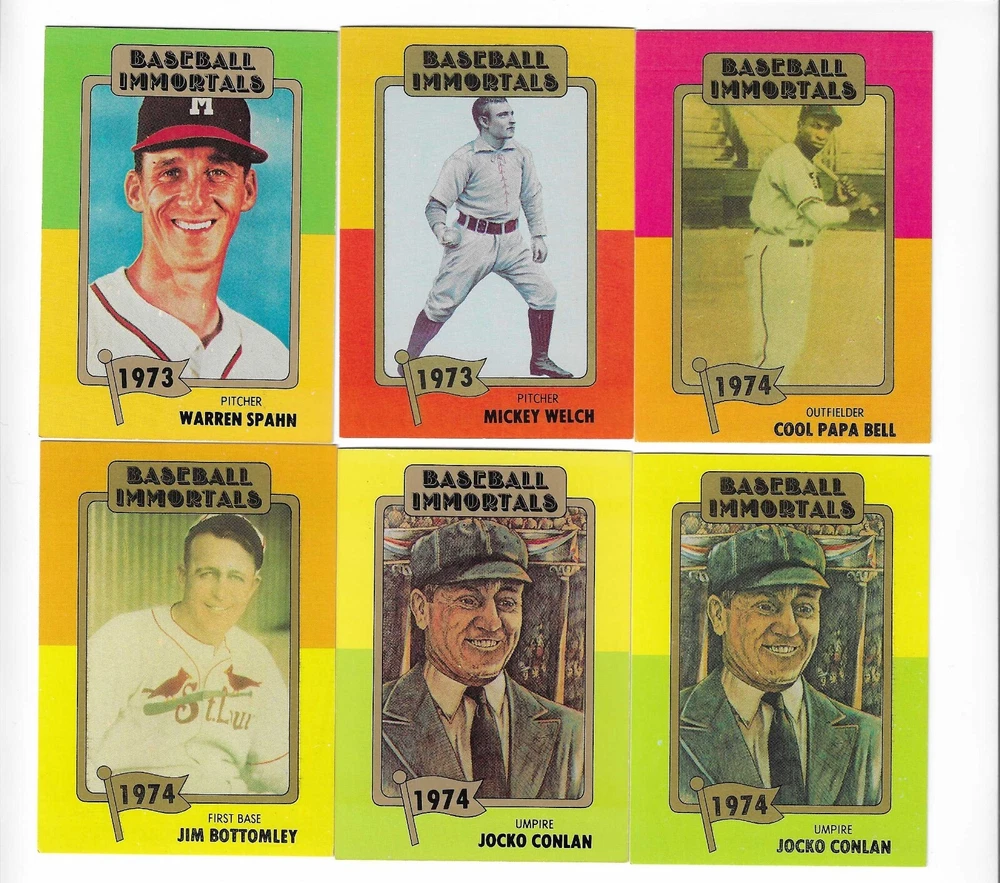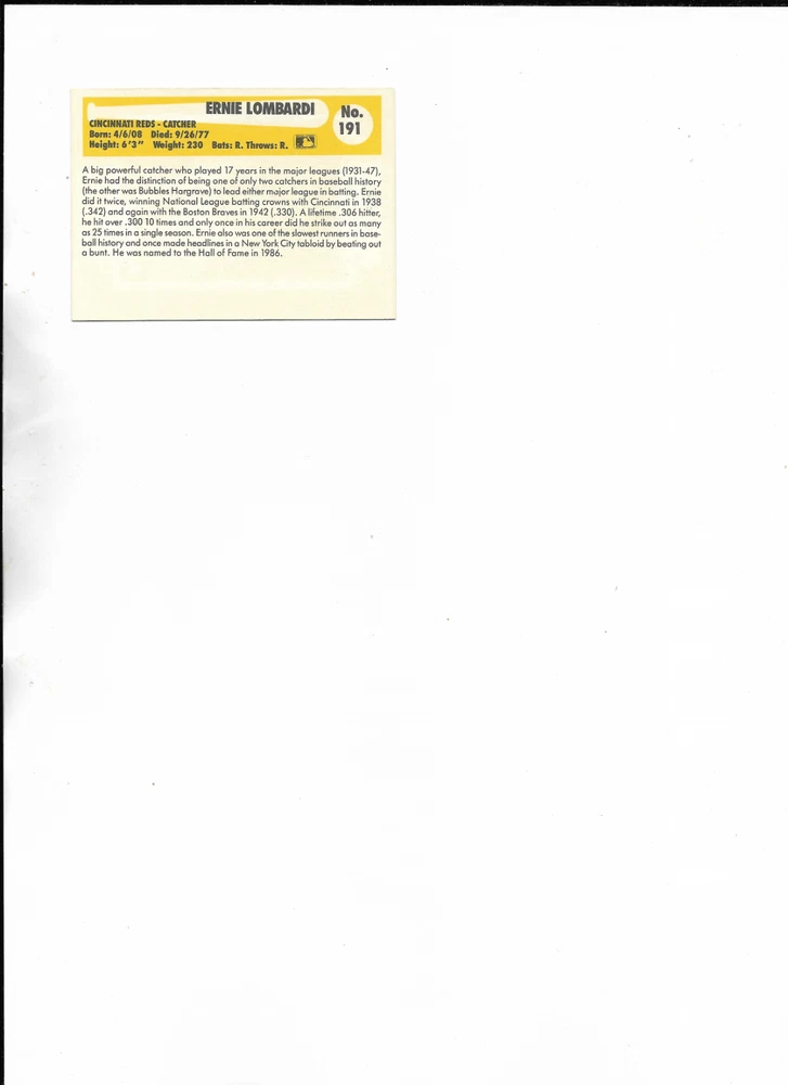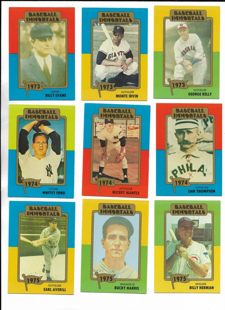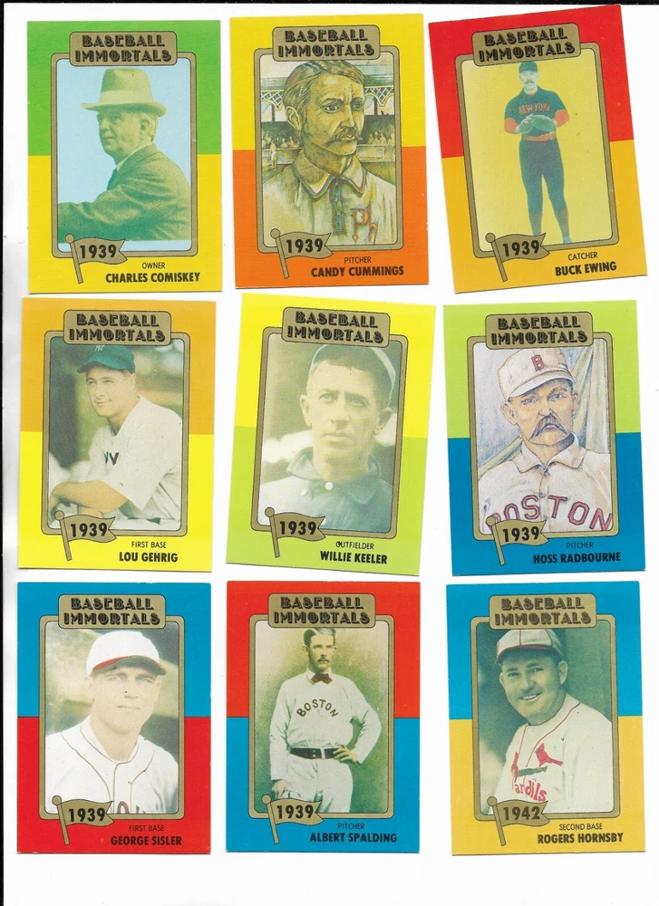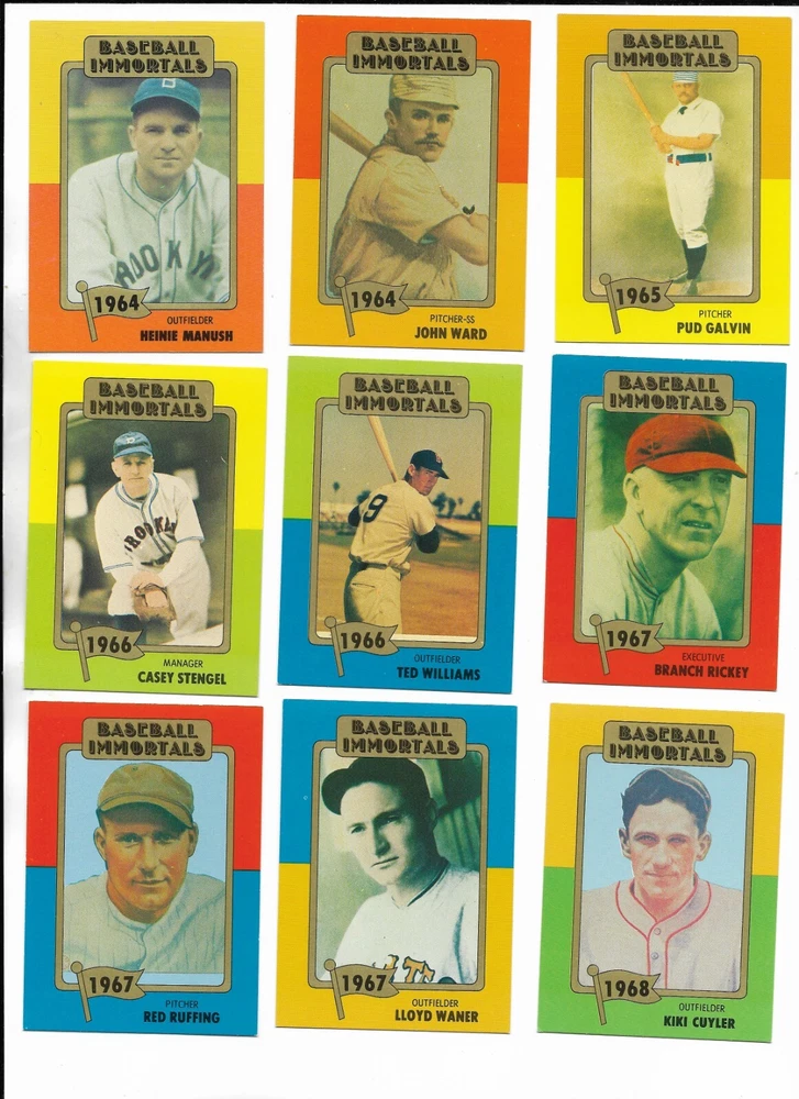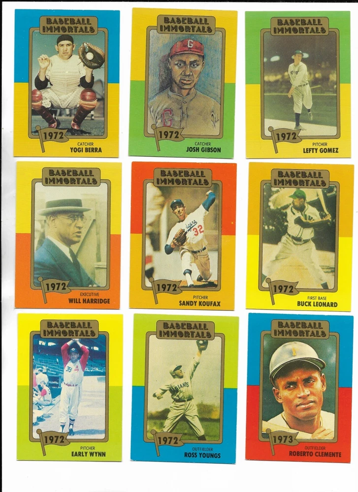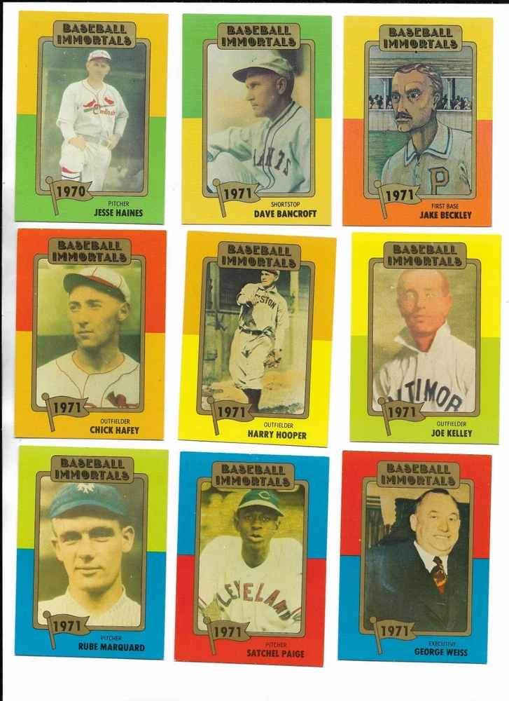 From 1980 - 1987 "BASEBALL IMMORTALS" by SSPC... "BASE CARDS" : Choose from the list of available cards While the scans are group photos, each card is offered separately; See the text description of each individual card available The highest number card I have from the first printing is 189. 190 - 199 do not have 1st printing markings Some cards are not marked 1st printing - check with me if you only want 1st printing markings Overall cards are EXMT - but some are NM or better From 1980 through 1987 SSPC issued a set commemorating each inductee to the BASEBALL HALL OF FAME . Each card shows the inductee and the year of induction The first 10,000 sets indicate first printing of the set (some cards in this listing are from the first printing, but not all) See the details for discounts on combined shipping lnternational Bidders please contact for shipping costs See details for savings on combined purchases THanks for visiting my listings - LVRipken