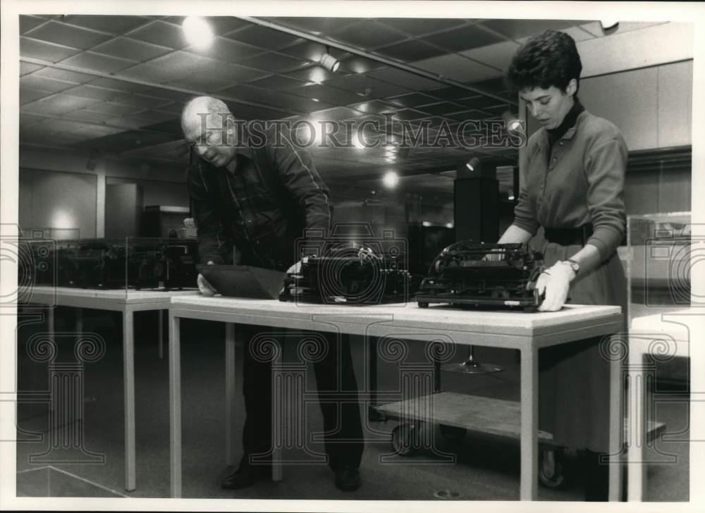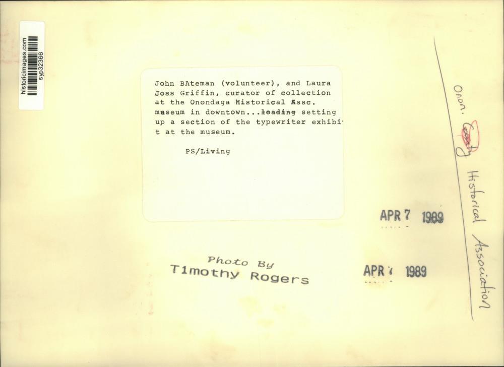 ebay template Note: Please study the images carefully to determine the condition of this vintage photograph, as it may not be in perfect condition. It may contain wrinkles, cracks, and possibly even tears due to its age and how it was handled before it got to us. A scanner may interpret colors and contrast differently than human eyes will, so it is possible that the actual photograph may be slightly darker or lighter in person. This vintage photograph is offered for sale as a collectible item and conveys no transfer of copyright. 1989 Press Photo John Bateman, Laura Joss Griffin Setting Up Museum Exhibit This is an original press photo. John Bateman (volunteer), and Laura Joss Griffin, Curator of Collection at the Onondaga Historical Association Museum in downtown Syracuse, New York, setting up a section of the typewriter exhibit at the museum.Photo measures 10 x 7.25inches. Photo is dated 04-07-1989. PHOTO FRONT PHOTO BACK Historic Images Part Number: syp32366 FAQs Q: Can I just download a digital version instead? A: No, we sell only vintage originals and do not make or distribute any copies, including digital ones. Q: Do you combine shipping and invoices? A: Multiple photos won on the same seller ID combine automatically through the eBay checkout process. If you encounter problems with this, send us a message via eBay messaging and we will send you an invoice. Due to eBay limitations, we cannot combine items won on our different seller IDs for a single shipping charge. Q: How quickly do you ship the items once paid? A: We ship within one business day after your payment clears. If you do not receive an "order shipped" email from us by the close of the second business day from submitting payment, please e-mail us via eBay messaging. Q: How do you make sure my photograph arrives safely? A: We package each order between two cross-corrugated pieces of cardboard to ensure that the package is as difficult to bend as possible. We then wrap each order in a plastic sheet to help protect against moisture. We want you to rest assured that we take every precaution to ensure that the photograph you receive will be in the same condition in your care as it was in ours. Q: Will the "Historic Images" watermark be on my photo when I receive it? A: No. This is a digital watermark we use to protect our images. It is not printed on the photo. Q: What are your office hours? A: eBay for us is a business, and a very fun one to be in! We are open M-F 9 to 5 (CST). Therefore, we do not return e-mails and phone calls over the weekend. We observe the following holidays: New Years Day, Memorial Day, Fourth of July, Labor Day, Thanksgiving and the day after Thanksgiving, Christmas Eve and Christmas Day. Q: Where did all these vintage photos come from? A: These original vintage photographs are from various news service and newspaper photo archives from locations around the country including: Boston, Detroit, Tampa, Chicago, Denver, Seattle, New Orleans, Milwaukee, Portland, Spokane, and more. We do not copy or reproduce any photographs -- every item is a unique vintage piece that was housed in a news archive. Q: Can I use this photograph in my book/blog/website? A: The short answer is no. There is no transfer of copyright for republication or reproduction with these photographs when you purchase them, and only photographs taken before 1923 are currently automatically in the public domain. Permission from the copyright holder, which usually can be identified from the back of each photo, must be sought to republish or reproduce the image for any purpose. Q: Do you relist items (in case I miss an auction ending)? A: Auction items that receive no bids are relisted in our store (historicimages-store on eBay) as a fixed-price item and at a higher price than the starting auction price. Q: Do you leave feedback? A: Yes, we always leave feedback for buyers. Our software monitors when our buyers leave us feedback, then notifies us that we can leave feedback for the buyer. Rest assured, if you leave feedback, we will do the same! Check out our family of eBay IDs: historicimages01 Sports Photos historicimages02 Entertainment Photos historicimages03 Americana Photos historicimages04 International & War Photos historicimages05 Transportation Photos historicimages06 Photos of All Subjects historicimages07 Entertainment Photos historicimages08 Newsworthy Photos historicimages09 Entertainment Photos historicimages10 Sports Photos historicimages-store Our largest fixed-price selection historicimages-gallery Hand-picked photos Saturday night auctions About Us Historic Images was formed in September 2009, with a handful of scanners working out of a basement to digitize newspaper photo archives. We have since moved out of the basement, and we can now archive thousands of photos per day. Our company has worked with magazines and newspapers from Detroit, Boston, Denver, Seattle, Tampa, Chicago, and New Orleans, just to name a few. We are constantly adding to our inventory, and have assembled an archive of millions of photos to date. As our company evolved, we began our eBay business, which brings thousands of fresh auctions per week to the world's largest online auction marketplace. Our custom software systems and team of great employees allow us to efficiently scan and sell large photo archives online. At the very core of our company's DNA is a strong commitment to customer satisfaction and strict integrity for our product. Our promise to you is that we will do everything in our power to provide you a great buying experience. Copyright 2009 - Present, Historic Images, Inc. Sell Smarter with Kyozou. Inventory and Ecommerce Management