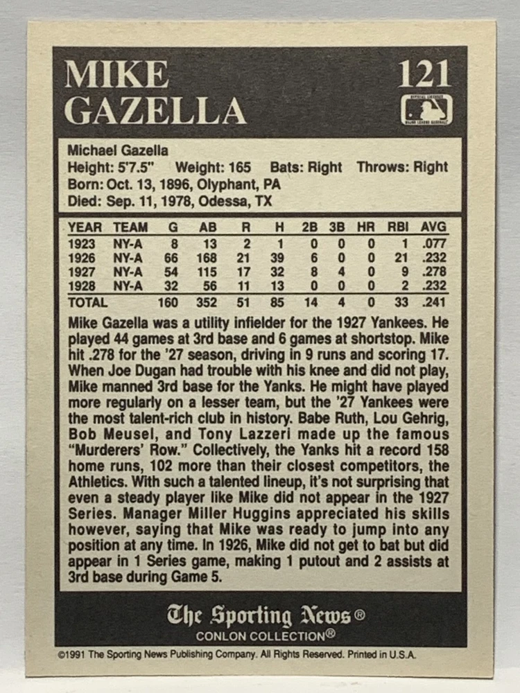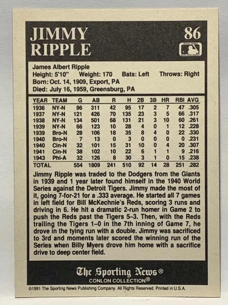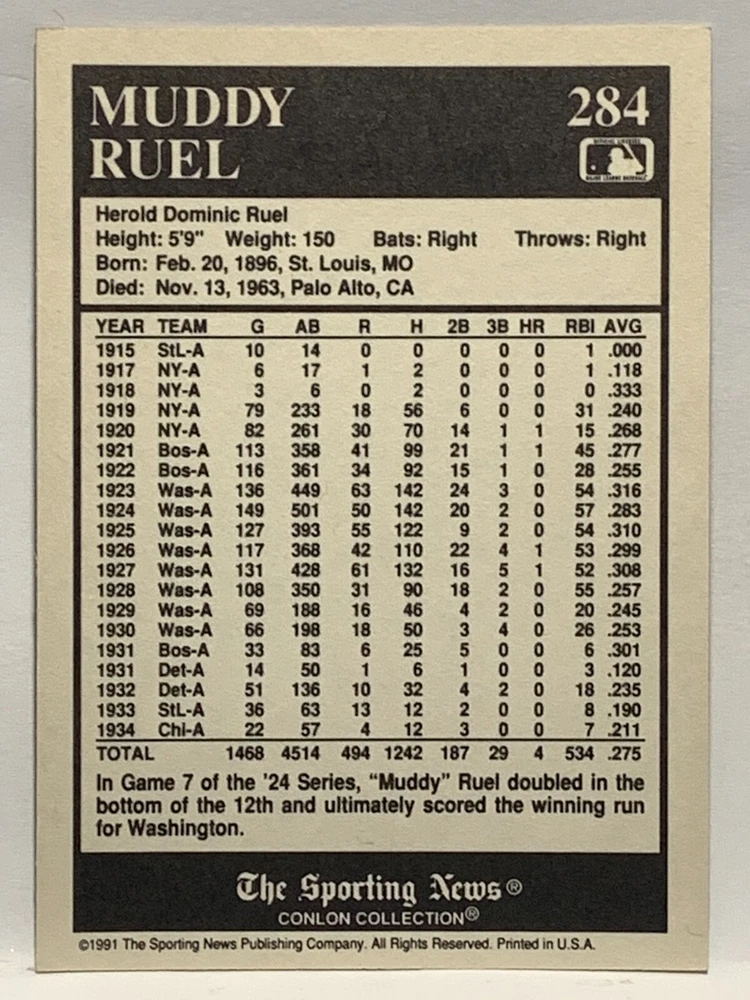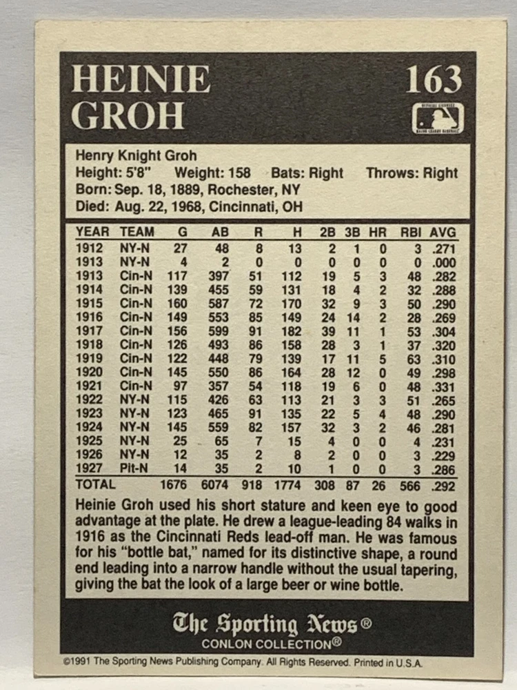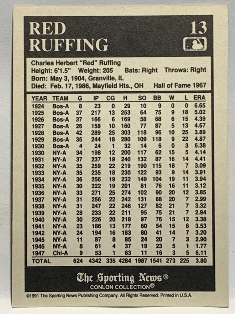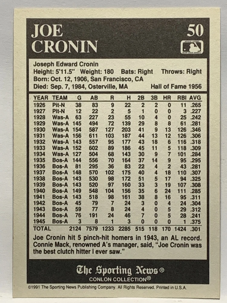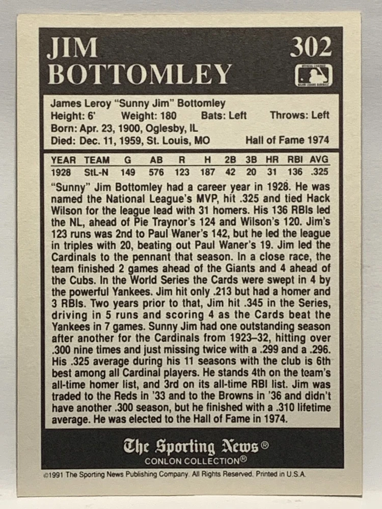 The 1991 Sporting News - Conlon Collection Baseball trading card set features cards numbered 1-325, with notable players like Babe Ruth, Honus Wagner, and Hank Greenberg from Major League Baseball. This collectors' edition set includes a checklist and is considered near mint or better in condition. Manufactured by The Sporting News, this set is a valuable addition to any baseball card collection, with cards representing various teams such as the New York Yankees, New York Giants, and St. Louis Cardinals for the 2022 season.