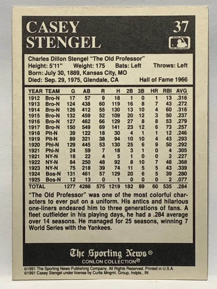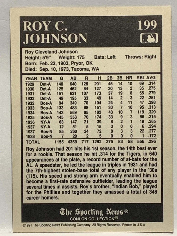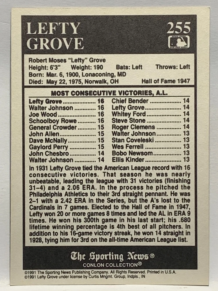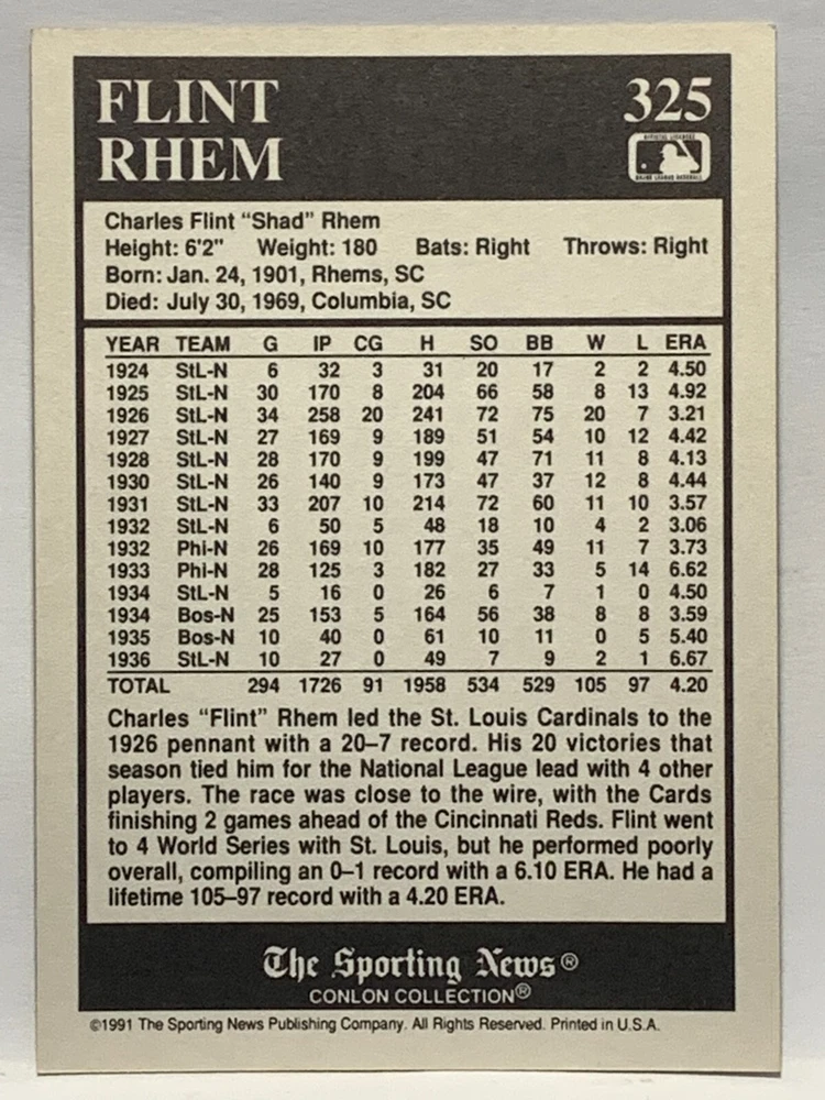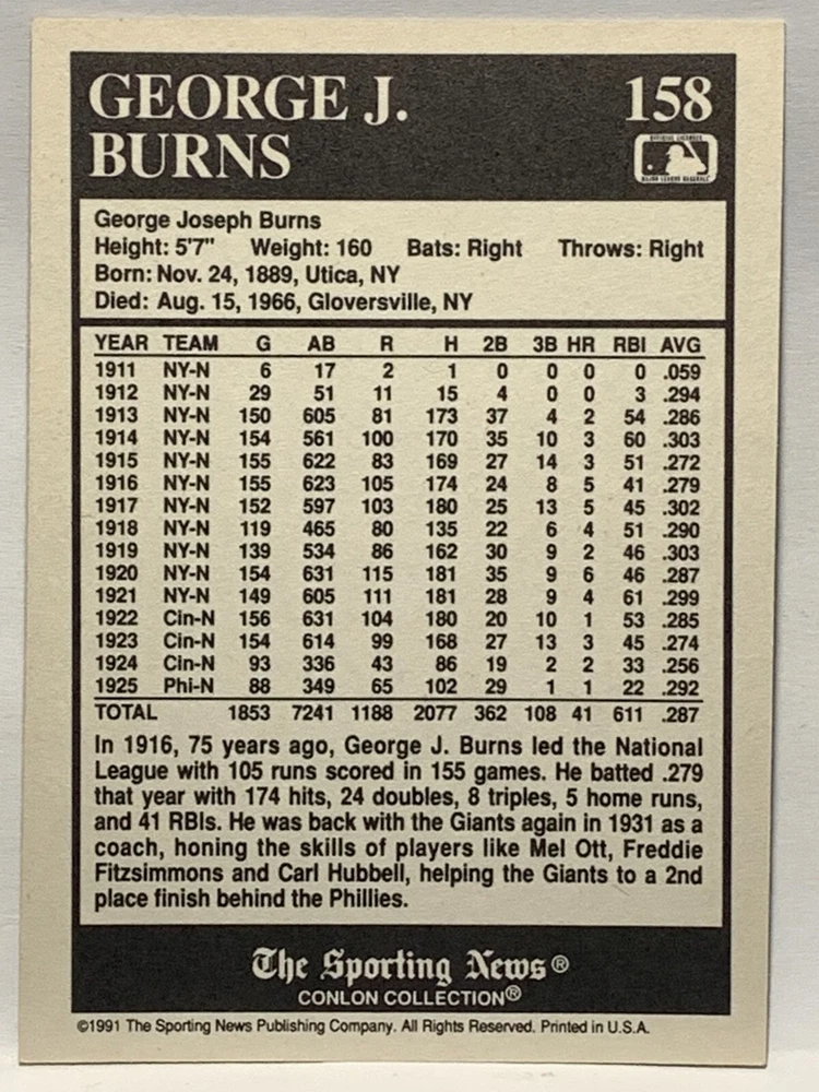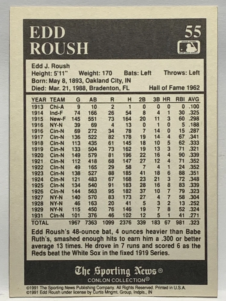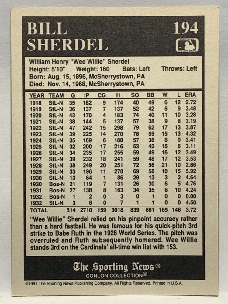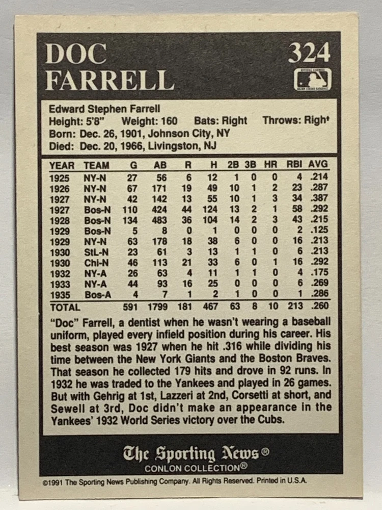 The 1991 Sporting News - Conlon Collection Baseball trading card set features cards numbered 1-325, with notable players like Babe Ruth, Honus Wagner, and Hank Greenberg from Major League Baseball. This collectors' edition set includes a checklist and is considered near mint or better in condition. Manufactured by The Sporting News, this set is a valuable addition to any baseball card collection, with cards representing various teams such as the New York Yankees, New York Giants, and St. Louis Cardinals for the 2022 season.