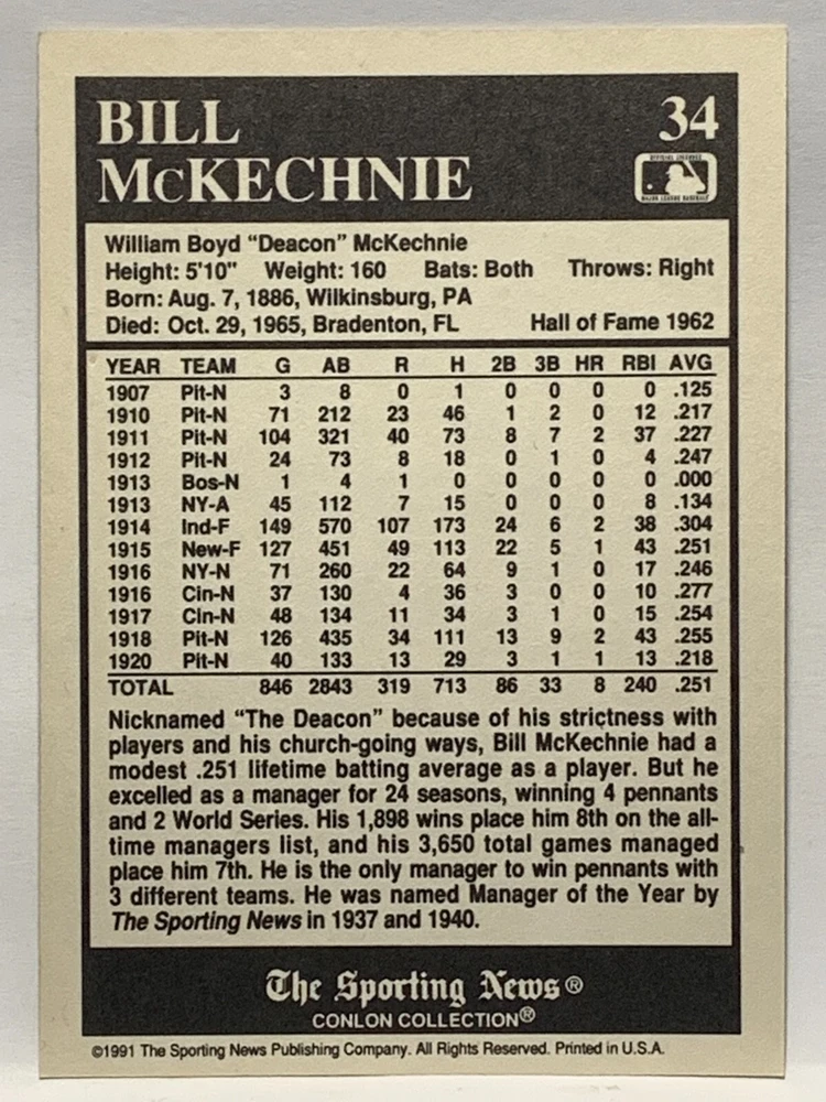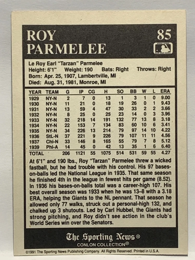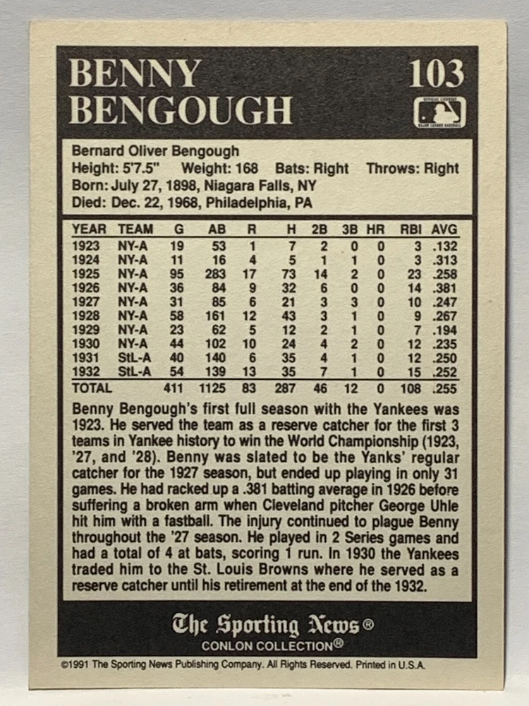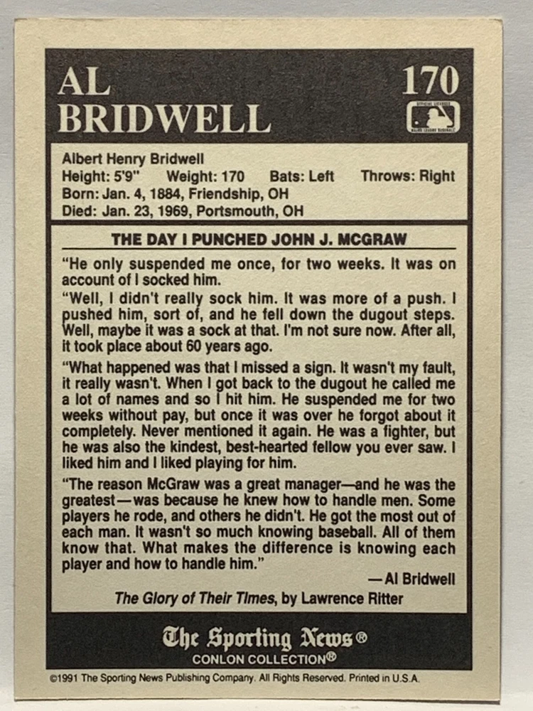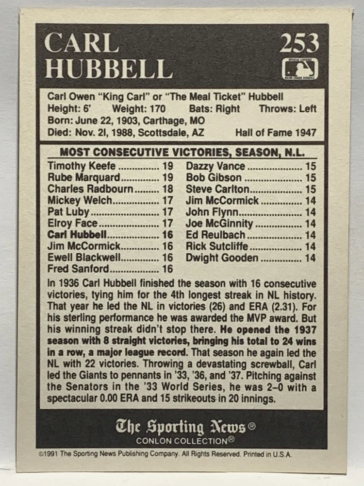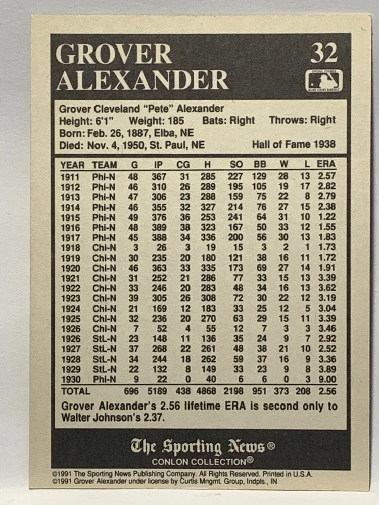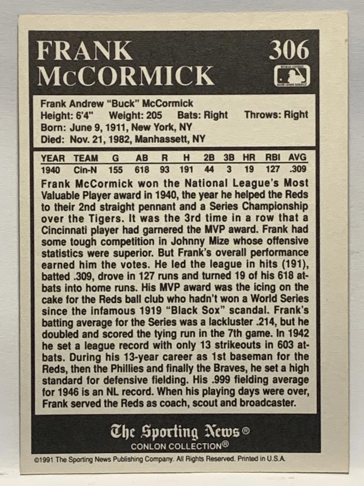The 1991 Sporting News - Conlon Collection Baseball trading card set features cards numbered 1-325, with notable players like Babe Ruth, Honus Wagner, and Hank Greenberg from Major League Baseball. This collectors' edition set includes a checklist and is considered near mint or better in condition. Manufactured by The Sporting News, this set is a valuable addition to any baseball card collection, with cards representing various teams such as the New York Yankees, New York Giants, and St. Louis Cardinals for the 2022 season.