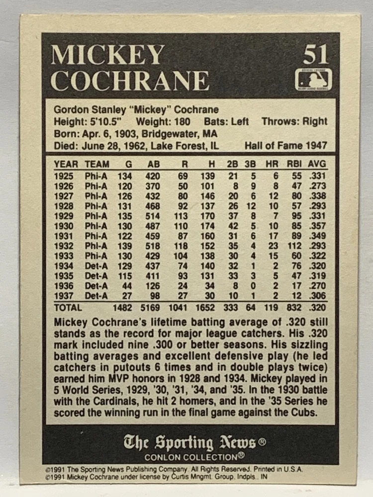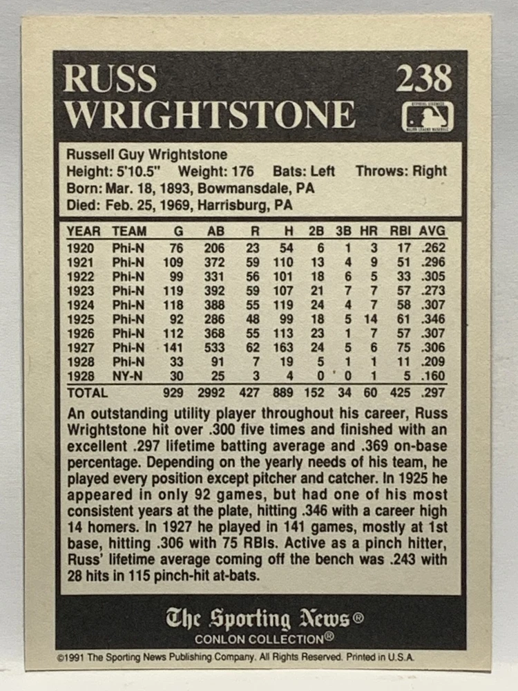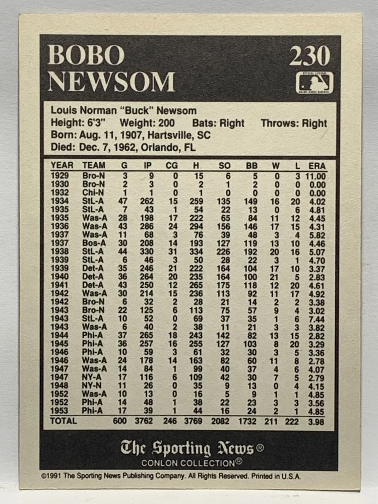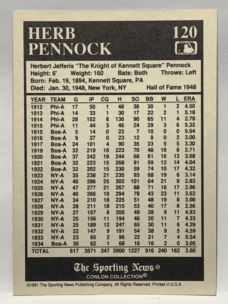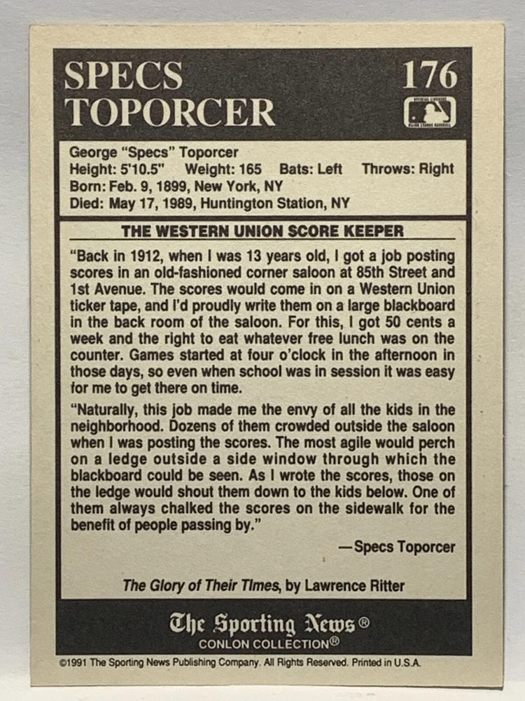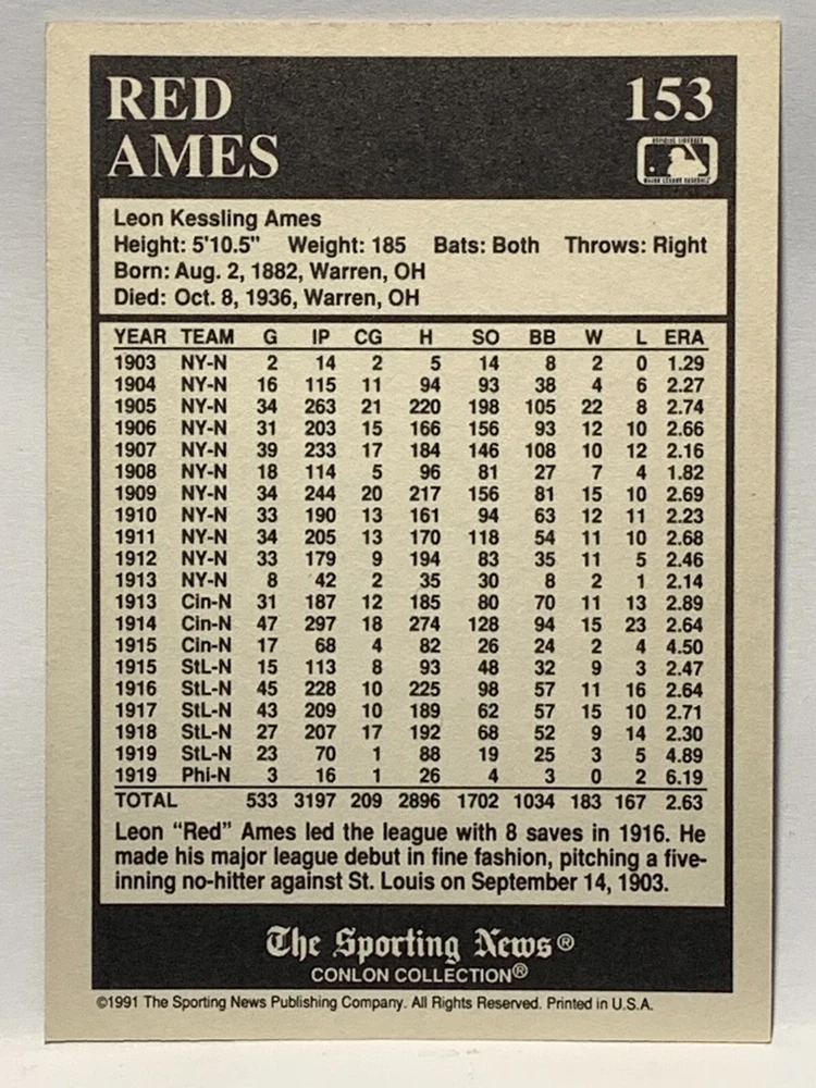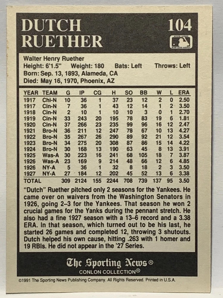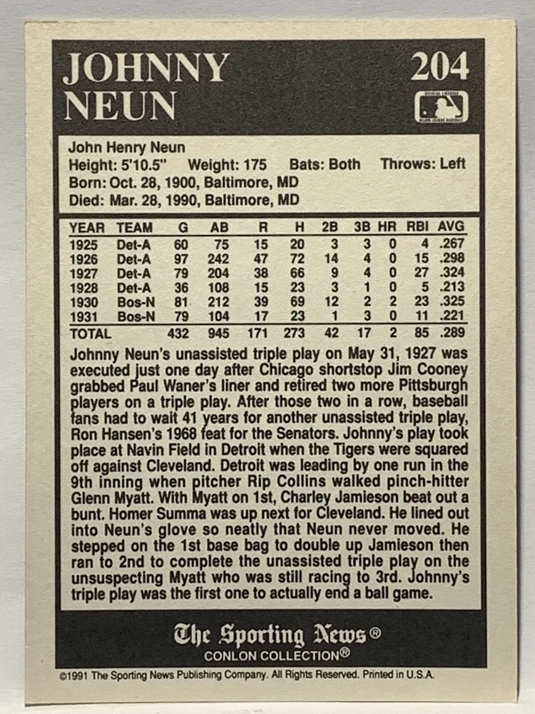 The 1991 Sporting News - Conlon Collection Baseball trading card set features cards numbered 1-325, with notable players like Babe Ruth, Honus Wagner, and Hank Greenberg from Major League Baseball. This collectors' edition set includes a checklist and is considered near mint or better in condition. Manufactured by The Sporting News, this set is a valuable addition to any baseball card collection, with cards representing various teams such as the New York Yankees, New York Giants, and St. Louis Cardinals for the 2022 season.