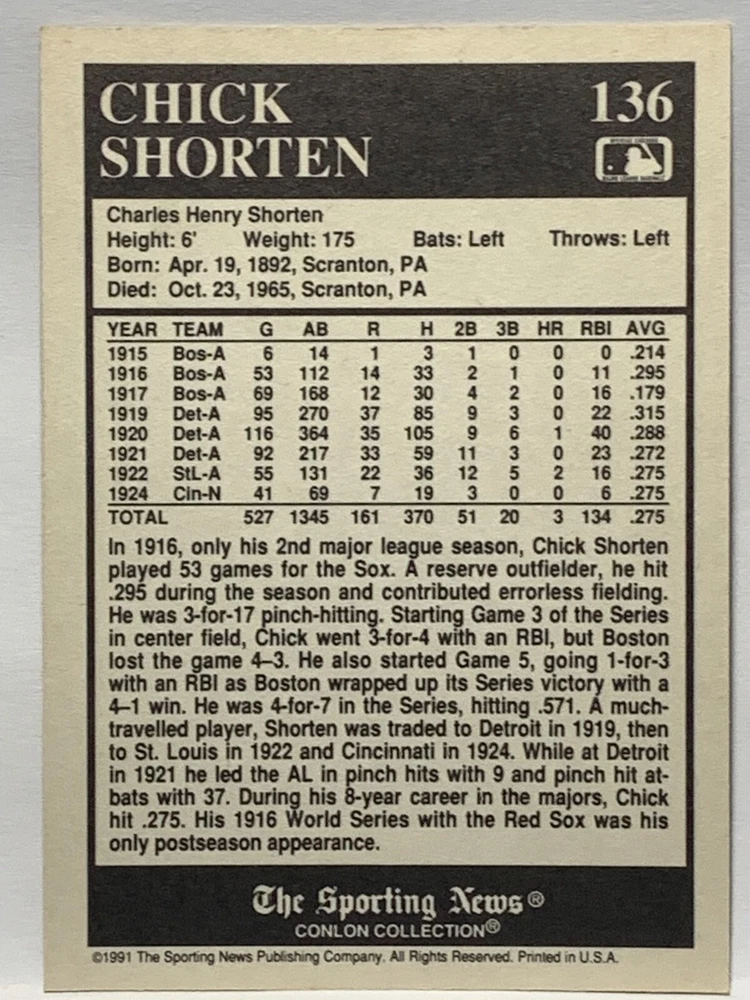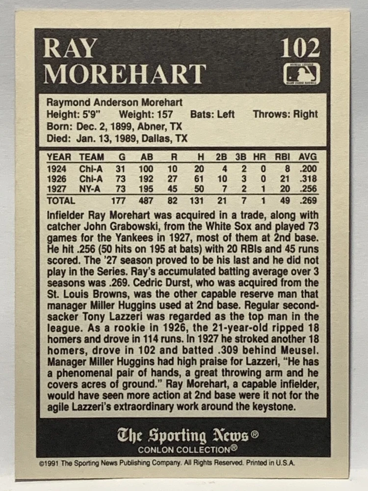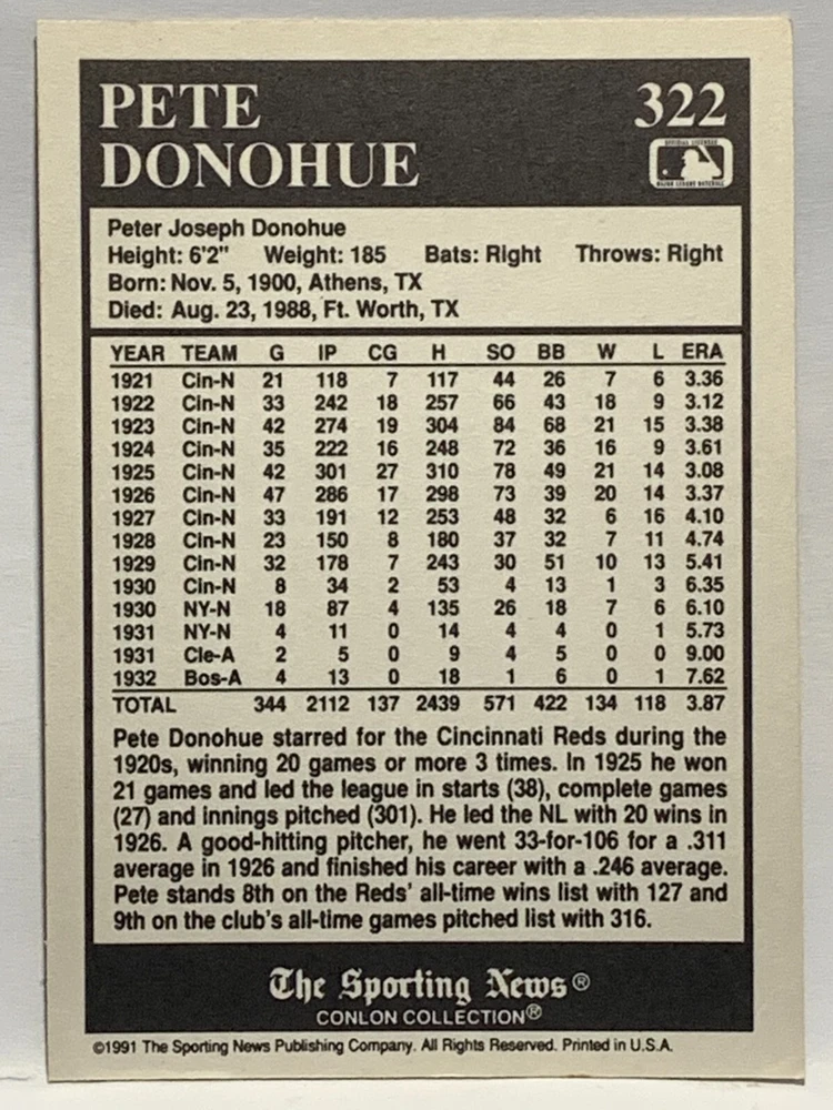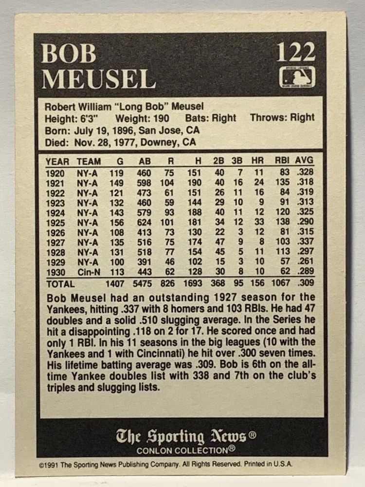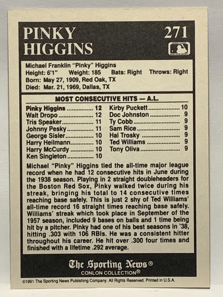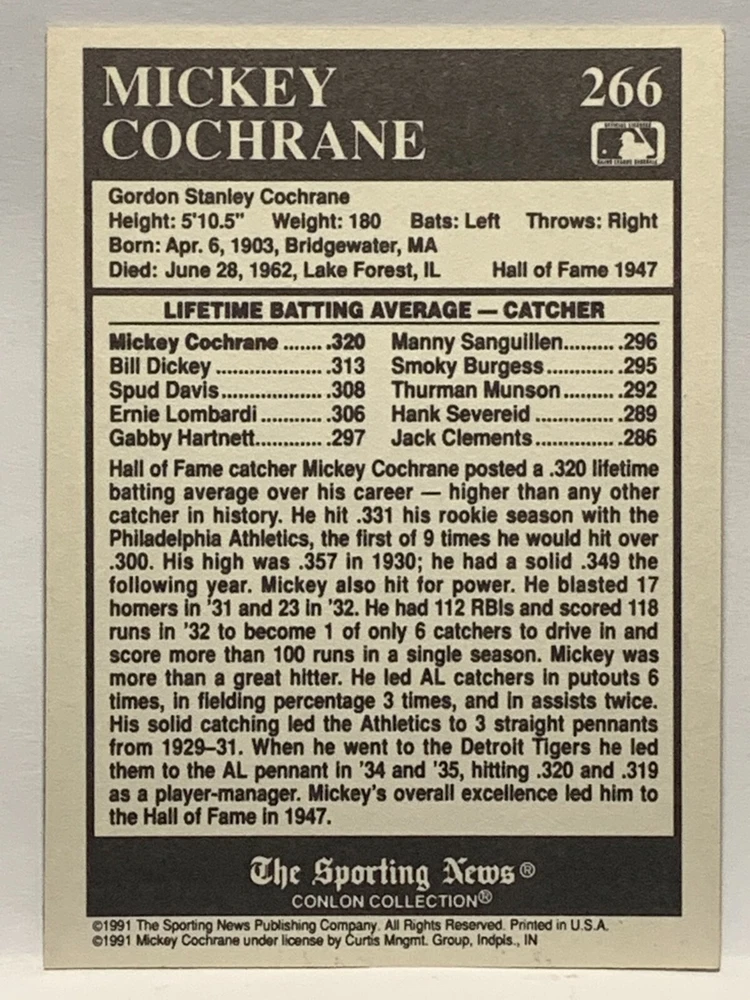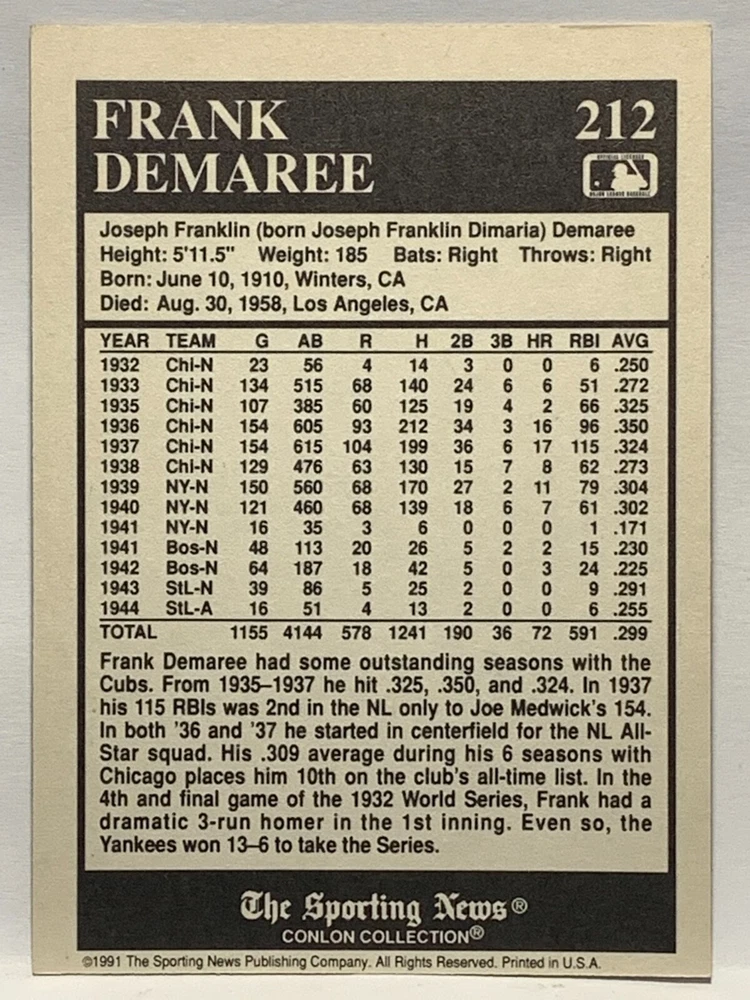 The 1991 Sporting News - Conlon Collection Baseball trading card set features cards numbered 1-325, with notable players like Babe Ruth, Honus Wagner, and Hank Greenberg from Major League Baseball. This collectors' edition set includes a checklist and is considered near mint or better in condition. Manufactured by The Sporting News, this set is a valuable addition to any baseball card collection, with cards representing various teams such as the New York Yankees, New York Giants, and St. Louis Cardinals for the 2022 season.