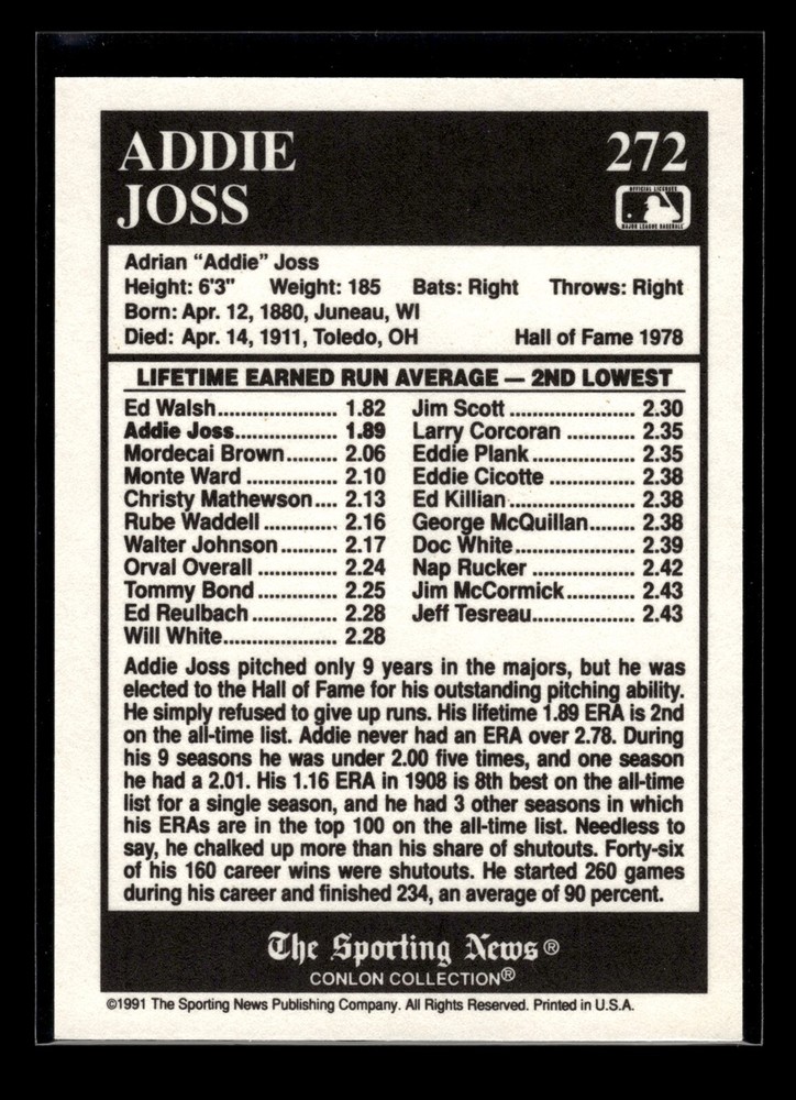 This baseball card featuring Addie Joss is a fantastic piece for any collector. The Near Mint condition ensures great quality, and the price is a steal for such a vintage gem from the 1991 Conlon Collection. Perfect for baseball memorabilia fans looking to add classic players to their sets.