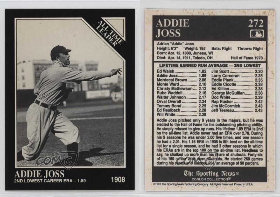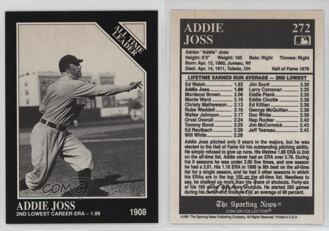 1991 The Sporting News Conlon Collection - [Base] #272 All Time Leader - Addie Joss - Rookie - Baseball Card - Featuring the Cleveland Indians - Featuring Addie Joss Search for more: 1991 The Sporting News Conlon Collection Search for more: 1991 The Sporting News Conlon Collection - [Base] View all of our Listings Auctions Buy It Now About Us Located in the beautiful Pacific Northwest, COMC (Check Out My Cards) is the world's largest consignment service for trading card singles. More than 10,000 people have used our consignment service to list over 50 million trading cards. Find out how we can help you consign your items on eBay by contacting us through eBay messaging. COMC -- "The Safe & Easy Way to Buy & Sell" Representative Image - Select Specific Item above to see image of actual item Representative Image - Select Specific Item above to see image of actual item Raw Condition for Modern Cards Unless otherwise noted, raw modern cards are listed in Near Mint-Mint condition or better. A NM-MT card appears to be Mint at first glance, but upon closer inspection, may exhibit some of the following: minor print defects (e.g. roller marks, print line, dimple), minor scratches, slight edge wear, and slight corner wear. Centering is clearly visible in the images provided and does not factor into our condition assessment. Raw Condition for Vintage Cards Unless otherwise noted, raw vintage cards are listed in Excellent condition or better. An EX card may exhibit some of the following: minor rounding of corners, surface wear, print defects, light scratches, and slight edge wear/chipping. Centering is clearly visible in the images provided and does not factor into our condition assessment. Domestic Shipping Combined shipping for multiple items is available. To receive combined shipping, please ensure all desired items are in your eBay shopping cart before proceeding to checkout. eBay limits orders to 40 items per order. We automatically combine multiple orders placed on the same day. If you place multiple orders on the same day, please contact us to request a refund of applicable shipping costs. Signature confirmation may be required on invoices over $400. All cards are protected and shipped securely. International Shipping COMC offers eBay's International Shipping (EIS) for international orders under $2,500* (see country exceptions below). All duties and import fees are paid at checkout; in the rare event that there are additional import fees upon delivery, these are borne by the buyer. EIS packages route through a shipping hub in Erlanger, KY before shipping to their final destination. Please note that EIS does not allow for combined shipments. The shipping rates are determined by eBay and cannot be adjusted. *Maximum sale price exceptions: Colombia, Kuwait ($2,000); Taiwan ($1,539); Chile, Costa Rica, Guatemala, Honduras, Trinidad and Tobago ($1,000); Antigua and Barbuda, Aruba, Belize, Dominica, Grenada, Philippines, Saint Kitts and Nevis, Saint Lucia, Montserrat, Turks and Caicos Islands ($500); Dominican Republic, El Salvador ($200). Please request a shipping quote through eBay messaging for orders that exceed the maximum sale price supported by eBay's International Shipping. You will be responsible for all duties and import fees for international orders shipped outside the EIS. All cards are protected and shipped securely. Payment COMC does not accept offers on our cards through our eBay storefront. COMC utilizes eBay’s managed payments system. If you are experiencing difficulties making a payment, please contact eBay for assistance. Return Policy Returns are only accepted on the rare occasion the item is not as described. If you are making a return, please initiate the return process through eBay so a mailing label can be provided for you. Prior to listing, our expert team carefully assessed this item to represent it accurately. Please review the description and high-definition images prior to purchasing to ensure this item meets your satisfaction. We welcome you to contact us if you have further questions about this item. Trust and Integrity COMC carefully assesses each item consigned to us to prevent fraudulent items from entering the marketplace. If you believe an item offered on COMC may be fraudulent, please contact us with details so we can investigate the issue. Items we determine are outside our supported items policy may be removed. Last Modified: 4/18/2025 1:27:56 PM PDT
