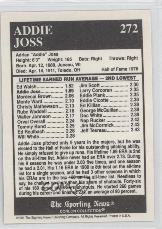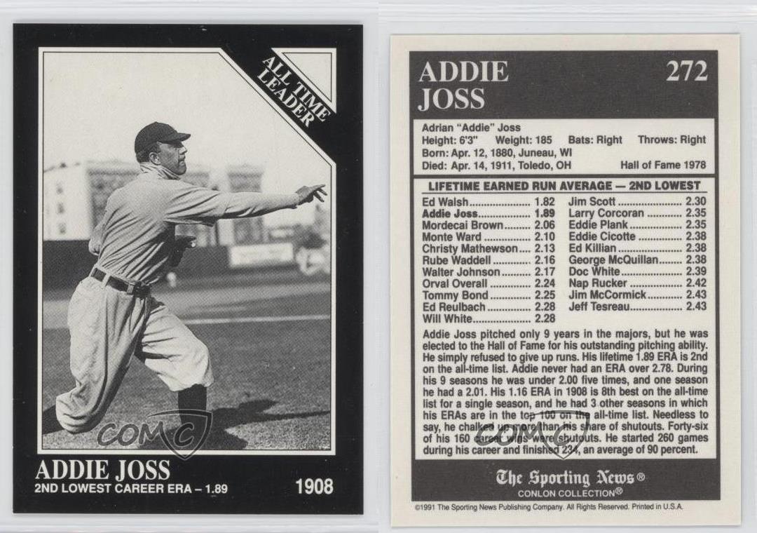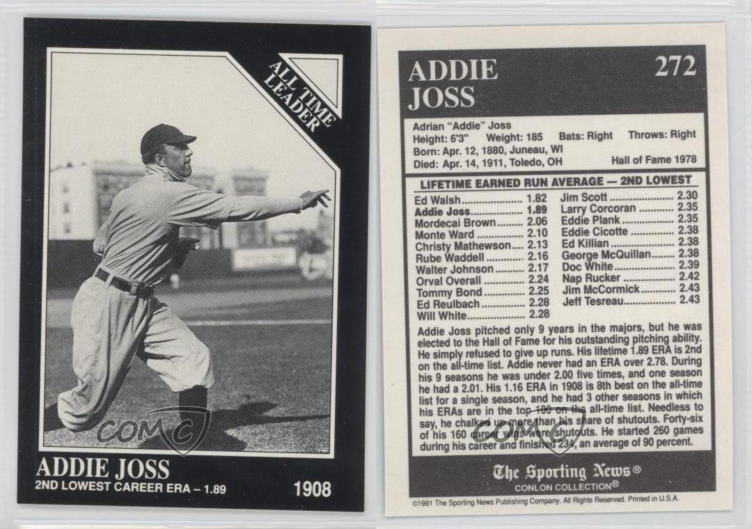1991 The Sporting News Conlon Collection - [Base] - No MLB Logo on Back #272 All Time Leader - Addie Joss - Rookie - Baseball Card - Featuring the Cleveland Indians - Featuring Addie Joss Search for more: 1991 The Sporting News Conlon Collection Search for more: 1991 The Sporting News Conlon Collection - [Base] - No MLB Logo on Back View all of our Listings Auctions Buy It Now About Us Located in the beautiful Pacific Northwest, COMC (Check Out My Cards) is the world's largest consignment service for trading card singles. More than 10,000 people have used our consignment service to list over 50 million trading cards. Find out how we can help you consign your items on eBay by contacting us through eBay messaging. COMC -- "The Safe & Easy Way to Buy & Sell" Representative Image - Select Specific Item above to see image of actual item Representative Image - Select Specific Item above to see image of actual item Raw Condition for Modern Cards Unless otherwise noted, raw modern cards are listed in Near Mint-Mint condition or better. A NM-MT card appears to be Mint at first glance, but upon closer inspection, may exhibit some of the following: minor print defects (e.g. roller marks, print line, dimple), minor scratches, slight edge wear, and slight corner wear. Centering is clearly visible in the images provided and does not factor into our condition assessment. Raw Condition for Vintage Cards Unless otherwise noted, raw vintage cards are listed in Excellent condition or better. An EX card may exhibit some of the following: minor rounding of corners, surface wear, print defects, light scratches, and slight edge wear/chipping. Centering is clearly visible in the images provided and does not factor into our condition assessment. Domestic Shipping Combined shipping for multiple items is available. To receive combined shipping, please ensure all desired items are in your eBay shopping cart before proceeding to checkout. eBay limits orders to 40 items per order. We automatically combine multiple orders placed on the same day. If you place multiple orders on the same day, please contact us to request a refund of applicable shipping costs. Signature confirmation may be required on invoices over $400. All cards are protected and shipped securely. International Shipping COMC offers eBay's International Shipping (EIS) for international orders under $2,500* (see country exceptions below). All duties and import fees are paid at checkout; in the rare event that there are additional import fees upon delivery, these are borne by the buyer. EIS packages route through a shipping hub in Erlanger, KY before shipping to their final destination. Please note that EIS does not allow for combined shipments. The shipping rates are determined by eBay and cannot be adjusted. *Maximum sale price exceptions: Colombia, Kuwait ($2,000); Taiwan ($1,539); Chile, Costa Rica, Guatemala, Honduras, Trinidad and Tobago ($1,000); Antigua and Barbuda, Aruba, Belize, Dominica, Grenada, Philippines, Saint Kitts and Nevis, Saint Lucia, Montserrat, Turks and Caicos Islands ($500); Dominican Republic, El Salvador ($200). Please request a shipping quote through eBay messaging for orders that exceed the maximum sale price supported by eBay's International Shipping. You will be responsible for all duties and import fees for international orders shipped outside the EIS. All cards are protected and shipped securely. Payment COMC does not accept offers on our cards through our eBay storefront. COMC utilizes eBay’s managed payments system. If you are experiencing difficulties making a payment, please contact eBay for assistance. Return Policy Returns are only accepted on the rare occasion the item is not as described. If you are making a return, please initiate the return process through eBay so a mailing label can be provided for you. Prior to listing, our expert team carefully assessed this item to represent it accurately. Please review the description and high-definition images prior to purchasing to ensure this item meets your satisfaction. We welcome you to contact us if you have further questions about this item. Trust and Integrity COMC carefully assesses each item consigned to us to prevent fraudulent items from entering the marketplace. If you believe an item offered on COMC may be fraudulent, please contact us with details so we can investigate the issue. Items we determine are outside our supported items policy may be removed. Last Modified: 3/27/2025 4:26:25 PM PDT