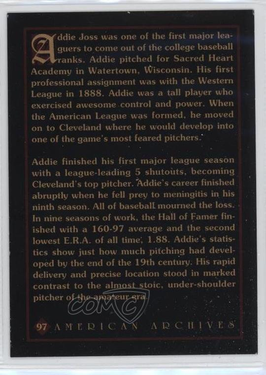 1994 American Archives Origins of Baseball - [Base] #97 Addie Joss - Rookie - Baseball Card - Featuring the Cleveland Indians - Featuring Addie Joss Search for more: 1994 American Archives Origins of Baseball Search for more: 1994 American Archives Origins of Baseball - [Base] View all of our Listings Auctions Buy It Now About Us Located in the beautiful Pacific Northwest, COMC (Check Out My Cards) is the world's largest consignment service for trading card singles. More than 10,000 people have used our consignment service to list over 50 million trading cards. Find out how we can help you consign your items on eBay by contacting us through eBay messaging. COMC -- "The Safe & Easy Way to Buy & Sell" Representative Image - Select Specific Item above to see image of actual item Representative Image - Select Specific Item above to see image of actual item Raw Condition for Modern Cards Unless otherwise noted, raw modern cards are listed in Near Mint-Mint condition or better. A NM-MT card appears to be Mint at first glance, but upon closer inspection, may exhibit some of the following: minor print defects (e.g. roller marks, print line, dimple), minor scratches, slight edge wear, and slight corner wear. Centering is clearly visible in the images provided and does not factor into our condition assessment. Raw Condition for Vintage Cards Unless otherwise noted, raw vintage cards are listed in Excellent condition or better. An EX card may exhibit some of the following: minor rounding of corners, surface wear, print defects, light scratches, and slight edge wear/chipping. Centering is clearly visible in the images provided and does not factor into our condition assessment. Domestic Shipping Combined shipping for multiple items is available. To receive combined shipping, please ensure all desired items are in your eBay shopping cart before proceeding to checkout. eBay limits orders to 40 items per order. We automatically combine multiple orders placed on the same day. If you place multiple orders on the same day, please contact us to request a refund of applicable shipping costs. Signature confirmation may be required on invoices over $400. All cards are protected and shipped securely. International Shipping COMC offers eBay's International Shipping (EIS) for international orders under $2,500* (see country exceptions below). All duties and import fees are paid at checkout; in the rare event that there are additional import fees upon delivery, these are borne by the buyer. EIS packages route through a shipping hub in Erlanger, KY before shipping to their final destination. Please note that EIS does not allow for combined shipments. The shipping rates are determined by eBay and cannot be adjusted. *Maximum sale price exceptions: Colombia, Kuwait ($2,000); Taiwan ($1,539); Chile, Costa Rica, Guatemala, Honduras, Trinidad and Tobago ($1,000); Antigua and Barbuda, Aruba, Belize, Dominica, Grenada, Philippines, Saint Kitts and Nevis, Saint Lucia, Montserrat, Turks and Caicos Islands ($500); Dominican Republic, El Salvador ($200). Please request a shipping quote through eBay messaging for orders that exceed the maximum sale price supported by eBay's International Shipping. You will be responsible for all duties and import fees for international orders shipped outside the EIS. All cards are protected and shipped securely. Payment COMC does not accept offers on our cards through our eBay storefront. COMC utilizes eBay’s managed payments system. If you are experiencing difficulties making a payment, please contact eBay for assistance. Return Policy Returns are only accepted on the rare occasion the item is not as described. If you are making a return, please initiate the return process through eBay so a mailing label can be provided for you. Prior to listing, our expert team carefully assessed this item to represent it accurately. Please review the description and high-definition images prior to purchasing to ensure this item meets your satisfaction. We welcome you to contact us if you have further questions about this item. Trust and Integrity COMC carefully assesses each item consigned to us to prevent fraudulent items from entering the marketplace. If you believe an item offered on COMC may be fraudulent, please contact us with details so we can investigate the issue. Items we determine are outside our supported items policy may be removed. Last Modified: 4/30/2025 1:55:24 AM PDT
