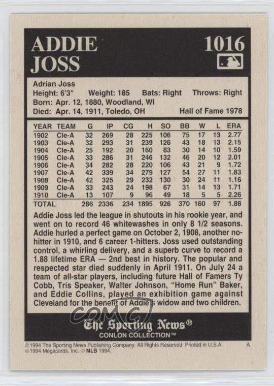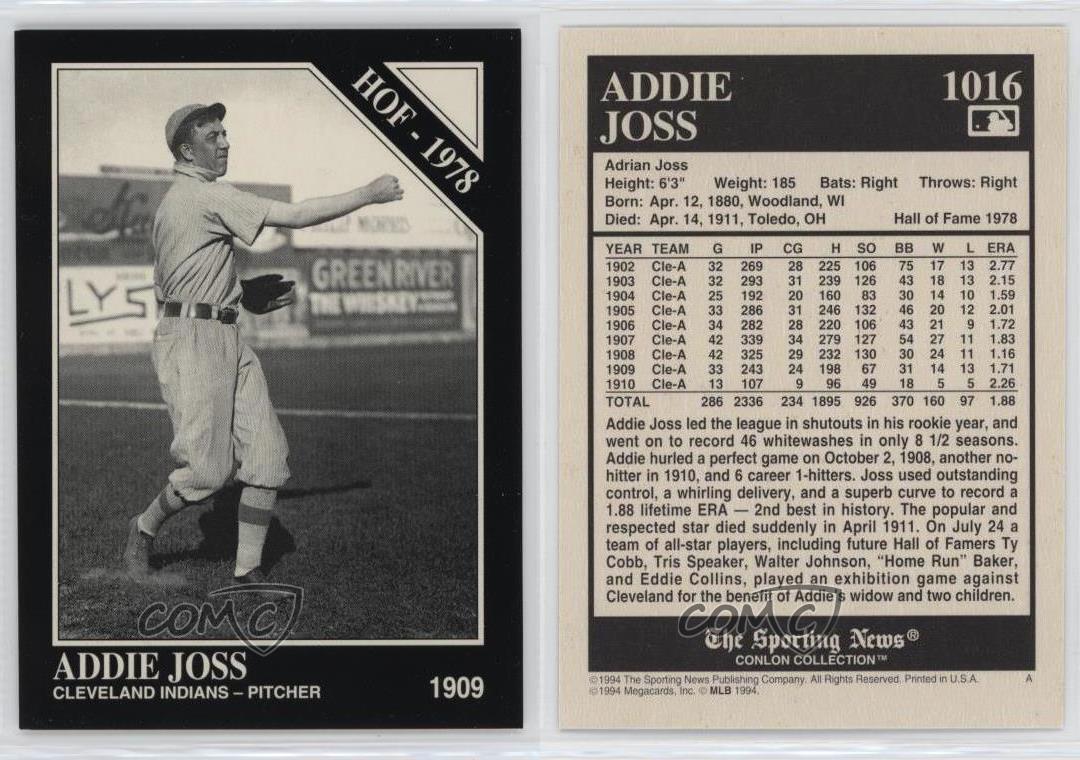 1994 The Sporting News Conlon Collection - [Base] #1016 Addie Joss - Rookie - Baseball Card - Featuring the Cleveland Indians - Featuring Addie Joss Search for more: 1994 The Sporting News Conlon Collection Search for more: 1994 The Sporting News Conlon Collection - [Base] View all of our Listings Auctions Buy It Now About Us Located in the beautiful Pacific Northwest, COMC (Check Out My Cards) is the world's largest consignment service for trading card singles. More than 10,000 people have used our consignment service to list over 50 million trading cards. Find out how we can help you consign your items on eBay by contacting us through eBay messaging. COMC -- "The Safe & Easy Way to Buy & Sell" Representative Image - Select Specific Item above to see image of actual item Representative Image - Select Specific Item above to see image of actual item Raw Condition for Modern Cards Unless otherwise noted, raw modern cards are listed in Near Mint-Mint condition or better. A NM-MT card appears to be Mint at first glance, but upon closer inspection, may exhibit some of the following: minor print defects (e.g. roller marks, print line, dimple), minor scratches, slight edge wear, and slight corner wear. Centering is clearly visible in the images provided and does not factor into our condition assessment. Raw Condition for Vintage Cards Unless otherwise noted, raw vintage cards are listed in Excellent condition or better. An EX card may exhibit some of the following: minor rounding of corners, surface wear, print defects, light scratches, and slight edge wear/chipping. Centering is clearly visible in the images provided and does not factor into our condition assessment. Domestic Shipping Combined shipping for multiple items is available. To receive combined shipping, please ensure all desired items are in your eBay shopping cart before proceeding to checkout. eBay limits orders to 40 items per order. We automatically combine multiple orders placed on the same day. If you place multiple orders on the same day, please contact us to request a refund of applicable shipping costs. Signature confirmation may be required on invoices over $400. All cards are protected and shipped securely. International Shipping COMC offers eBay's International Shipping (EIS) for international orders under $2,500* (see country exceptions below). All duties and import fees are paid at checkout; in the rare event that there are additional import fees upon delivery, these are borne by the buyer. EIS packages route through a shipping hub in Erlanger, KY before shipping to their final destination. Please note that EIS does not allow for combined shipments. The shipping rates are determined by eBay and cannot be adjusted. *Maximum sale price exceptions: Colombia, Kuwait ($2,000); Taiwan ($1,539); Chile, Costa Rica, Guatemala, Honduras, Trinidad and Tobago ($1,000); Antigua and Barbuda, Aruba, Belize, Dominica, Grenada, Philippines, Saint Kitts and Nevis, Saint Lucia, Montserrat, Turks and Caicos Islands ($500); Dominican Republic, El Salvador ($200). Please request a shipping quote through eBay messaging for orders that exceed the maximum sale price supported by eBay's International Shipping. You will be responsible for all duties and import fees for international orders shipped outside the EIS. All cards are protected and shipped securely. Payment COMC does not accept offers on our cards through our eBay storefront. COMC utilizes eBay’s managed payments system. If you are experiencing difficulties making a payment, please contact eBay for assistance. Return Policy Returns are only accepted on the rare occasion the item is not as described. If you are making a return, please initiate the return process through eBay so a mailing label can be provided for you. Prior to listing, our expert team carefully assessed this item to represent it accurately. Please review the description and high-definition images prior to purchasing to ensure this item meets your satisfaction. We welcome you to contact us if you have further questions about this item. Trust and Integrity COMC carefully assesses each item consigned to us to prevent fraudulent items from entering the marketplace. If you believe an item offered on COMC may be fraudulent, please contact us with details so we can investigate the issue. Items we determine are outside our supported items policy may be removed. Last Modified: 4/18/2025 9:44:41 PM PDT