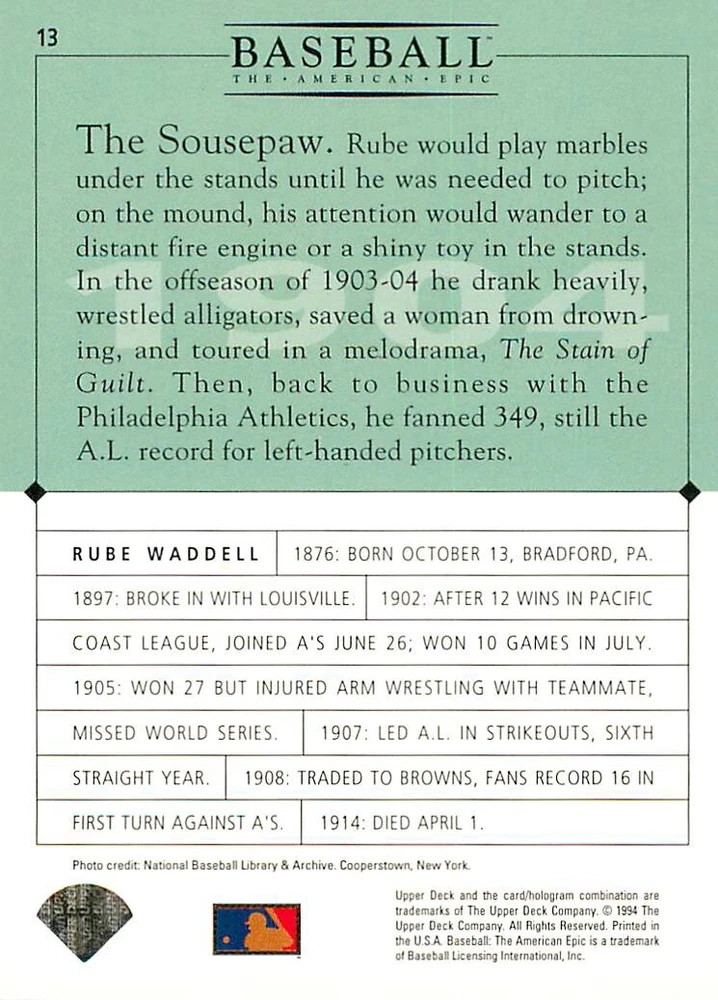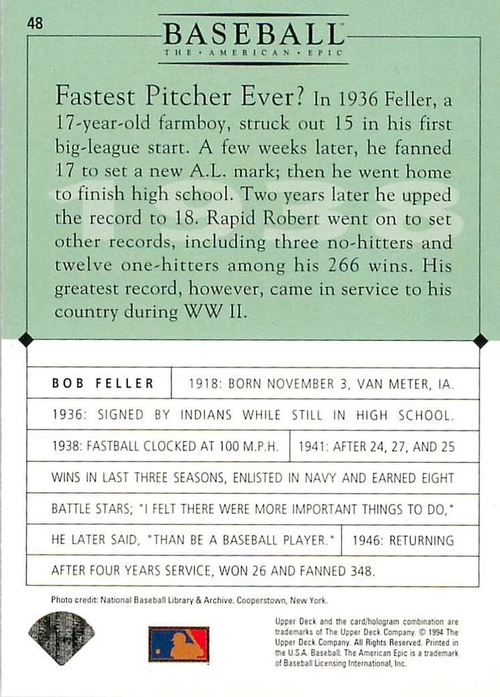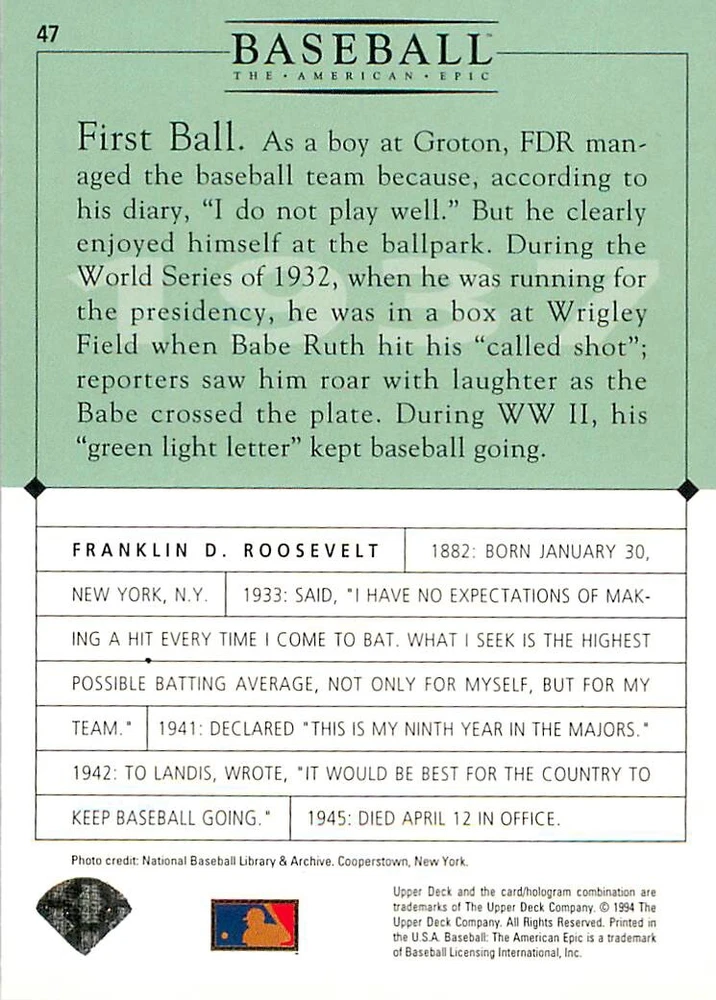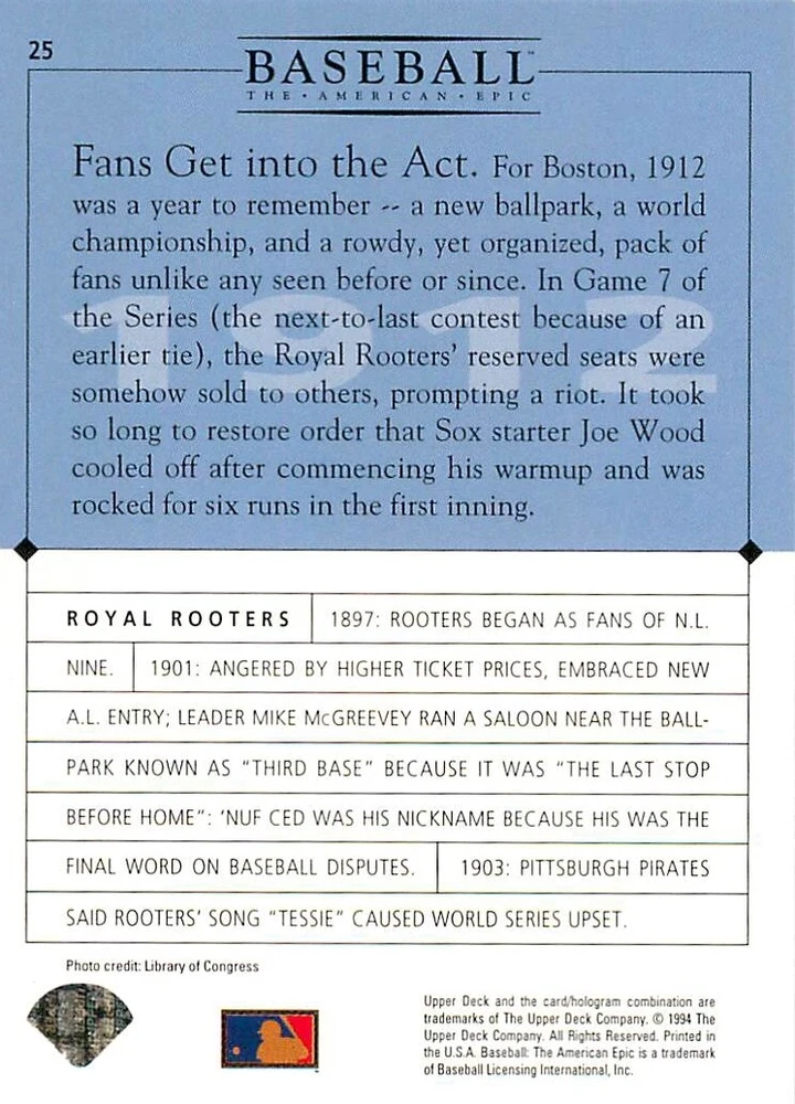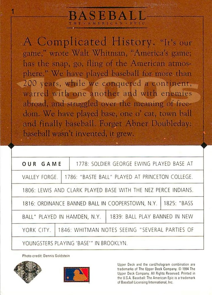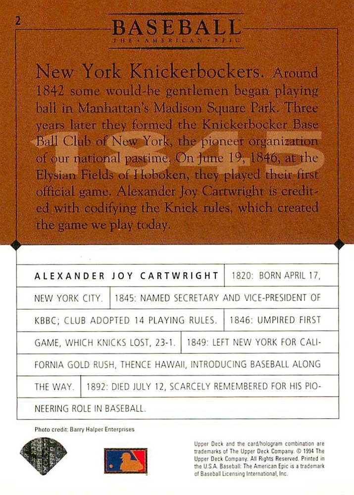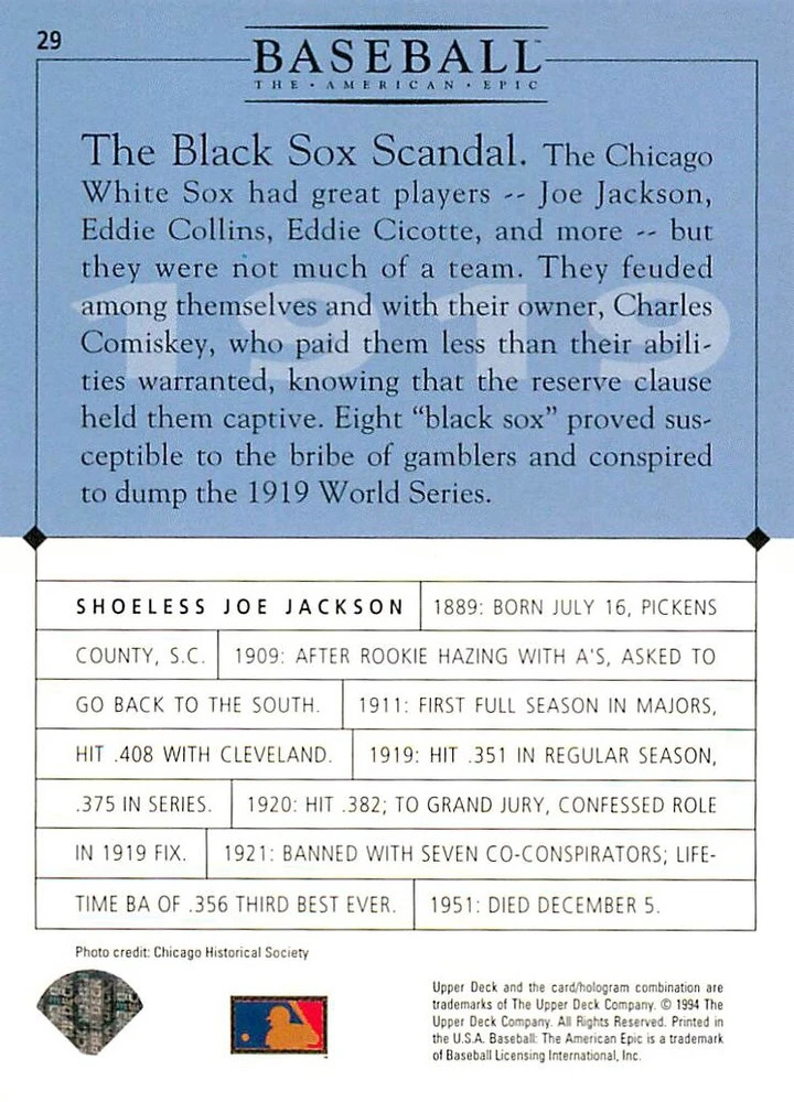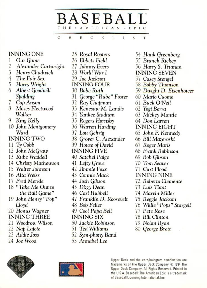 1994 Upper Deck Ken Burns Baseball THE AMERICAN EPIC - Your Choice - Baseball Card Stock pictures. We always ship the best available card, and all cards of this set go straight from the original package into a soft sleeve. Please ask for a picture of the card you want before paying if needed. $0.99 Shipping with tracking for as many cards as you'd like, if paid with one payment! Add cards to your cart from this or any of our other listings before paying for combined shipping and discounts up to 20%! 1800's Our Game 1845 Alexander Cartwright 1857 Henry Chadwick 1866 The Fair Sex 1869 Harry Wright 1876 Albert Goodwill Spaulding 1883 Cap Anson 1884 Moses Fleetwood Walker 1886 King Kelly 1890 John Montgomery Ward 1909 Ty Cobb 1904 John McGraw 1904 Rube Waddell 1905 Christy Mathewson 1907 Walter Johnson 1908 Alta Weiss 1908 Fred Merkle 1908 'Take Me Out to the Ballgame' 1909 John Henry 'Pop' Lloyd 1909 Honus Wagner 1915 Woodrow Wilson 1910 Nap Lajoie 1911 Addie Joss 1912 Joe Wood 1912 Royal Rooters 1913 Ebbets Field 1914 Johnny Evers 1918 World War I 1919 Shoeless Joe Jackson 1927 Babe Ruth 1920 George 'Rube' Foster 1920 Ray Chapman 1921 Kenesaw M. Landis 1923 Yankee Stadium 1924 Rogers Hornsby 1923 Warren G. Harding 1925 Lou Gehrig 1926 Grover C. Alexander 1929 House of David 1933 Satchel Paige 1931 Lefty Grove 1932 Jimmie Foxx 1932 Connie Mack 1937 Josh Gibson 1934 Dizzy Dean 1934 Carl Hubbell 1937 Franklin D. Roosevelt 1938 Bob Feller 1939 Cool Papa Bell 1947 Jackie Robinson 1941 Ted Williams 1941 Sym-phony Band 1944 Annabel Lee 1945 Hank Greenberg 1947 Branch Rickey 1948 Harry S. Truman 1953 Casey Stengel 1951 Bobby Thomson 1952 Dwight D. Eisenhower 1952 Mario Cuomo 1954 Buck O'Neil 1955 Yogi Berra 1956 Mickey Mantle 1956 Don Larsen 1961 John F. Kennedy 1960 Bill Mazeroski 1961 Roger Maris 1966 Frank Robinson 1968 Bob Gibson 1969 Tom Seaver 1969 Curt Flood 1972 Roberto Clemente 1975 Luis Tiant 1975 Marvin Miller 1977 Reggie Jackson 1979 Willie ' Pops' Stargell 1985 Pete Rose 1994 Bill Clinton 1991 Nolan Ryan 1993 George Brett Checklist/Title Card Economy Shipping: More than just a Plain White Envelope!! $0.99 USPS domestic shipping in a soft sleeve, toploader or cardsaver, team bag and cardboard mailer with tracking. Combined Shipping: Yes. No additional shipping charge for additional single cards . (The highest shipping charge of any single item will be the cost for the entire order.) You must add your cards to the Shopping Cart to get combined shipping. When you have all your cards in the Shopping Cart, click on the note "Request total from seller" (to the right of our store name). Please wait for an invoice with the combined shipping fees before paying. If you should have any questions, please contact us prior to paying for your items. Card Scans: Stock pictures. We always ship the best available card, and all cards of this set go straight from the original package into a soft sleeve. Please ask for a picture of the card you want before paying if needed. Returns: We offer a 30-day return policy. However, we are not responsible for shipping damage via Economy Shipping. Please contact us via eBay messages if you are unsatisfied with a card that you purchase from us. We carefully pack and ship each order, and provide tracking. We do not charge re-stocking fees. Shipping fees are not refundable, unless the error lies with how we described the card. Again, please look at the scans carefully. Feedback: We will provide prompt feedback as soon as you have received your card(s) and provided feedback for us. Our goal is 100% positive feedback, so please contact us via eBay messages if there are any issues with your shipment to see if we can provide a solution. Thanks for looking!