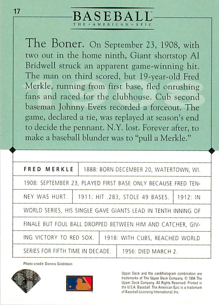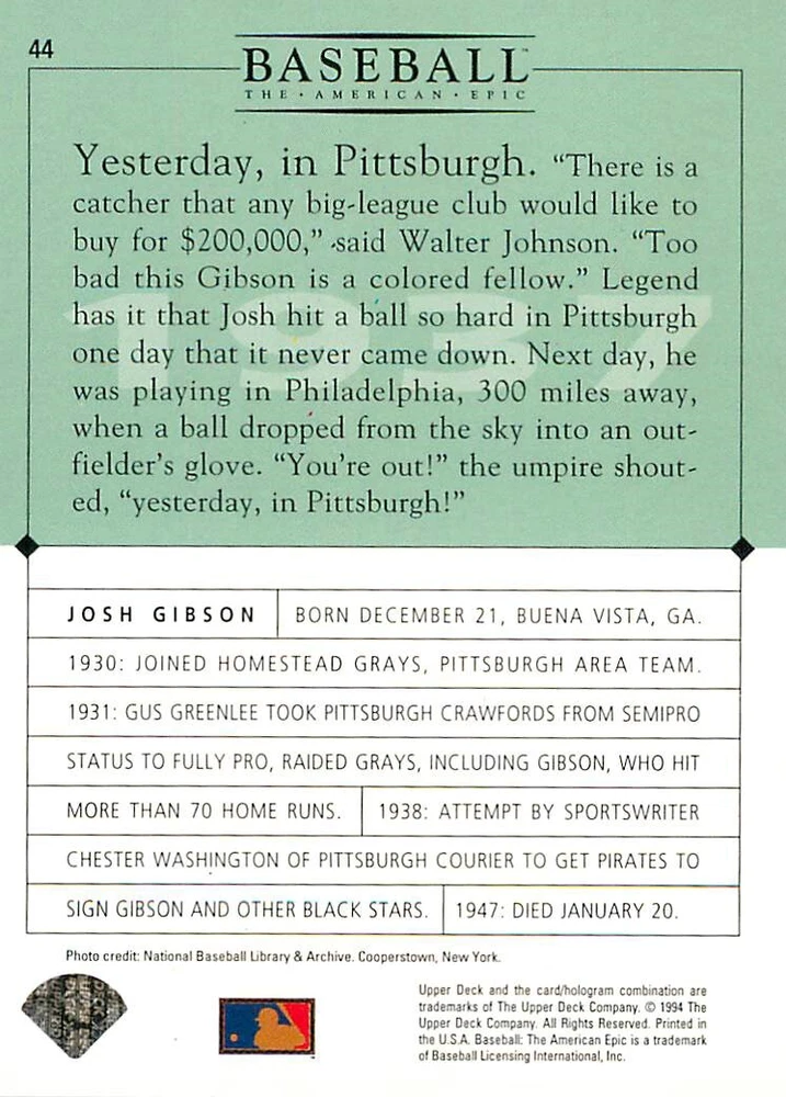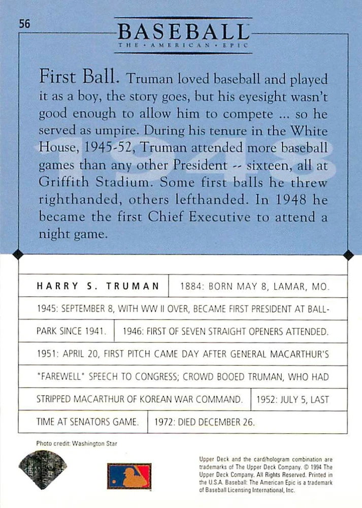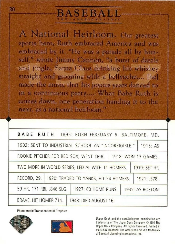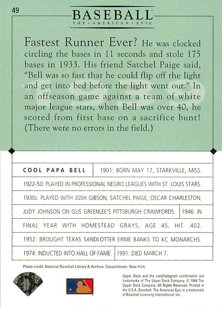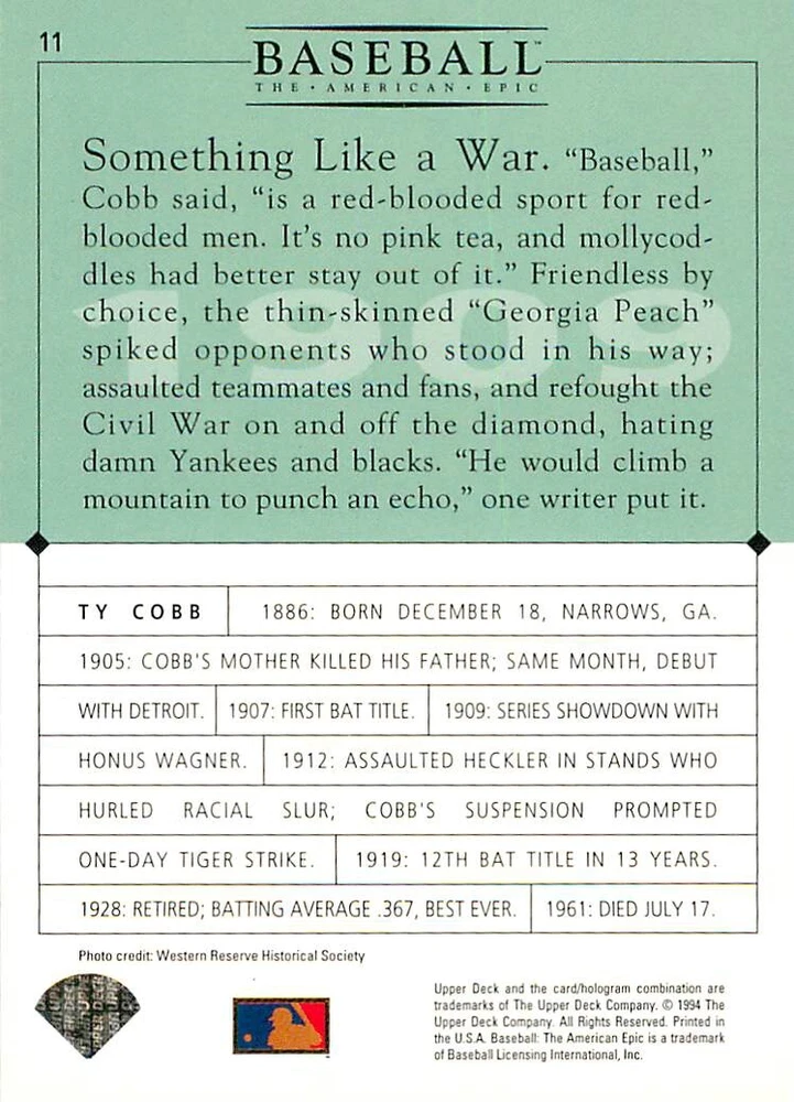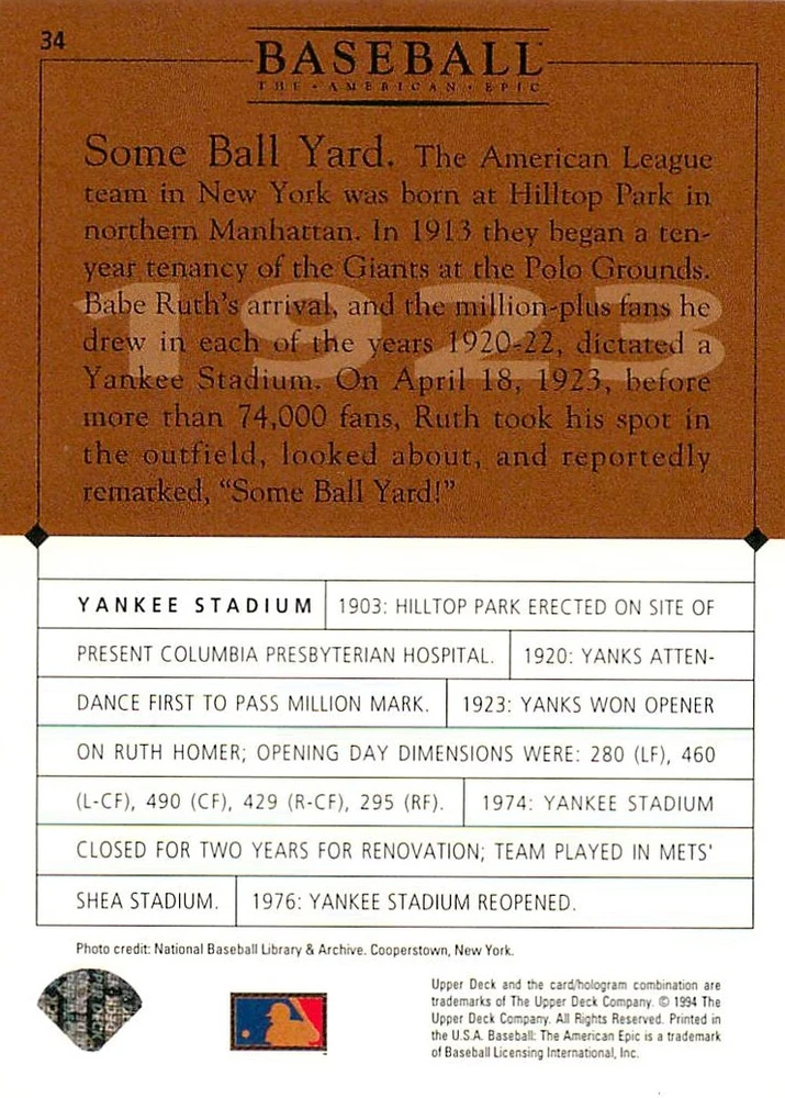 1994 Upper Deck Ken Burns Baseball THE AMERICAN EPIC - Your Choice - Baseball Card Stock pictures. We always ship the best available card, and all cards of this set go straight from the original package into a soft sleeve. Please ask for a picture of the card you want before paying if needed. $0.99 Shipping with tracking for as many cards as you'd like, if paid with one payment! Add cards to your cart from this or any of our other listings before paying for combined shipping and discounts up to 20%! 1800's Our Game 1845 Alexander Cartwright 1857 Henry Chadwick 1866 The Fair Sex 1869 Harry Wright 1876 Albert Goodwill Spaulding 1883 Cap Anson 1884 Moses Fleetwood Walker 1886 King Kelly 1890 John Montgomery Ward 1909 Ty Cobb 1904 John McGraw 1904 Rube Waddell 1905 Christy Mathewson 1907 Walter Johnson 1908 Alta Weiss 1908 Fred Merkle 1908 'Take Me Out to the Ballgame' 1909 John Henry 'Pop' Lloyd 1909 Honus Wagner 1915 Woodrow Wilson 1910 Nap Lajoie 1911 Addie Joss 1912 Joe Wood 1912 Royal Rooters 1913 Ebbets Field 1914 Johnny Evers 1918 World War I 1919 Shoeless Joe Jackson 1927 Babe Ruth 1920 George 'Rube' Foster 1920 Ray Chapman 1921 Kenesaw M. Landis 1923 Yankee Stadium 1924 Rogers Hornsby 1923 Warren G. Harding 1925 Lou Gehrig 1926 Grover C. Alexander 1929 House of David 1933 Satchel Paige 1931 Lefty Grove 1932 Jimmie Foxx 1932 Connie Mack 1937 Josh Gibson 1934 Dizzy Dean 1934 Carl Hubbell 1937 Franklin D. Roosevelt 1938 Bob Feller 1939 Cool Papa Bell 1947 Jackie Robinson 1941 Ted Williams 1941 Sym-phony Band 1944 Annabel Lee 1945 Hank Greenberg 1947 Branch Rickey 1948 Harry S. Truman 1953 Casey Stengel 1951 Bobby Thomson 1952 Dwight D. Eisenhower 1952 Mario Cuomo 1954 Buck O'Neil 1955 Yogi Berra 1956 Mickey Mantle 1956 Don Larsen 1961 John F. Kennedy 1960 Bill Mazeroski 1961 Roger Maris 1966 Frank Robinson 1968 Bob Gibson 1969 Tom Seaver 1969 Curt Flood 1972 Roberto Clemente 1975 Luis Tiant 1975 Marvin Miller 1977 Reggie Jackson 1979 Willie ' Pops' Stargell 1985 Pete Rose 1994 Bill Clinton 1991 Nolan Ryan 1993 George Brett Checklist/Title Card Economy Shipping: More than just a Plain White Envelope!! $0.99 USPS domestic shipping in a soft sleeve, toploader or cardsaver, team bag and cardboard mailer with tracking. Combined Shipping: Yes. No additional shipping charge for additional single cards . (The highest shipping charge of any single item will be the cost for the entire order.) You must add your cards to the Shopping Cart to get combined shipping. When you have all your cards in the Shopping Cart, click on the note "Request total from seller" (to the right of our store name). Please wait for an invoice with the combined shipping fees before paying. If you should have any questions, please contact us prior to paying for your items. Card Scans: Stock pictures. We always ship the best available card, and all cards of this set go straight from the original package into a soft sleeve. Please ask for a picture of the card you want before paying if needed. Returns: We offer a 30-day return policy. However, we are not responsible for shipping damage via Economy Shipping. Please contact us via eBay messages if you are unsatisfied with a card that you purchase from us. We carefully pack and ship each order, and provide tracking. We do not charge re-stocking fees. Shipping fees are not refundable, unless the error lies with how we described the card. Again, please look at the scans carefully. Feedback: We will provide prompt feedback as soon as you have received your card(s) and provided feedback for us. Our goal is 100% positive feedback, so please contact us via eBay messages if there are any issues with your shipment to see if we can provide a solution. Thanks for looking!