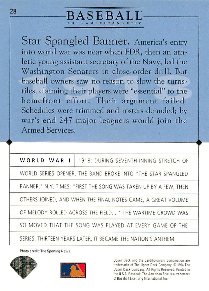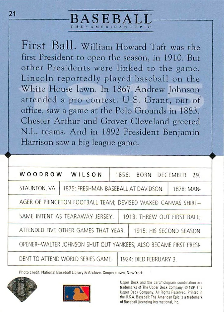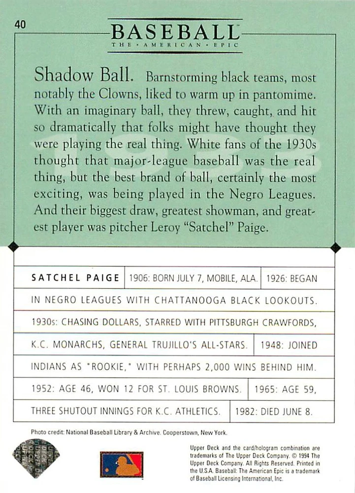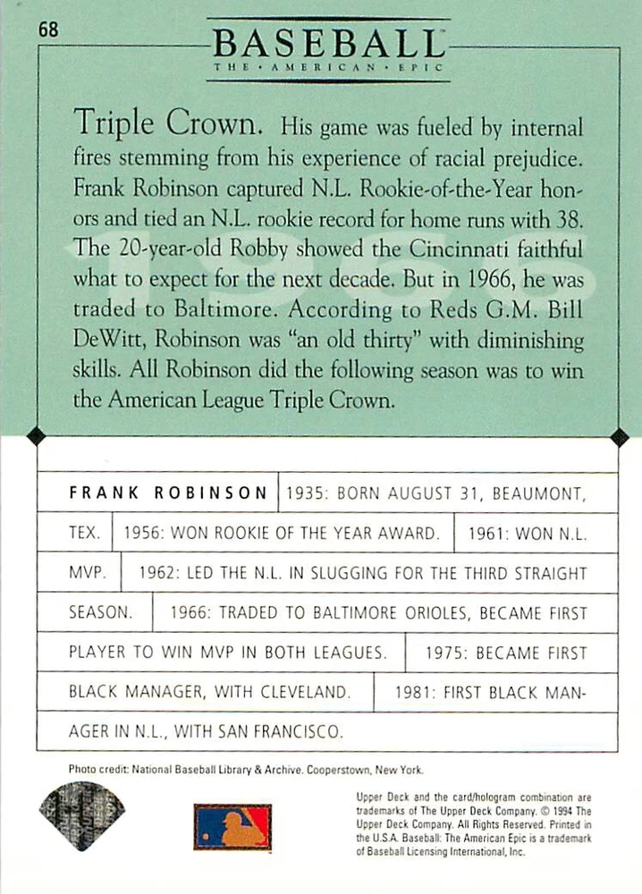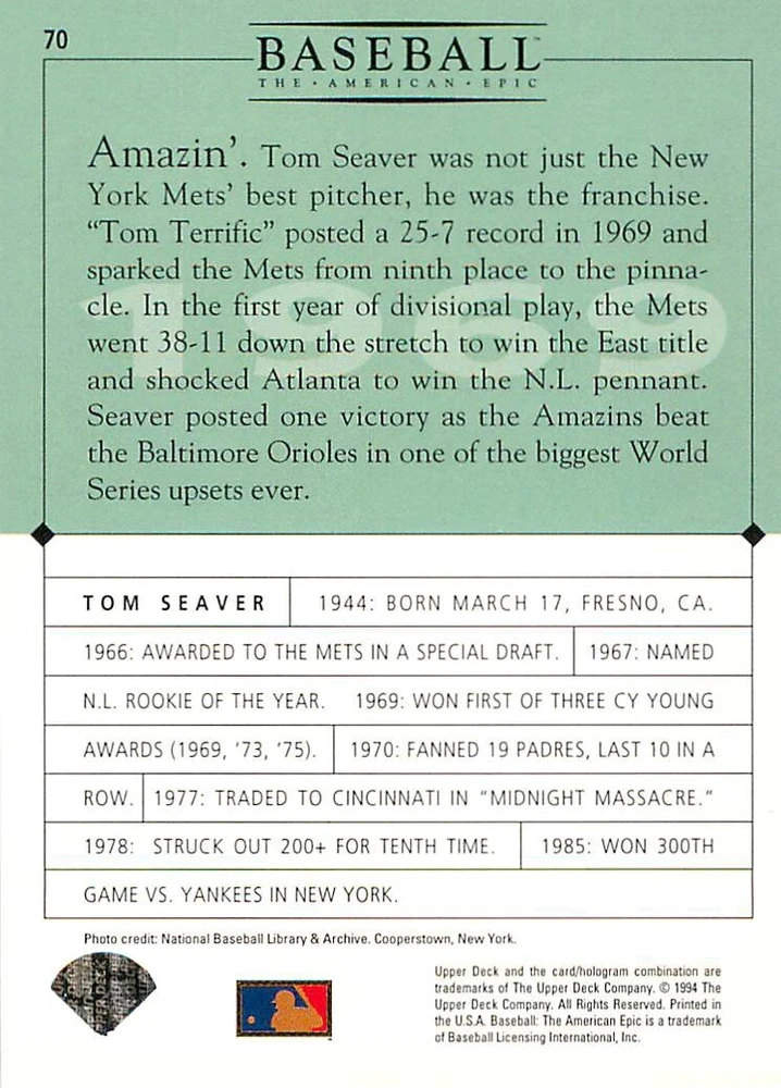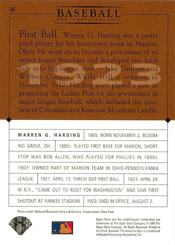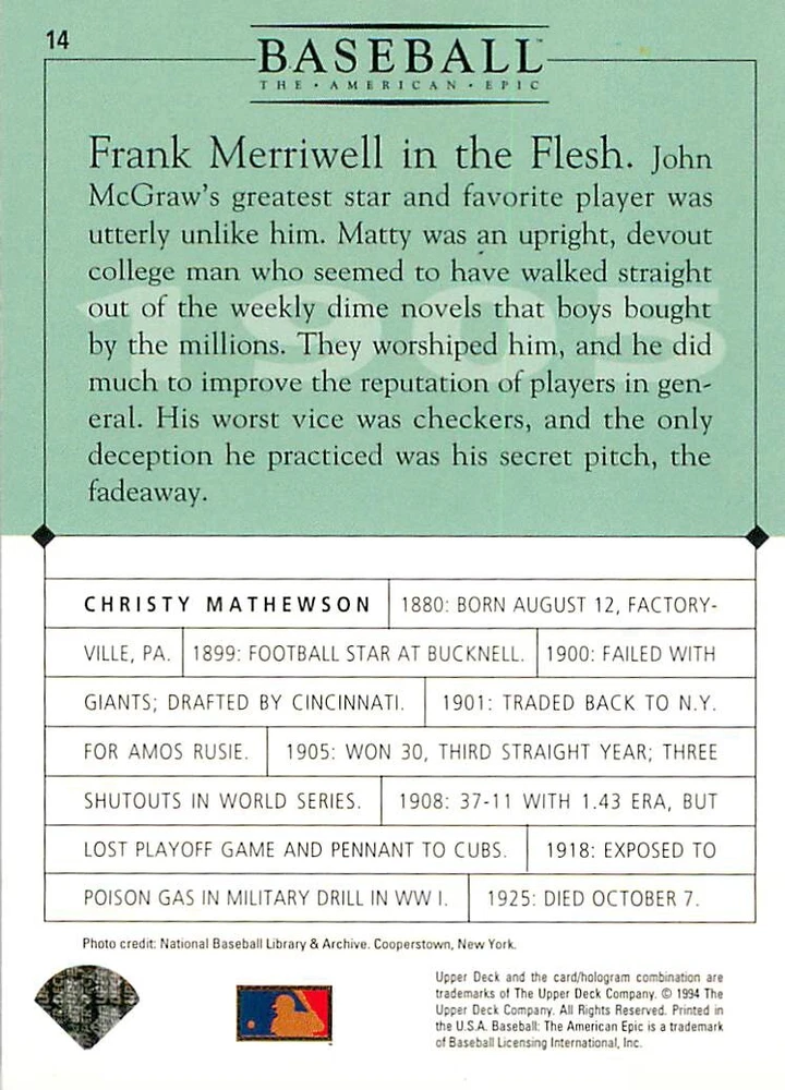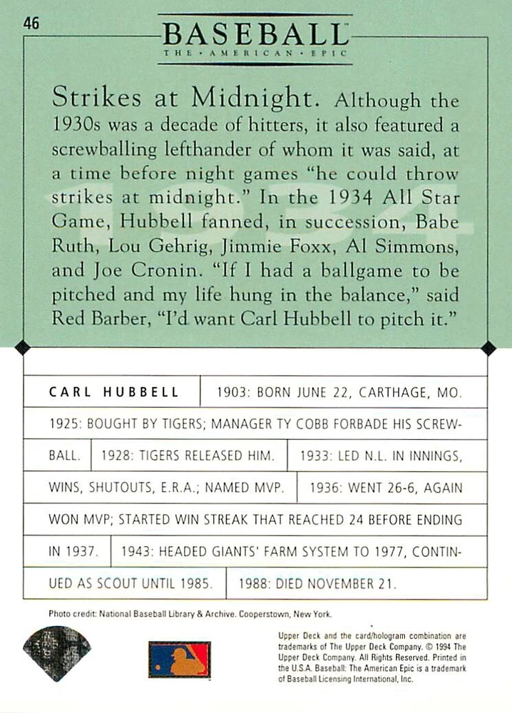 1994 Upper Deck Ken Burns Baseball THE AMERICAN EPIC - Your Choice - Baseball Card Stock pictures. We always ship the best available card, and all cards of this set go straight from the original package into a soft sleeve. Please ask for a picture of the card you want before paying if needed. $0.99 Shipping with tracking for as many cards as you'd like, if paid with one payment! Add cards to your cart from this or any of our other listings before paying for combined shipping and discounts up to 20%! 1800's Our Game 1845 Alexander Cartwright 1857 Henry Chadwick 1866 The Fair Sex 1869 Harry Wright 1876 Albert Goodwill Spaulding 1883 Cap Anson 1884 Moses Fleetwood Walker 1886 King Kelly 1890 John Montgomery Ward 1909 Ty Cobb 1904 John McGraw 1904 Rube Waddell 1905 Christy Mathewson 1907 Walter Johnson 1908 Alta Weiss 1908 Fred Merkle 1908 'Take Me Out to the Ballgame' 1909 John Henry 'Pop' Lloyd 1909 Honus Wagner 1915 Woodrow Wilson 1910 Nap Lajoie 1911 Addie Joss 1912 Joe Wood 1912 Royal Rooters 1913 Ebbets Field 1914 Johnny Evers 1918 World War I 1919 Shoeless Joe Jackson 1927 Babe Ruth 1920 George 'Rube' Foster 1920 Ray Chapman 1921 Kenesaw M. Landis 1923 Yankee Stadium 1924 Rogers Hornsby 1923 Warren G. Harding 1925 Lou Gehrig 1926 Grover C. Alexander 1929 House of David 1933 Satchel Paige 1931 Lefty Grove 1932 Jimmie Foxx 1932 Connie Mack 1937 Josh Gibson 1934 Dizzy Dean 1934 Carl Hubbell 1937 Franklin D. Roosevelt 1938 Bob Feller 1939 Cool Papa Bell 1947 Jackie Robinson 1941 Ted Williams 1941 Sym-phony Band 1944 Annabel Lee 1945 Hank Greenberg 1947 Branch Rickey 1948 Harry S. Truman 1953 Casey Stengel 1951 Bobby Thomson 1952 Dwight D. Eisenhower 1952 Mario Cuomo 1954 Buck O'Neil 1955 Yogi Berra 1956 Mickey Mantle 1956 Don Larsen 1961 John F. Kennedy 1960 Bill Mazeroski 1961 Roger Maris 1966 Frank Robinson 1968 Bob Gibson 1969 Tom Seaver 1969 Curt Flood 1972 Roberto Clemente 1975 Luis Tiant 1975 Marvin Miller 1977 Reggie Jackson 1979 Willie ' Pops' Stargell 1985 Pete Rose 1994 Bill Clinton 1991 Nolan Ryan 1993 George Brett Checklist/Title Card Economy Shipping: More than just a Plain White Envelope!! $0.99 USPS domestic shipping in a soft sleeve, toploader or cardsaver, team bag and cardboard mailer with tracking. Combined Shipping: Yes. No additional shipping charge for additional single cards . (The highest shipping charge of any single item will be the cost for the entire order.) You must add your cards to the Shopping Cart to get combined shipping. When you have all your cards in the Shopping Cart, click on the note "Request total from seller" (to the right of our store name). Please wait for an invoice with the combined shipping fees before paying. If you should have any questions, please contact us prior to paying for your items. Card Scans: Stock pictures. We always ship the best available card, and all cards of this set go straight from the original package into a soft sleeve. Please ask for a picture of the card you want before paying if needed. Returns: We offer a 30-day return policy. However, we are not responsible for shipping damage via Economy Shipping. Please contact us via eBay messages if you are unsatisfied with a card that you purchase from us. We carefully pack and ship each order, and provide tracking. We do not charge re-stocking fees. Shipping fees are not refundable, unless the error lies with how we described the card. Again, please look at the scans carefully. Feedback: We will provide prompt feedback as soon as you have received your card(s) and provided feedback for us. Our goal is 100% positive feedback, so please contact us via eBay messages if there are any issues with your shipment to see if we can provide a solution. Thanks for looking!
