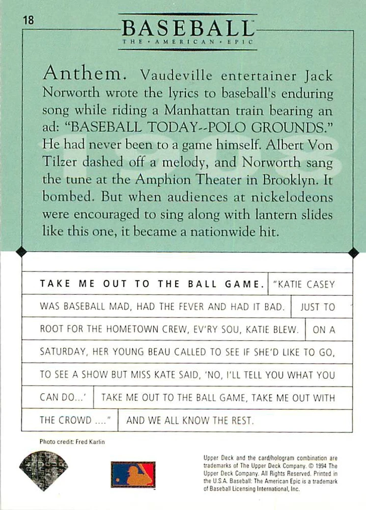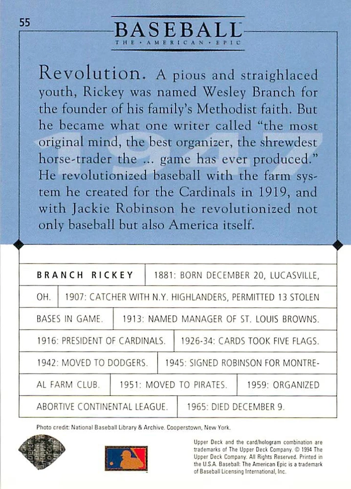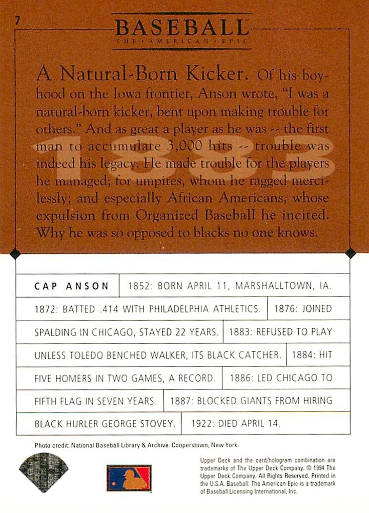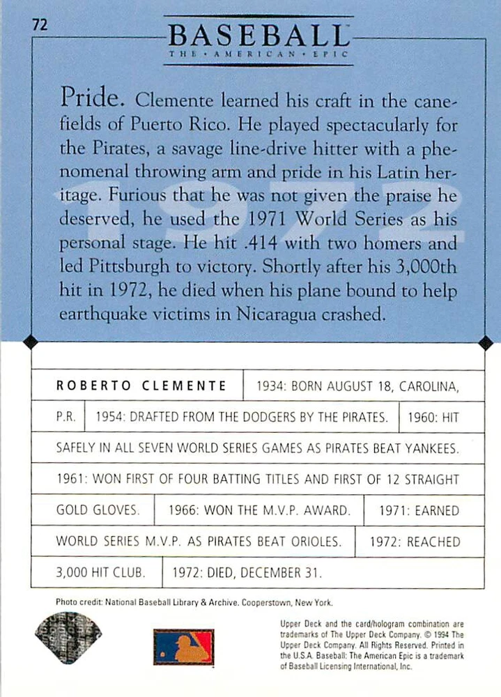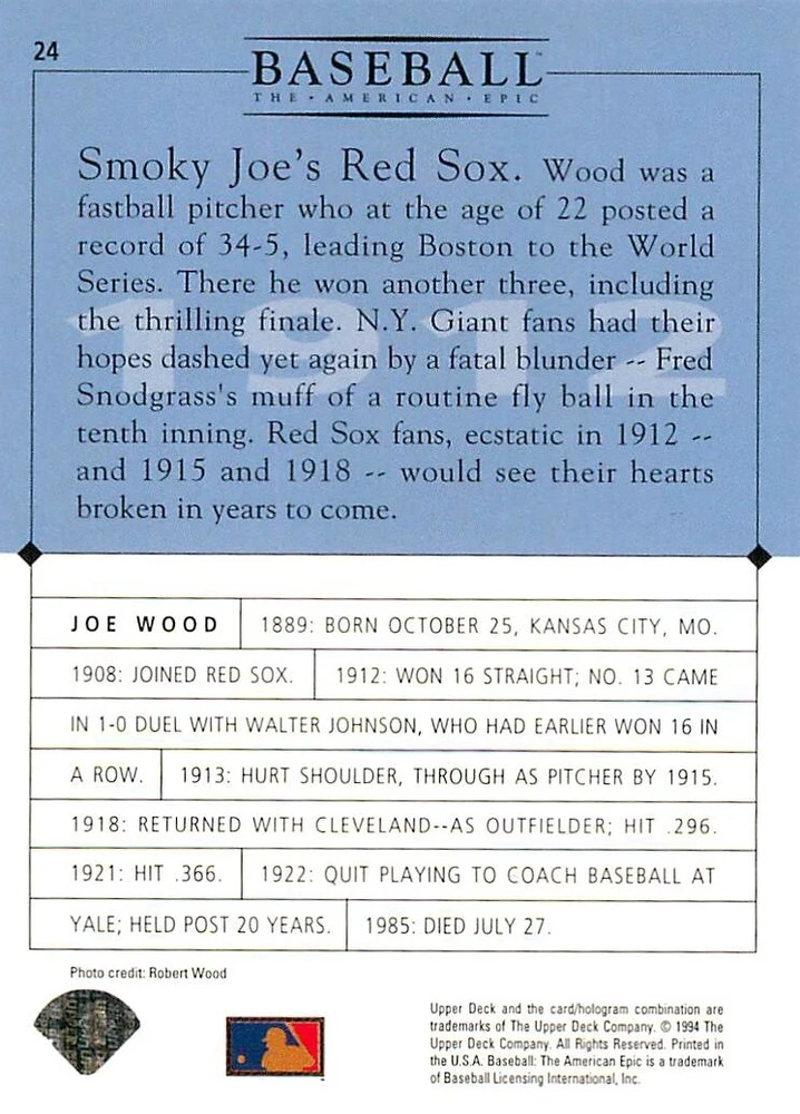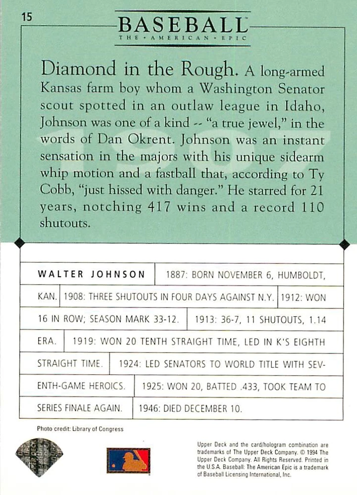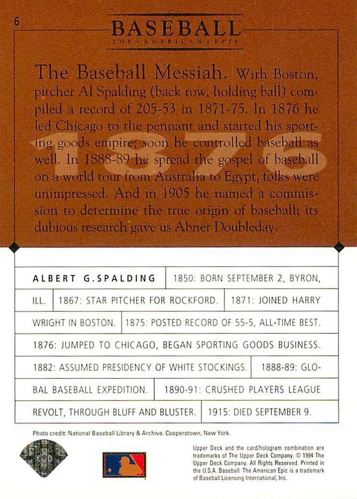 1994 Upper Deck Ken Burns Baseball THE AMERICAN EPIC - Your Choice - Baseball Card Stock pictures. We always ship the best available card, and all cards of this set go straight from the original package into a soft sleeve. Please ask for a picture of the card you want before paying if needed. $0.99 Shipping with tracking for as many cards as you'd like, if paid with one payment! Add cards to your cart from this or any of our other listings before paying for combined shipping and discounts up to 20%! 1800's Our Game 1845 Alexander Cartwright 1857 Henry Chadwick 1866 The Fair Sex 1869 Harry Wright 1876 Albert Goodwill Spaulding 1883 Cap Anson 1884 Moses Fleetwood Walker 1886 King Kelly 1890 John Montgomery Ward 1909 Ty Cobb 1904 John McGraw 1904 Rube Waddell 1905 Christy Mathewson 1907 Walter Johnson 1908 Alta Weiss 1908 Fred Merkle 1908 'Take Me Out to the Ballgame' 1909 John Henry 'Pop' Lloyd 1909 Honus Wagner 1915 Woodrow Wilson 1910 Nap Lajoie 1911 Addie Joss 1912 Joe Wood 1912 Royal Rooters 1913 Ebbets Field 1914 Johnny Evers 1918 World War I 1919 Shoeless Joe Jackson 1927 Babe Ruth 1920 George 'Rube' Foster 1920 Ray Chapman 1921 Kenesaw M. Landis 1923 Yankee Stadium 1924 Rogers Hornsby 1923 Warren G. Harding 1925 Lou Gehrig 1926 Grover C. Alexander 1929 House of David 1933 Satchel Paige 1931 Lefty Grove 1932 Jimmie Foxx 1932 Connie Mack 1937 Josh Gibson 1934 Dizzy Dean 1934 Carl Hubbell 1937 Franklin D. Roosevelt 1938 Bob Feller 1939 Cool Papa Bell 1947 Jackie Robinson 1941 Ted Williams 1941 Sym-phony Band 1944 Annabel Lee 1945 Hank Greenberg 1947 Branch Rickey 1948 Harry S. Truman 1953 Casey Stengel 1951 Bobby Thomson 1952 Dwight D. Eisenhower 1952 Mario Cuomo 1954 Buck O'Neil 1955 Yogi Berra 1956 Mickey Mantle 1956 Don Larsen 1961 John F. Kennedy 1960 Bill Mazeroski 1961 Roger Maris 1966 Frank Robinson 1968 Bob Gibson 1969 Tom Seaver 1969 Curt Flood 1972 Roberto Clemente 1975 Luis Tiant 1975 Marvin Miller 1977 Reggie Jackson 1979 Willie ' Pops' Stargell 1985 Pete Rose 1994 Bill Clinton 1991 Nolan Ryan 1993 George Brett Checklist/Title Card Economy Shipping: More than just a Plain White Envelope!! $0.99 USPS domestic shipping in a soft sleeve, toploader or cardsaver, team bag and cardboard mailer with tracking. Combined Shipping: Yes. No additional shipping charge for additional single cards . (The highest shipping charge of any single item will be the cost for the entire order.) You must add your cards to the Shopping Cart to get combined shipping. When you have all your cards in the Shopping Cart, click on the note "Request total from seller" (to the right of our store name). Please wait for an invoice with the combined shipping fees before paying. If you should have any questions, please contact us prior to paying for your items. Card Scans: Stock pictures. We always ship the best available card, and all cards of this set go straight from the original package into a soft sleeve. Please ask for a picture of the card you want before paying if needed. Returns: We offer a 30-day return policy. However, we are not responsible for shipping damage via Economy Shipping. Please contact us via eBay messages if you are unsatisfied with a card that you purchase from us. We carefully pack and ship each order, and provide tracking. We do not charge re-stocking fees. Shipping fees are not refundable, unless the error lies with how we described the card. Again, please look at the scans carefully. Feedback: We will provide prompt feedback as soon as you have received your card(s) and provided feedback for us. Our goal is 100% positive feedback, so please contact us via eBay messages if there are any issues with your shipment to see if we can provide a solution. Thanks for looking!