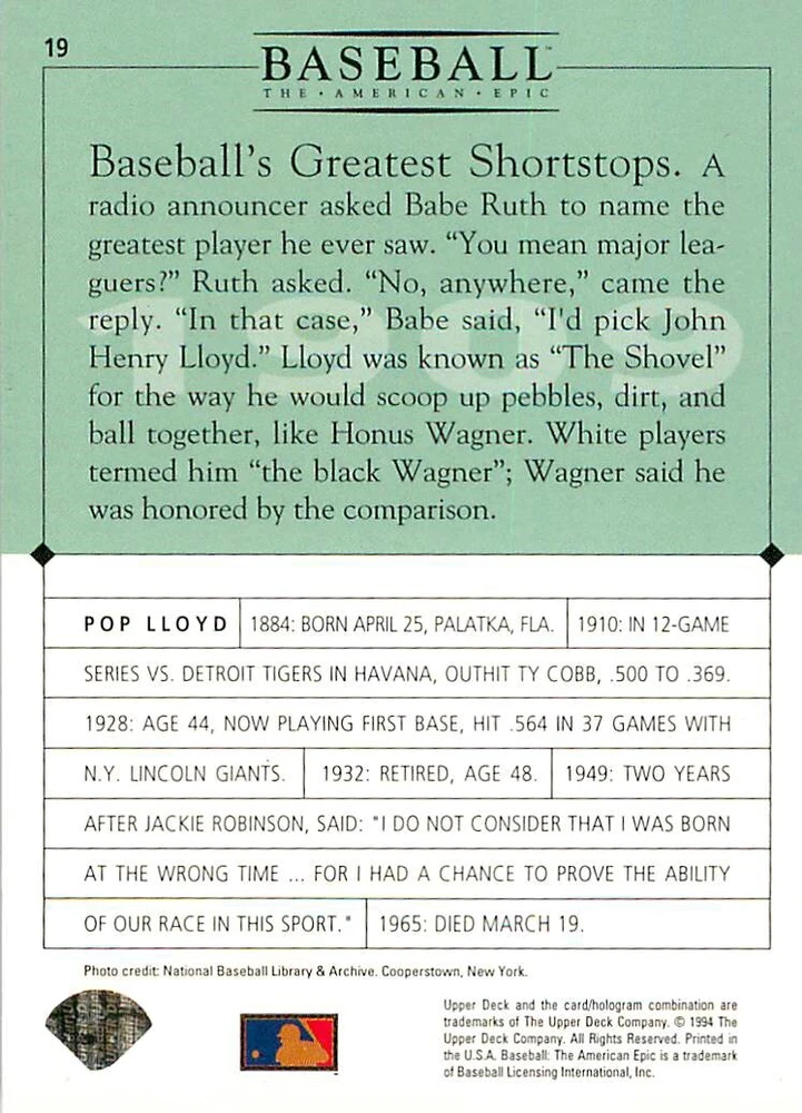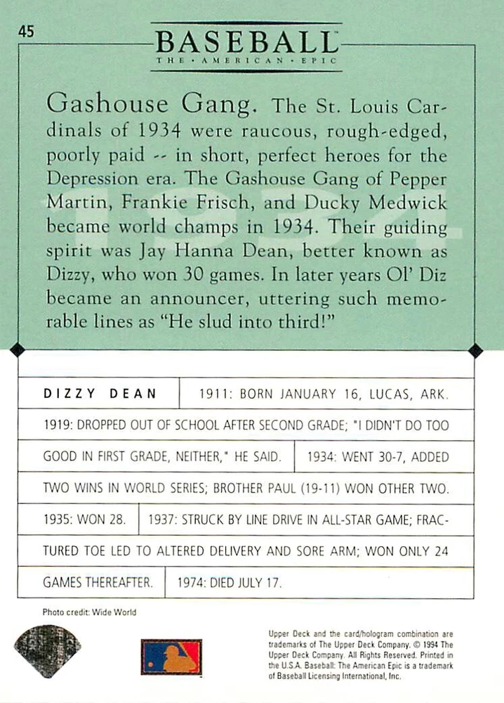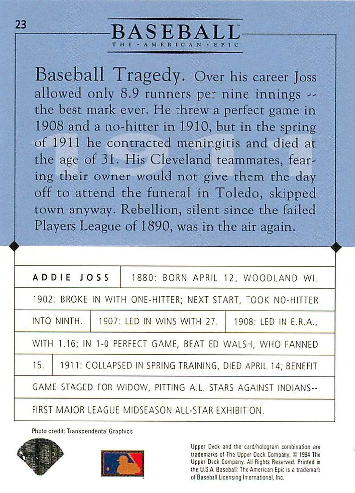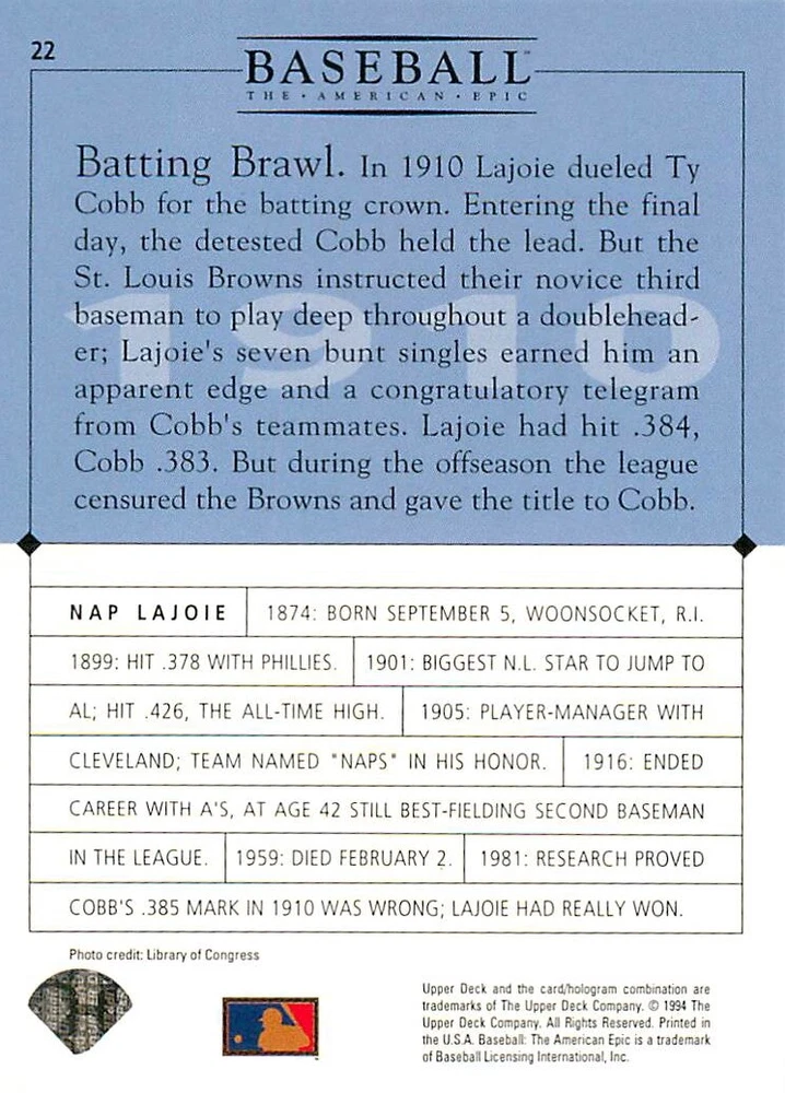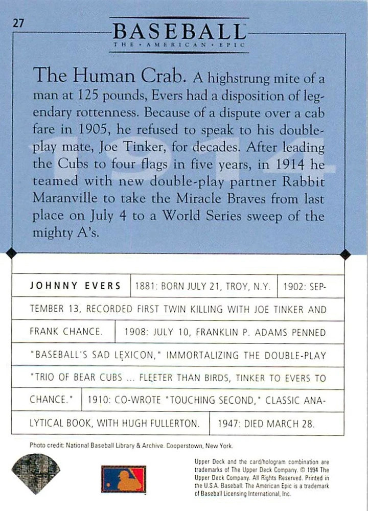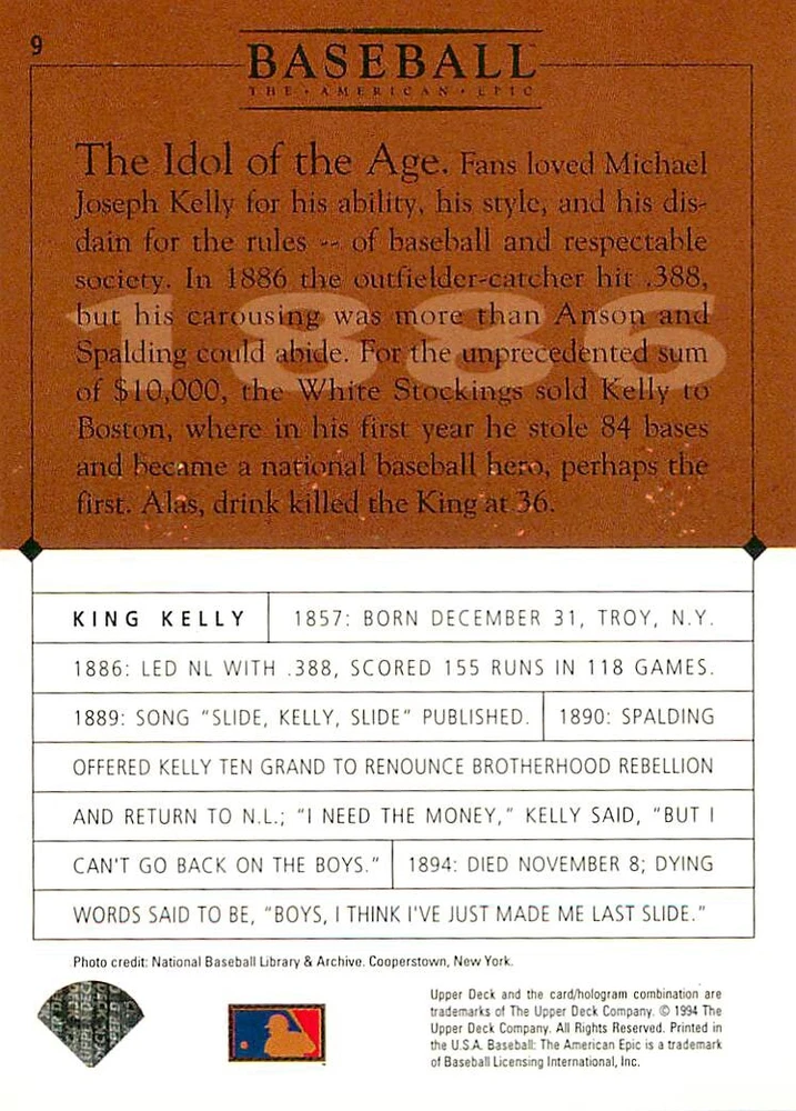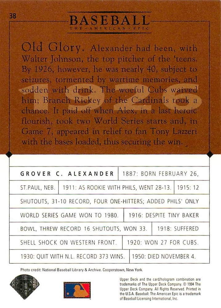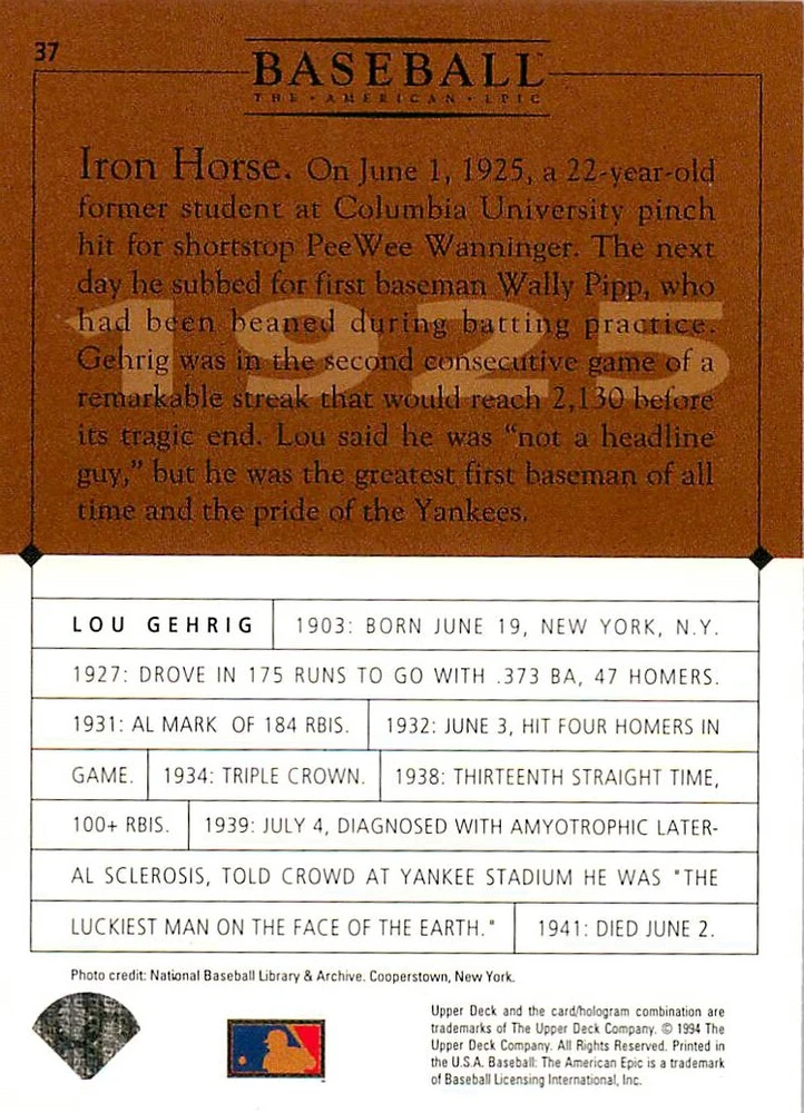 1994 Upper Deck Ken Burns Baseball THE AMERICAN EPIC - Your Choice - Baseball Card Stock pictures. We always ship the best available card, and all cards of this set go straight from the original package into a soft sleeve. Please ask for a picture of the card you want before paying if needed. $0.99 Shipping with tracking for as many cards as you'd like, if paid with one payment! Add cards to your cart from this or any of our other listings before paying for combined shipping and discounts up to 20%! 1800's Our Game 1845 Alexander Cartwright 1857 Henry Chadwick 1866 The Fair Sex 1869 Harry Wright 1876 Albert Goodwill Spaulding 1883 Cap Anson 1884 Moses Fleetwood Walker 1886 King Kelly 1890 John Montgomery Ward 1909 Ty Cobb 1904 John McGraw 1904 Rube Waddell 1905 Christy Mathewson 1907 Walter Johnson 1908 Alta Weiss 1908 Fred Merkle 1908 'Take Me Out to the Ballgame' 1909 John Henry 'Pop' Lloyd 1909 Honus Wagner 1915 Woodrow Wilson 1910 Nap Lajoie 1911 Addie Joss 1912 Joe Wood 1912 Royal Rooters 1913 Ebbets Field 1914 Johnny Evers 1918 World War I 1919 Shoeless Joe Jackson 1927 Babe Ruth 1920 George 'Rube' Foster 1920 Ray Chapman 1921 Kenesaw M. Landis 1923 Yankee Stadium 1924 Rogers Hornsby 1923 Warren G. Harding 1925 Lou Gehrig 1926 Grover C. Alexander 1929 House of David 1933 Satchel Paige 1931 Lefty Grove 1932 Jimmie Foxx 1932 Connie Mack 1937 Josh Gibson 1934 Dizzy Dean 1934 Carl Hubbell 1937 Franklin D. Roosevelt 1938 Bob Feller 1939 Cool Papa Bell 1947 Jackie Robinson 1941 Ted Williams 1941 Sym-phony Band 1944 Annabel Lee 1945 Hank Greenberg 1947 Branch Rickey 1948 Harry S. Truman 1953 Casey Stengel 1951 Bobby Thomson 1952 Dwight D. Eisenhower 1952 Mario Cuomo 1954 Buck O'Neil 1955 Yogi Berra 1956 Mickey Mantle 1956 Don Larsen 1961 John F. Kennedy 1960 Bill Mazeroski 1961 Roger Maris 1966 Frank Robinson 1968 Bob Gibson 1969 Tom Seaver 1969 Curt Flood 1972 Roberto Clemente 1975 Luis Tiant 1975 Marvin Miller 1977 Reggie Jackson 1979 Willie ' Pops' Stargell 1985 Pete Rose 1994 Bill Clinton 1991 Nolan Ryan 1993 George Brett Checklist/Title Card Economy Shipping: More than just a Plain White Envelope!! $0.99 USPS domestic shipping in a soft sleeve, toploader or cardsaver, team bag and cardboard mailer with tracking. Combined Shipping: Yes. No additional shipping charge for additional single cards . (The highest shipping charge of any single item will be the cost for the entire order.) You must add your cards to the Shopping Cart to get combined shipping. When you have all your cards in the Shopping Cart, click on the note "Request total from seller" (to the right of our store name). Please wait for an invoice with the combined shipping fees before paying. If you should have any questions, please contact us prior to paying for your items. Card Scans: Stock pictures. We always ship the best available card, and all cards of this set go straight from the original package into a soft sleeve. Please ask for a picture of the card you want before paying if needed. Returns: We offer a 30-day return policy. However, we are not responsible for shipping damage via Economy Shipping. Please contact us via eBay messages if you are unsatisfied with a card that you purchase from us. We carefully pack and ship each order, and provide tracking. We do not charge re-stocking fees. Shipping fees are not refundable, unless the error lies with how we described the card. Again, please look at the scans carefully. Feedback: We will provide prompt feedback as soon as you have received your card(s) and provided feedback for us. Our goal is 100% positive feedback, so please contact us via eBay messages if there are any issues with your shipment to see if we can provide a solution. Thanks for looking!