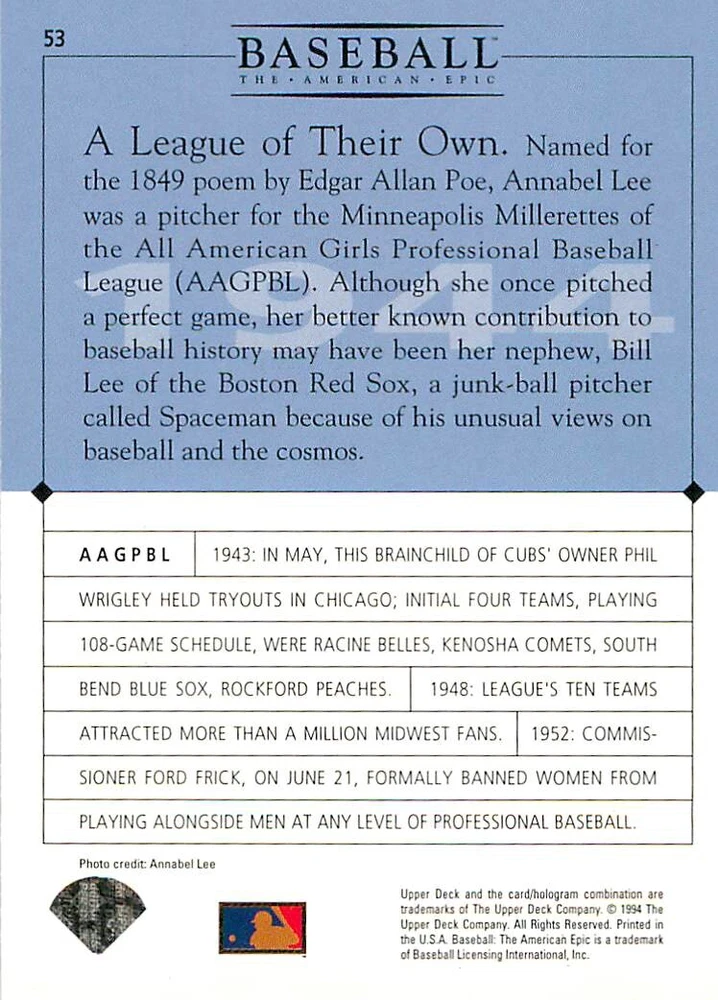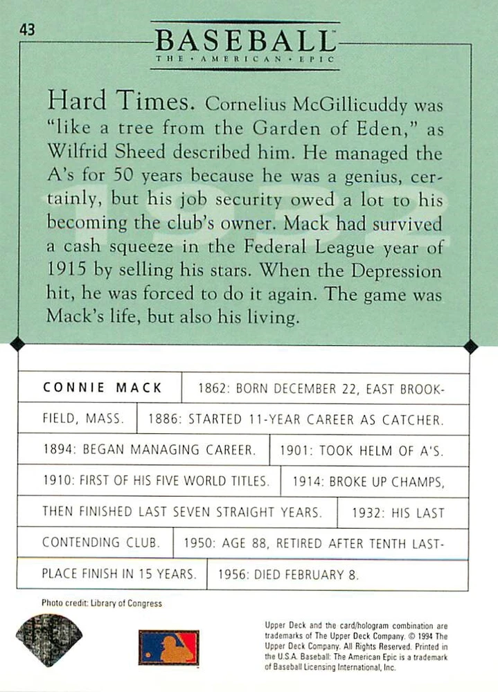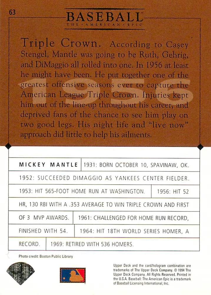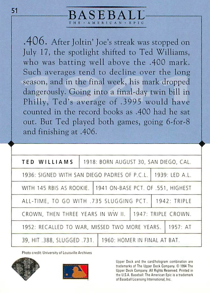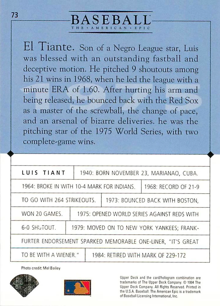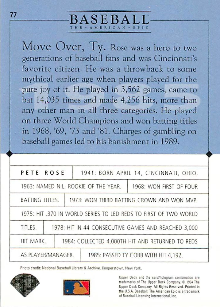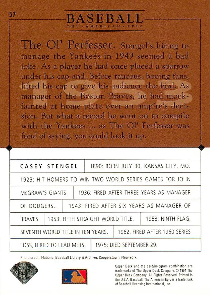 1994 Upper Deck Ken Burns Baseball THE AMERICAN EPIC - Your Choice - Baseball Card Stock pictures. We always ship the best available card, and all cards of this set go straight from the original package into a soft sleeve. Please ask for a picture of the card you want before paying if needed. $0.99 Shipping with tracking for as many cards as you'd like, if paid with one payment! Add cards to your cart from this or any of our other listings before paying for combined shipping and discounts up to 20%! 1800's Our Game 1845 Alexander Cartwright 1857 Henry Chadwick 1866 The Fair Sex 1869 Harry Wright 1876 Albert Goodwill Spaulding 1883 Cap Anson 1884 Moses Fleetwood Walker 1886 King Kelly 1890 John Montgomery Ward 1909 Ty Cobb 1904 John McGraw 1904 Rube Waddell 1905 Christy Mathewson 1907 Walter Johnson 1908 Alta Weiss 1908 Fred Merkle 1908 'Take Me Out to the Ballgame' 1909 John Henry 'Pop' Lloyd 1909 Honus Wagner 1915 Woodrow Wilson 1910 Nap Lajoie 1911 Addie Joss 1912 Joe Wood 1912 Royal Rooters 1913 Ebbets Field 1914 Johnny Evers 1918 World War I 1919 Shoeless Joe Jackson 1927 Babe Ruth 1920 George 'Rube' Foster 1920 Ray Chapman 1921 Kenesaw M. Landis 1923 Yankee Stadium 1924 Rogers Hornsby 1923 Warren G. Harding 1925 Lou Gehrig 1926 Grover C. Alexander 1929 House of David 1933 Satchel Paige 1931 Lefty Grove 1932 Jimmie Foxx 1932 Connie Mack 1937 Josh Gibson 1934 Dizzy Dean 1934 Carl Hubbell 1937 Franklin D. Roosevelt 1938 Bob Feller 1939 Cool Papa Bell 1947 Jackie Robinson 1941 Ted Williams 1941 Sym-phony Band 1944 Annabel Lee 1945 Hank Greenberg 1947 Branch Rickey 1948 Harry S. Truman 1953 Casey Stengel 1951 Bobby Thomson 1952 Dwight D. Eisenhower 1952 Mario Cuomo 1954 Buck O'Neil 1955 Yogi Berra 1956 Mickey Mantle 1956 Don Larsen 1961 John F. Kennedy 1960 Bill Mazeroski 1961 Roger Maris 1966 Frank Robinson 1968 Bob Gibson 1969 Tom Seaver 1969 Curt Flood 1972 Roberto Clemente 1975 Luis Tiant 1975 Marvin Miller 1977 Reggie Jackson 1979 Willie ' Pops' Stargell 1985 Pete Rose 1994 Bill Clinton 1991 Nolan Ryan 1993 George Brett Checklist/Title Card Economy Shipping: More than just a Plain White Envelope!! $0.99 USPS domestic shipping in a soft sleeve, toploader or cardsaver, team bag and cardboard mailer with tracking. Combined Shipping: Yes. No additional shipping charge for additional single cards . (The highest shipping charge of any single item will be the cost for the entire order.) You must add your cards to the Shopping Cart to get combined shipping. When you have all your cards in the Shopping Cart, click on the note "Request total from seller" (to the right of our store name). Please wait for an invoice with the combined shipping fees before paying. If you should have any questions, please contact us prior to paying for your items. Card Scans: Stock pictures. We always ship the best available card, and all cards of this set go straight from the original package into a soft sleeve. Please ask for a picture of the card you want before paying if needed. Returns: We offer a 30-day return policy. However, we are not responsible for shipping damage via Economy Shipping. Please contact us via eBay messages if you are unsatisfied with a card that you purchase from us. We carefully pack and ship each order, and provide tracking. We do not charge re-stocking fees. Shipping fees are not refundable, unless the error lies with how we described the card. Again, please look at the scans carefully. Feedback: We will provide prompt feedback as soon as you have received your card(s) and provided feedback for us. Our goal is 100% positive feedback, so please contact us via eBay messages if there are any issues with your shipment to see if we can provide a solution. Thanks for looking!