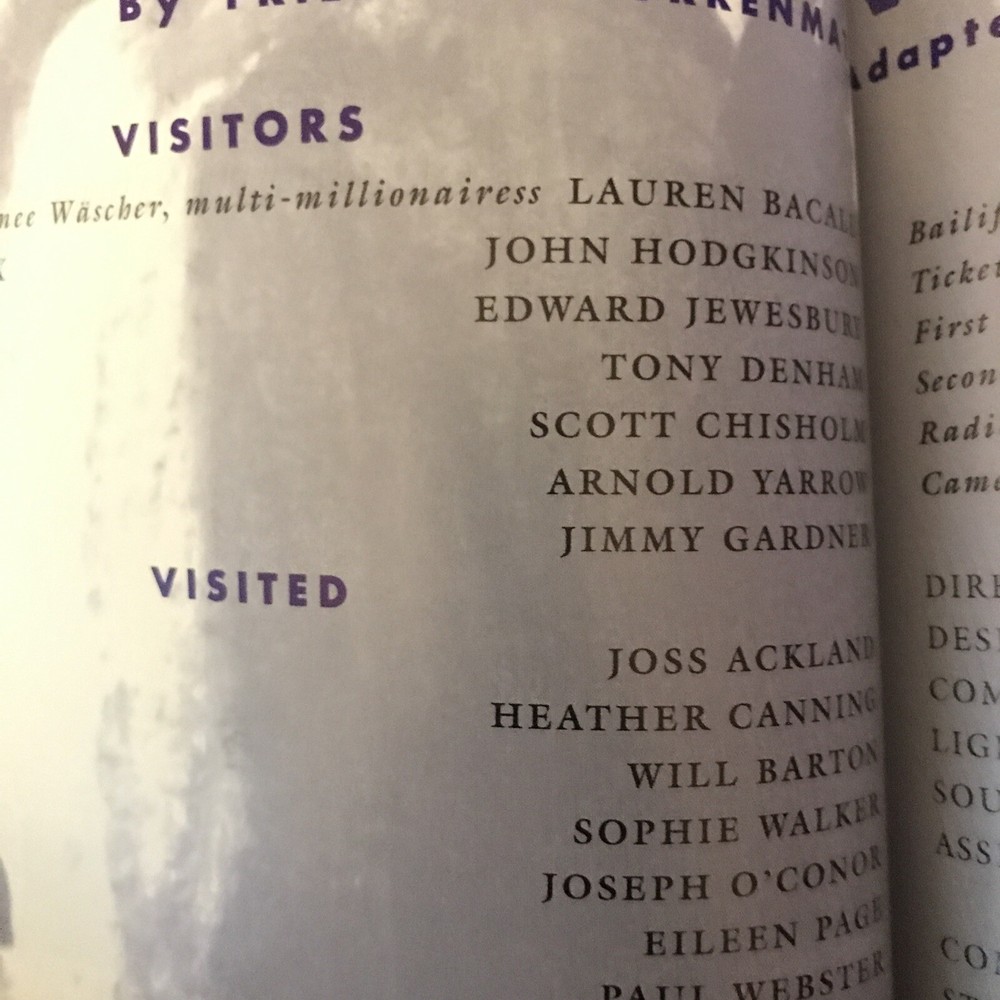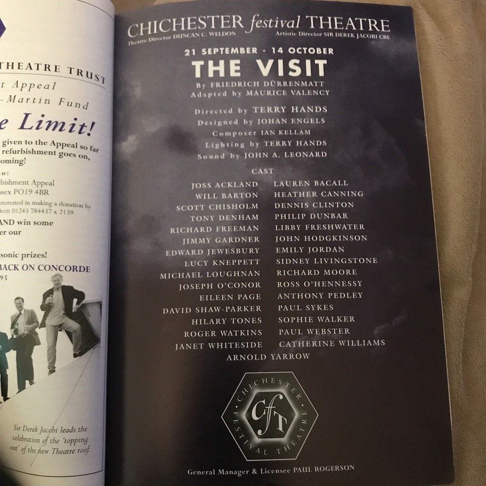 This theatre programme features the 1995 production of "The Visit" at Chichester Festival, starring Lauren Bacall and Joss Ackland. The original programme includes a Playbill from the same production. This piece is a unique and original item from the 1990s theatre scene in the United Kingdom, showcasing the notable performances of Bacall and Ackland in this particular play. SIGNED BY JOSS ACKLAND. SEPARATE PLAYBILL. EXCELLENT CONDITION ALL ROUND.
