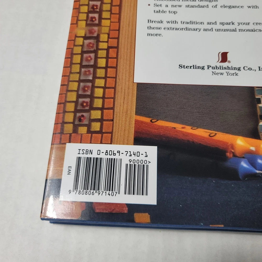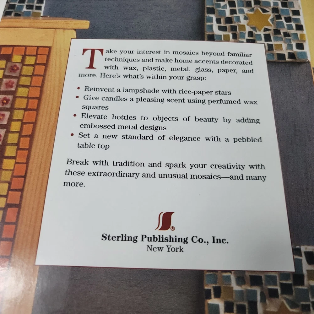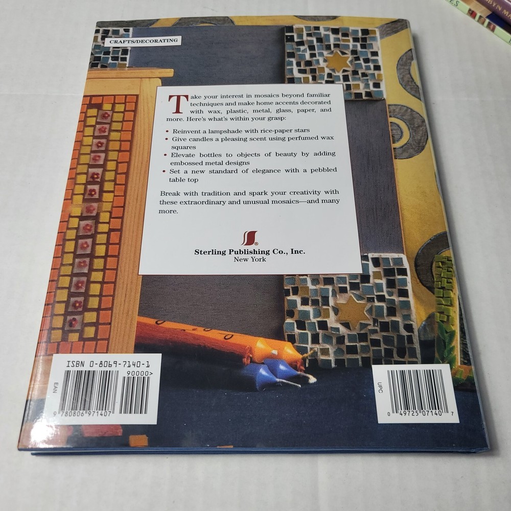 For sale is a 1998 copy of "Creative Mosaics" by Monica Cresci & Chiara Di Pinto. The book provides unusual mosaic techniques using a variety of mediums including wax, plastic, metal, glass and paper. The book is in good used condition with minor shelf wear.