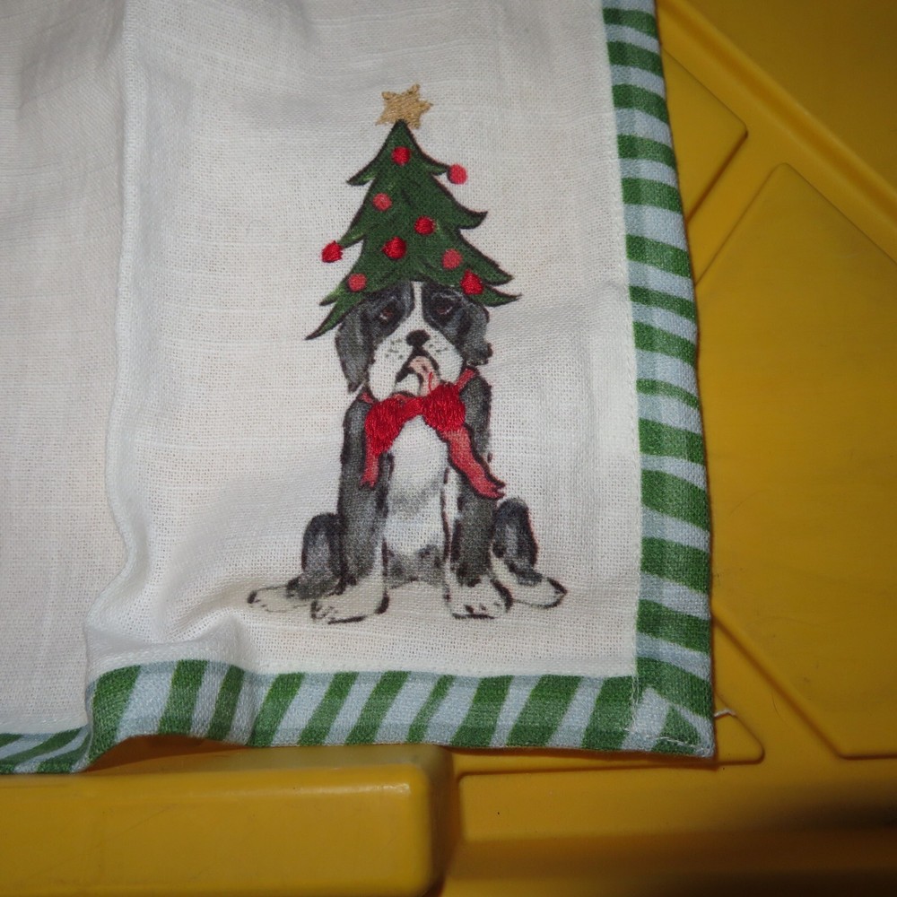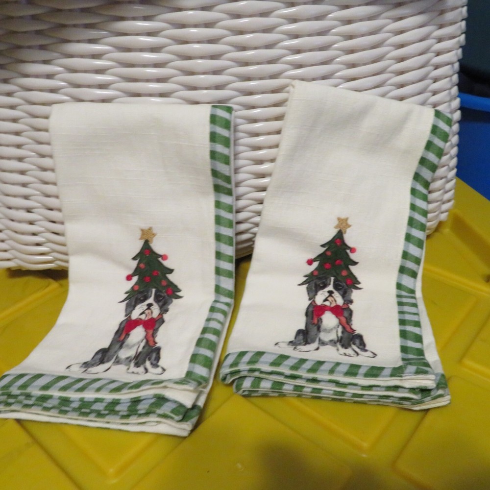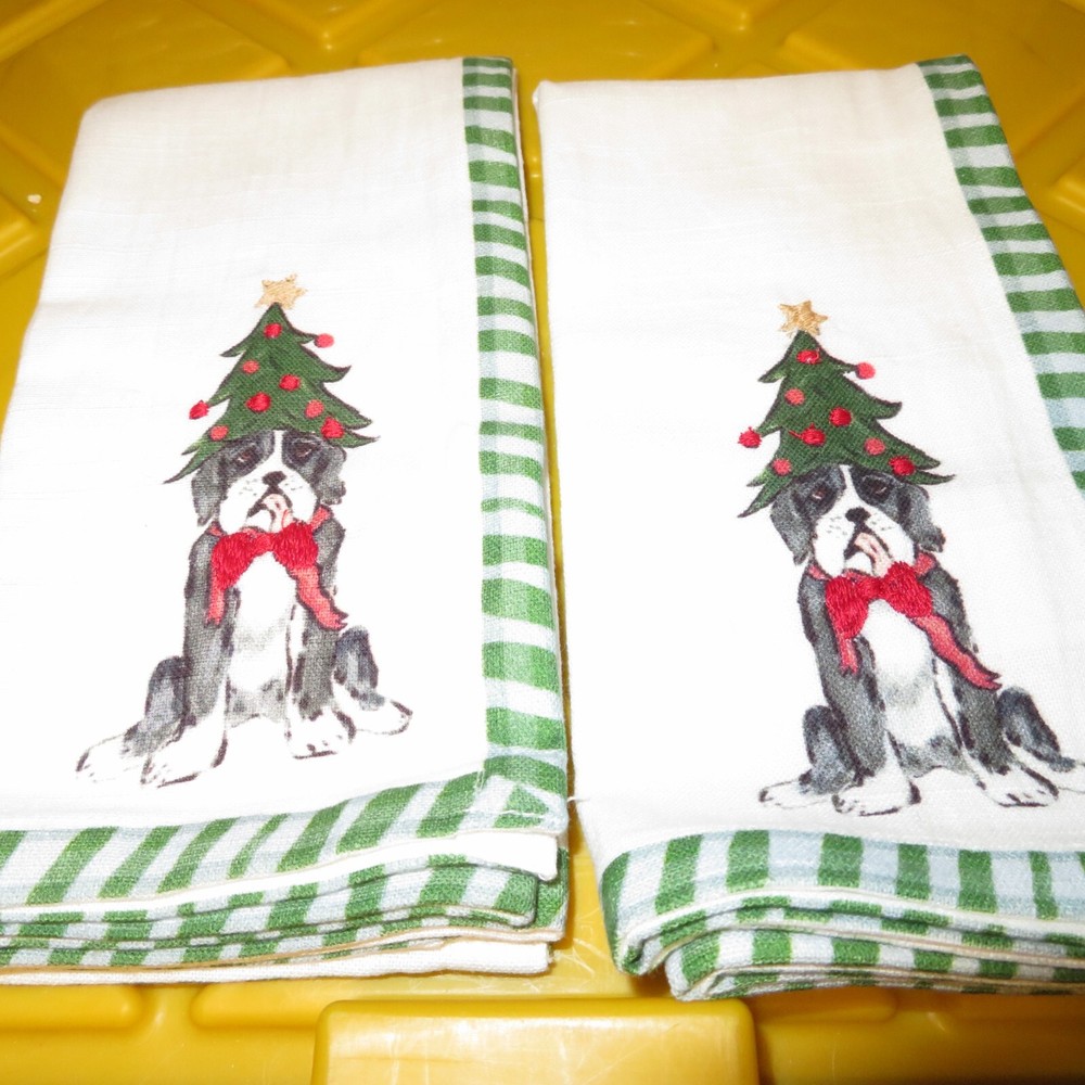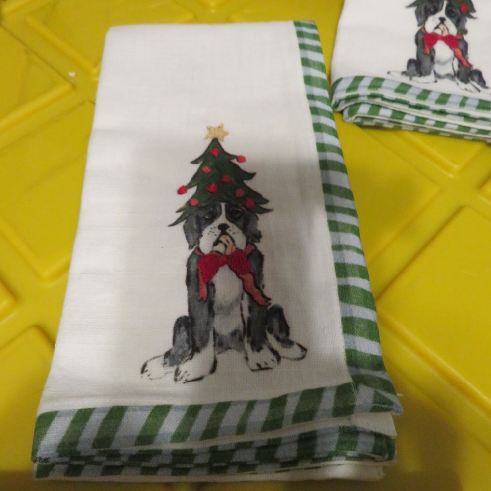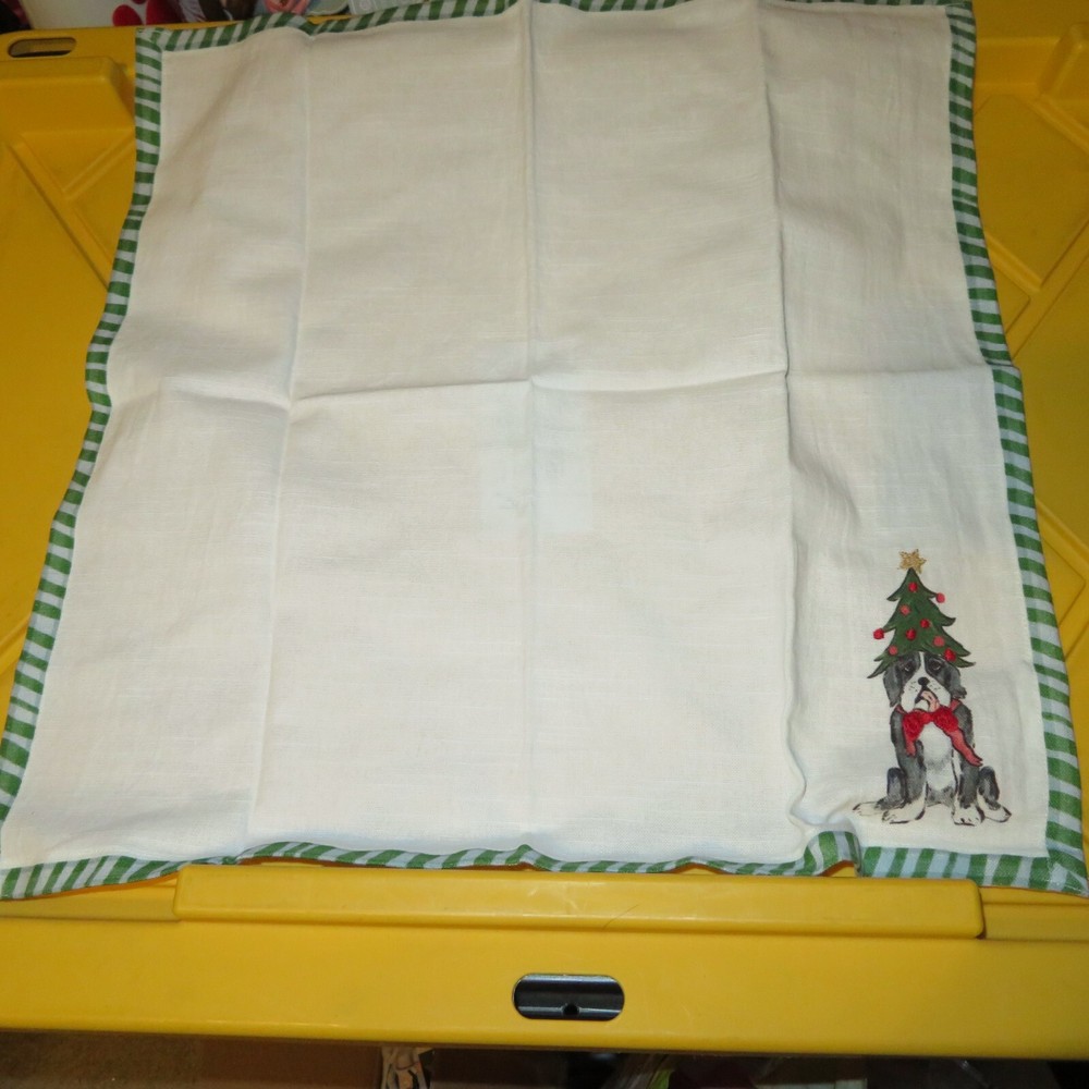 (2) Creative Co-op 18" Square Cotton Printed Napkin Dog Embroidered Holiday NEW This is for a set of 2 18" square cotton Napkins from Creative Co-op Cute dog wearing a christmas tree is decorated in the right bottom corner of the napkins.
