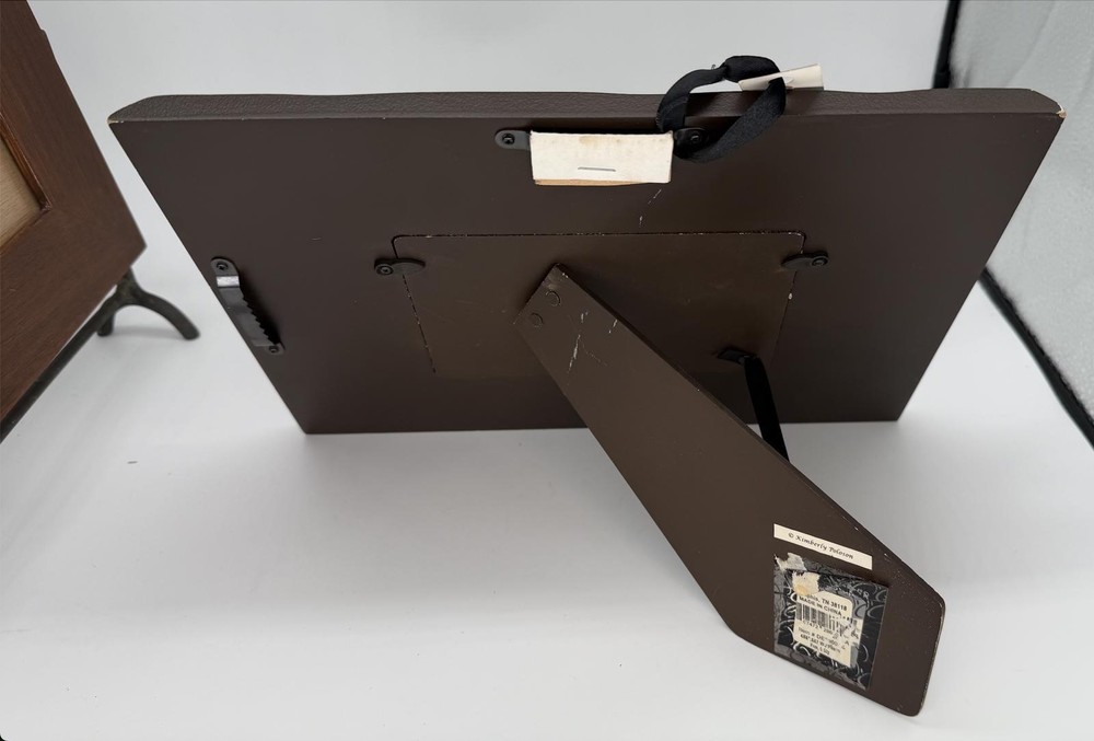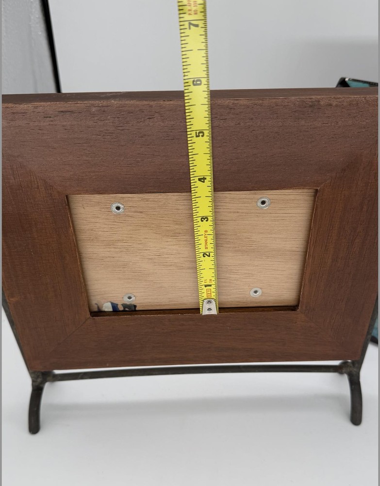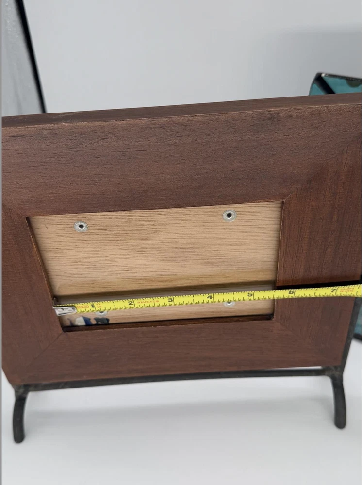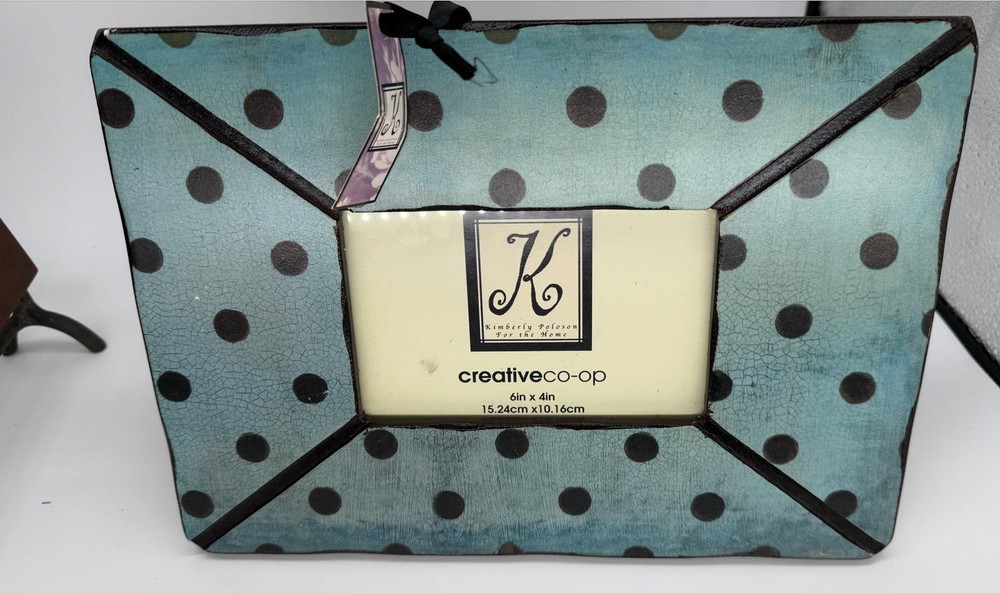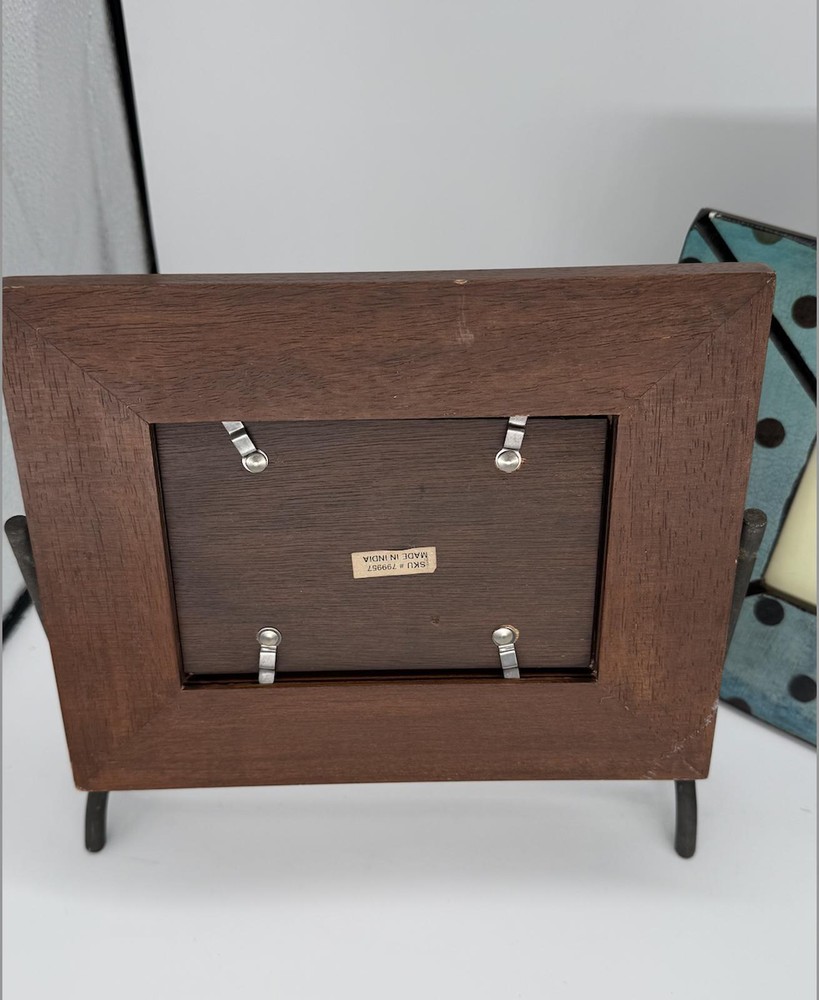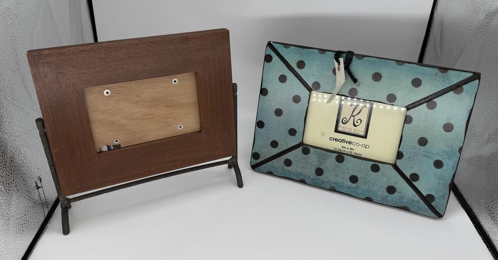 Lot of 2 charming tabletop photo frames. First is a rustic solid wood frame made in India, holds approx. 4"x6" photo, supported by sturdy cast metal legs. Second is a playful Creative Co-Op frame designed by Kimberly Polson, features distressed teal crackle finish with black polka dots, fits 4"x6" photo (15.24 x 10.16 cm). Both include original backings and are ready to display. Great mix of classic and quirky styles for any home!