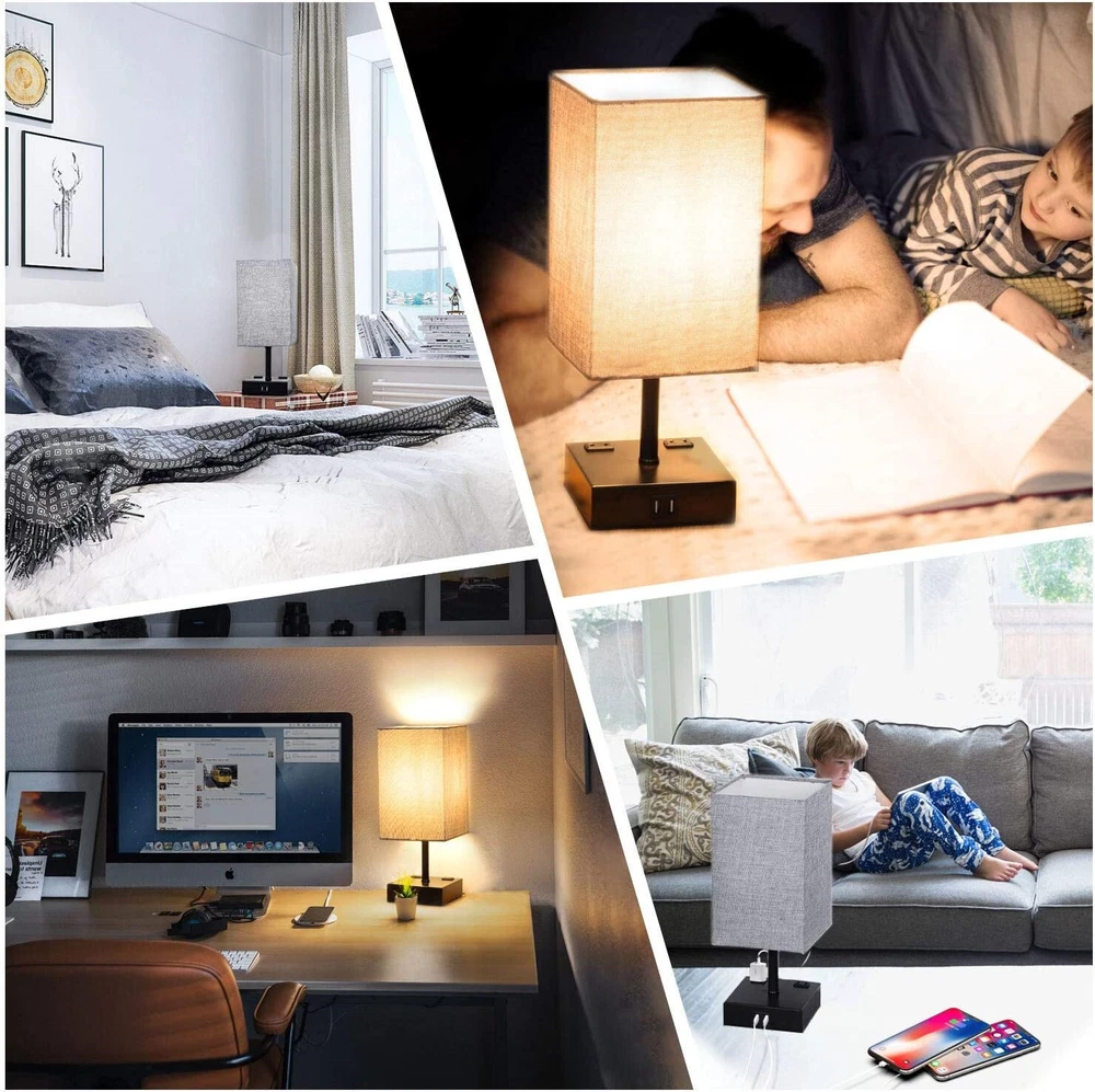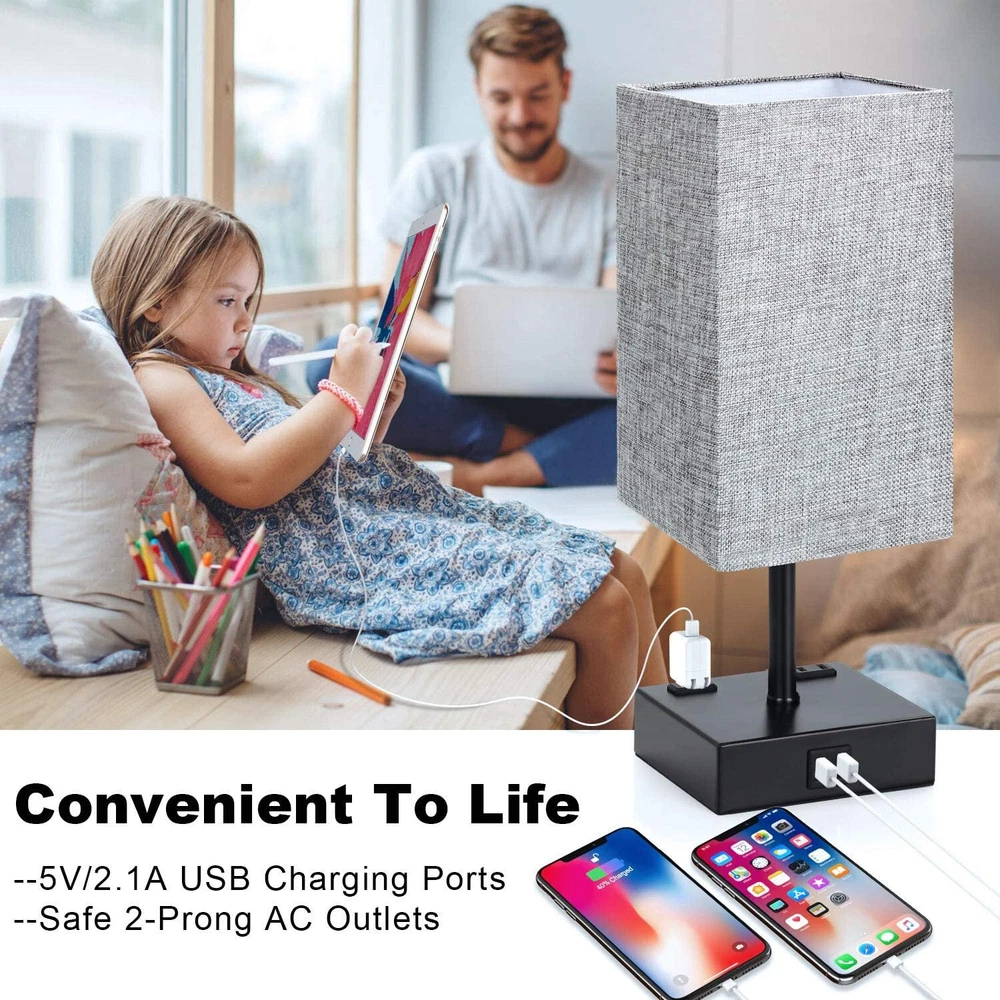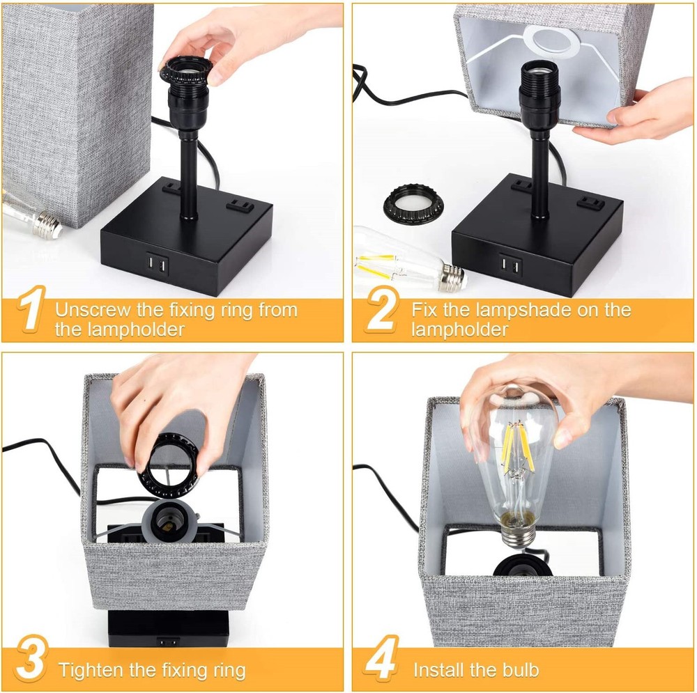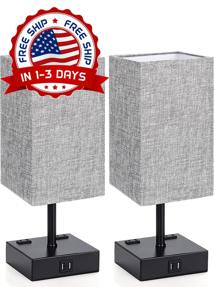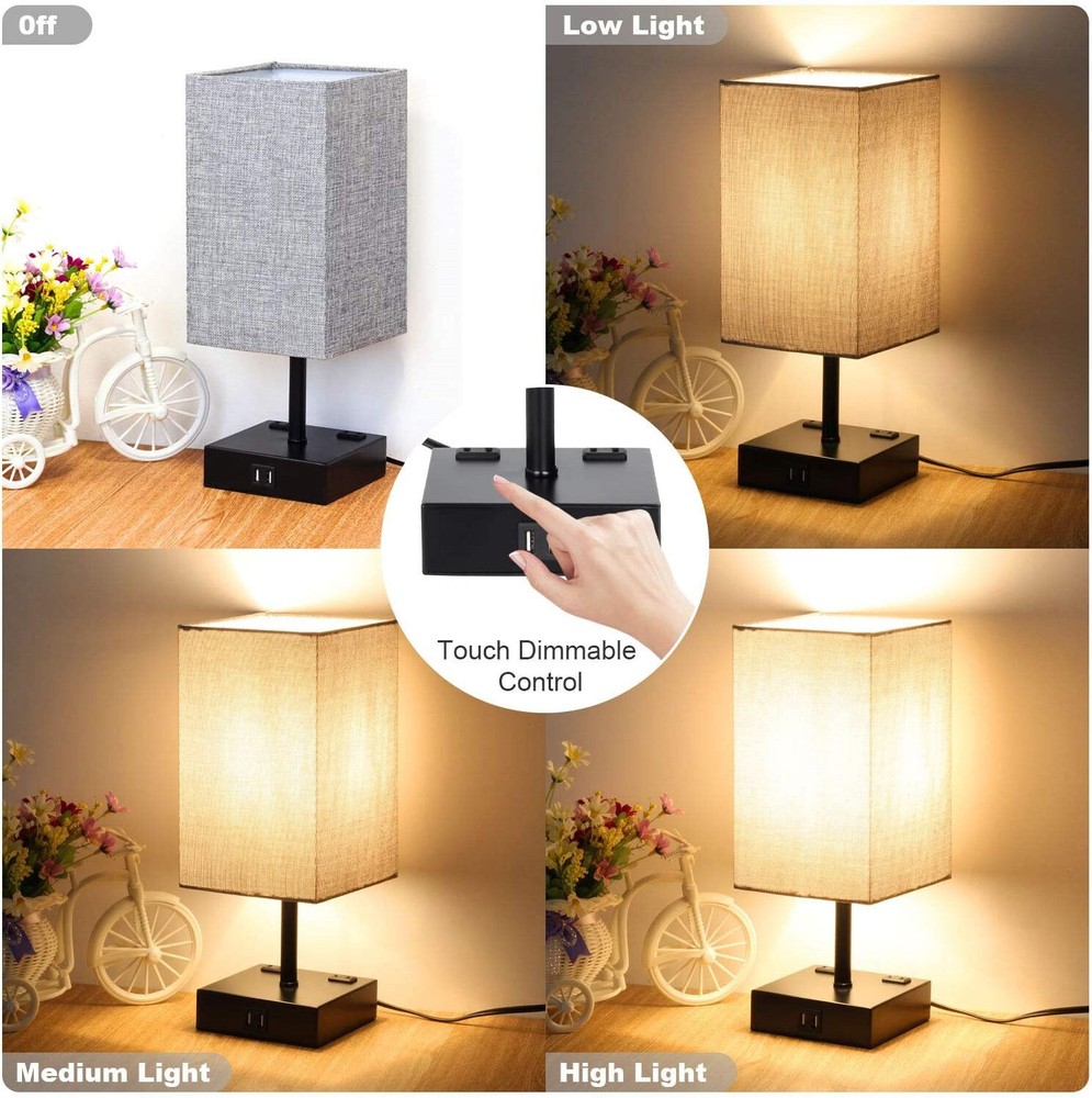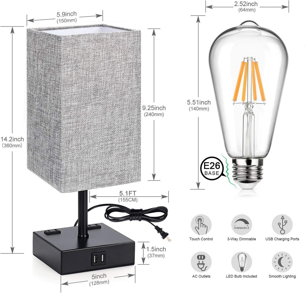 2 Lamparas De Mesita Noche LUJO Lampara Mesa Dormitorio Retro USB Bedside Lamp Diseño de control táctil regulable de 3 vías: la lámpara de mesita de noche regulable ofrece 3 opciones de nivel de brillo (bajo, medio, alto), simplemente tocando cualquier parte de la base de metal para ajustar la iluminación a la configuración perfecta, perfecta para el estado de ánimo de la mesita de noche. , acento decorativo o luz de trabajo brillante. Esta lámpara sensible al tacto puede ser controlada fácilmente por personas de todas las edades. 🎈【Puertos de carga USB duales y salidas de CA duales】: la lámpara de mesa con control táctil agrega más comodidad a su vida con sus puertos de carga USB duales incorporados (5V/2.1A) y salidas de CA duales (2 clavijas). Eso significa que puede cargar sus teléfonos móviles, iPads, computadoras portátiles, tabletas, Kindle u otros dispositivos electrónicos al mismo tiempo, independientemente de si la lámpara de escritorio está encendida o apagada, lo que le permite ahorrar tiempo y energía. 🎈【Diseño minimalista para el hogar】- La dimensión de la lámpara de mesa regulable es de 5.9"(L)x5.9"(W)x14.2"(H). Longitud del cable: 5.1ft/155cm. El tamaño de la lámpara pequeña es perfecta para decorar cualquier lugar de tu casa. Una lámpara de mesa USB perfecta para la sala de estar, el dormitorio, la sala de estudio, la habitación de los niños, la sala de estar, la guardería. ¡También es un regalo maravilloso para cualquier persona! 🎈【Aspecto elegante en su habitación】: esta lámpara de mesa con control táctil regulable está diseñada con una pantalla de tela gris y una base de metal negro. La lámpara gris es para suavizar el brillo de la iluminación, cuidando tu vista. Difunde una iluminación uniforme, cómoda y relajante al mismo tiempo que aporta un aspecto sencillo y moderno a su hogar. 🎈【Bombillas LED ST64 regulables clásicas incluidas】 - Para combinar perfectamente con la lámpara de mesa de 3 vías, designamos específicamente estas bombillas LED regulables de 6 W en forma de Edison tradicional que equivalen a bombillas incandescentes de 60 W, ahorrando hasta un 90 % de energía. La bombilla LED E26 viene en 2700 K con un brillo de 800 lm, lo que produce una iluminación brillante y estable con una baja emisión de calor. Sin parpadeos ni zumbidos. Seguro para la vista de la familia.