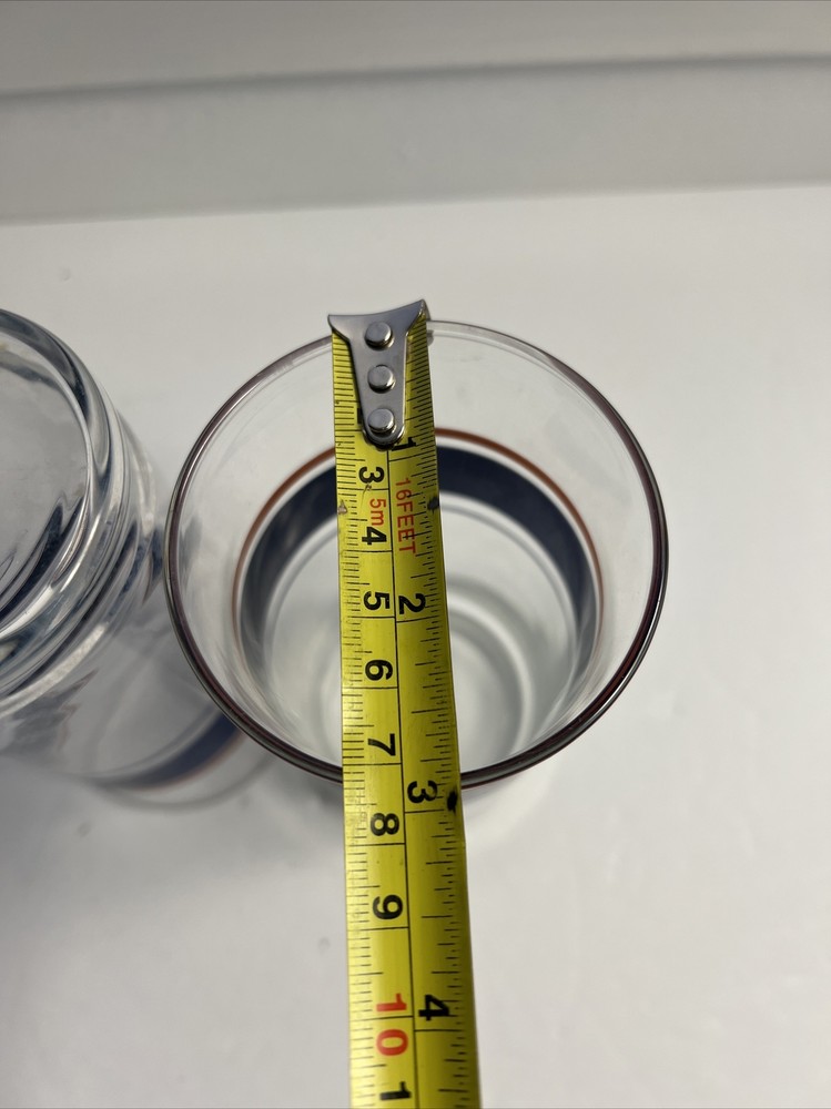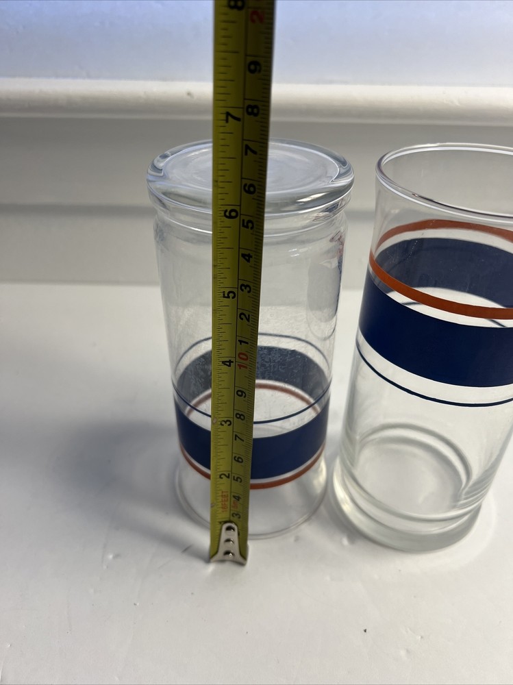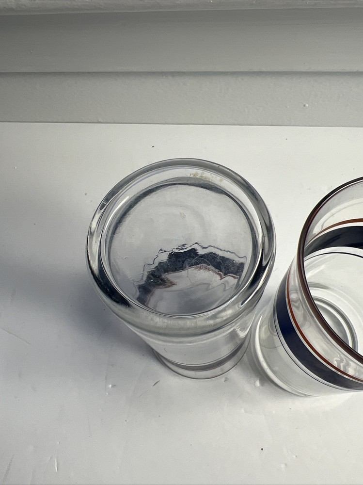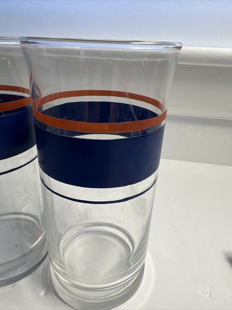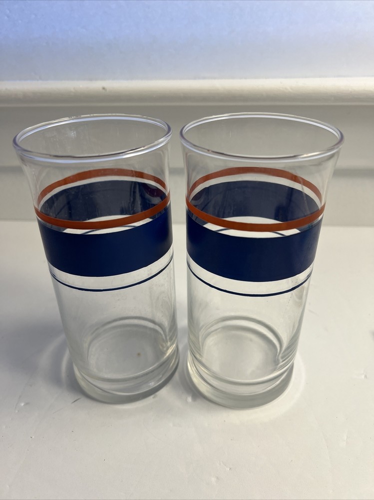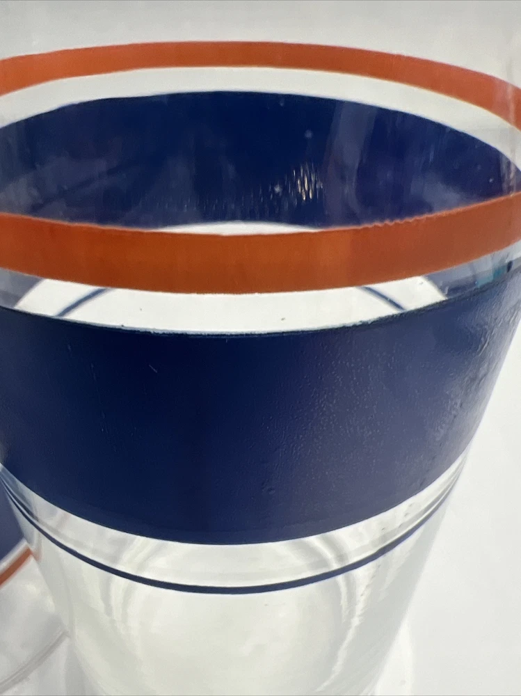 This set of two glasses boasts a stylish mid-century modern design with blue and orange horizontal stripes, perfect for adding a touch of retro flair to any barware collection. The round shape and material of the glasses are ideal for serving cold beverages, and the set includes a hurricane glass and a cocktail glass. These glasses are vintage and have an unknown country of origin. They belong to the category of collectibles and kitchen & home, specifically glassware & drinkware. With a service for two, these cocktail & hurricane glasses are the perfect addition to any home bar.