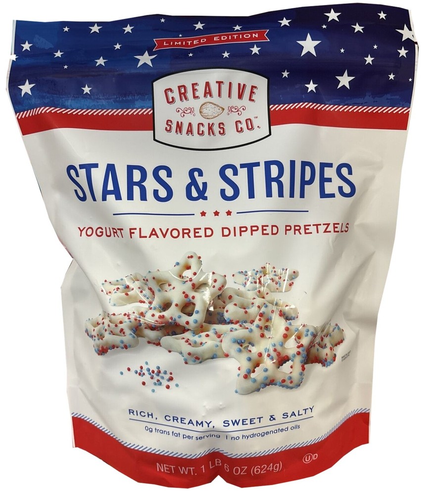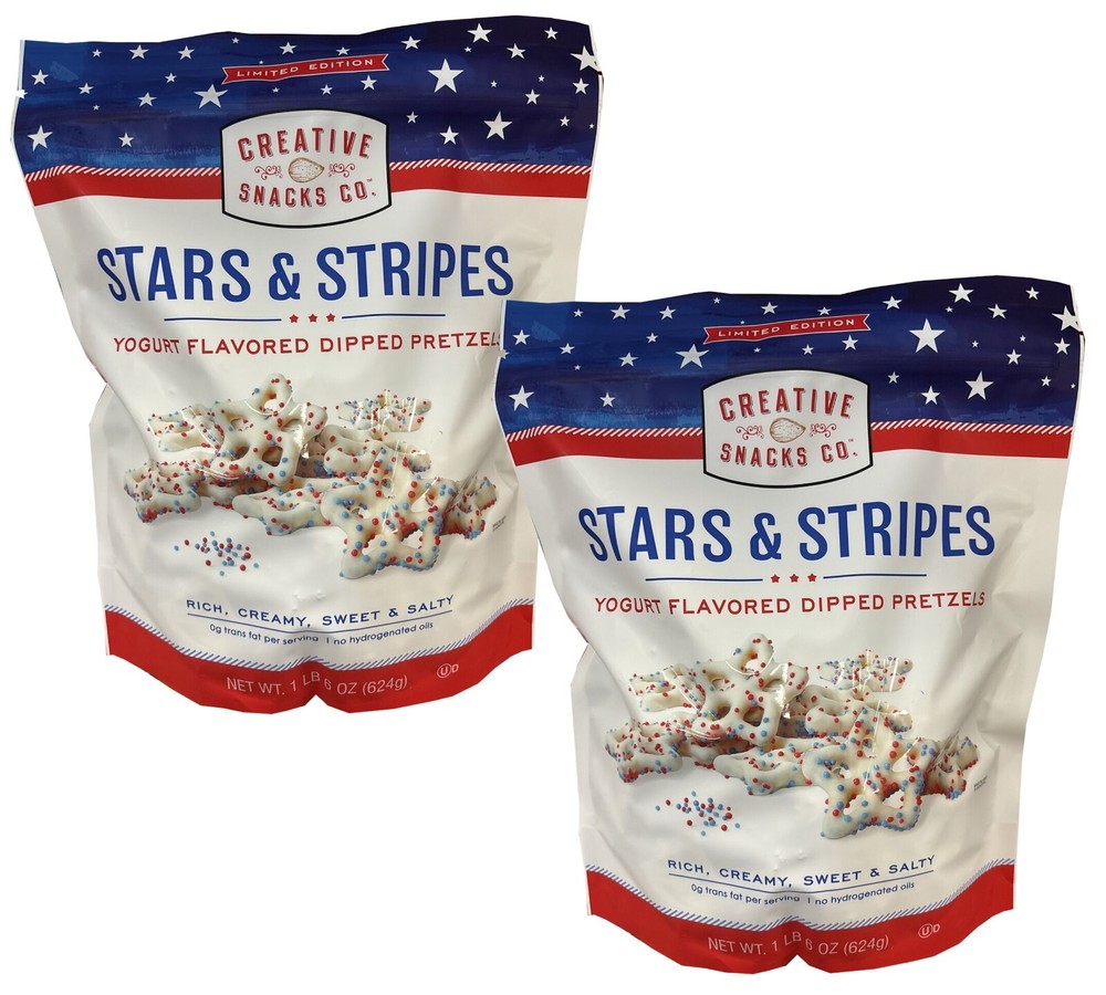 Indulge in the delicious taste of Creative Snacks Co. Stars & Stripes Yogurt Flavored Dipped Pretzels. Each pack contains 22oz of crispy pretzels dipped in creamy yogurt flavor, perfect for snacking anytime. These pretzels are hydrogenated oil-free and have only 140 calories per serving, making them a guilt-free snack option. Made in the United States, these pretzels are a perfect representation of American regional cuisine, and are a great addition to any pantry. The pack contains 2 bags, each with 21 servings of 4 pretzels. Enjoy these yummy snacks while watching your favorite TV show or movie, or as an appetizer for your next gathering.