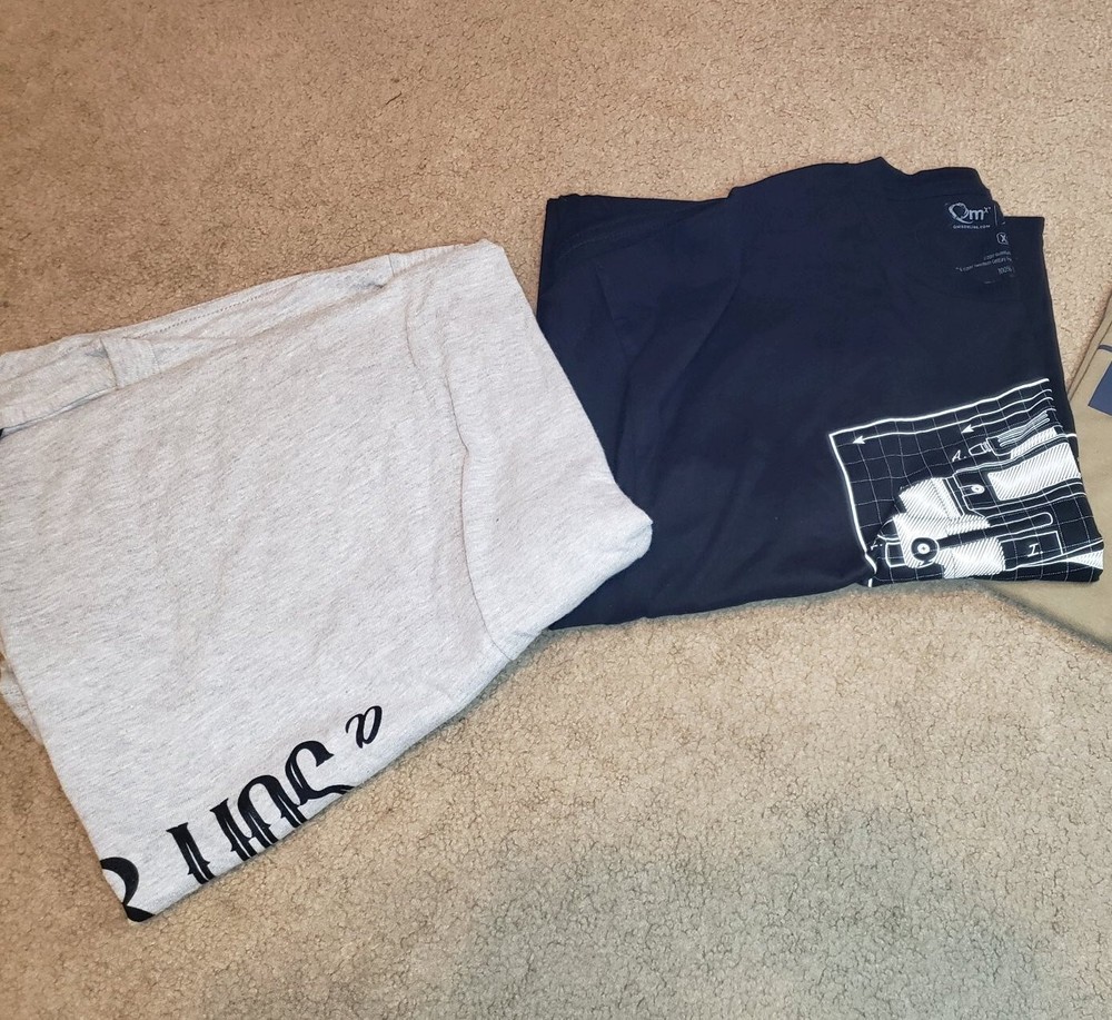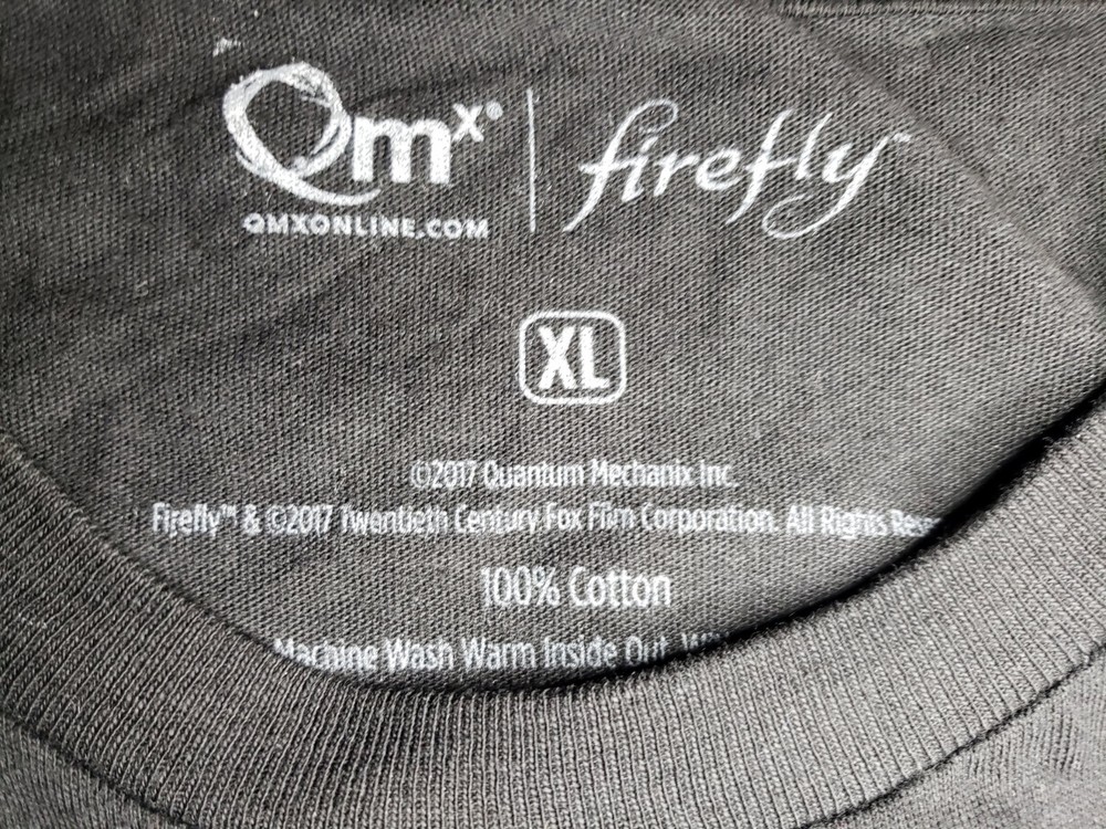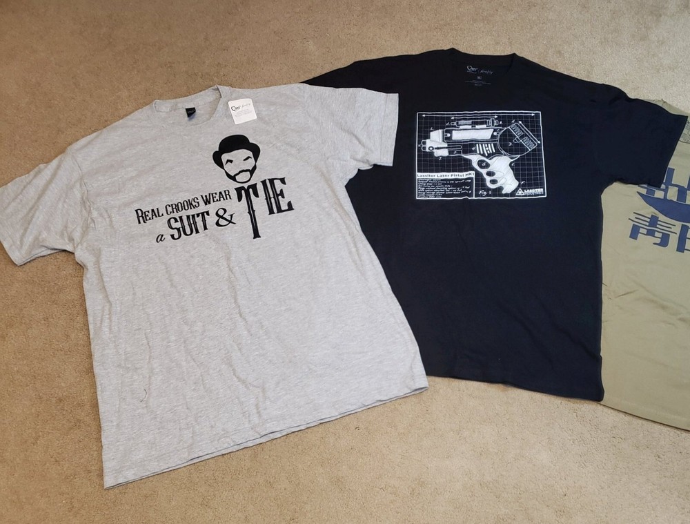 Any browncoats out there want 2 new, never worn Firefly-themed size XL t-shirts? I wear either M or L so these are just a little to big for me. One is 100% cotton, the other is 90% cotton 10% polyester. If you can't tell from the pictures, the two shirts are: - Lassiter Laser Pistol MK1 Gun Blueprint - Badger Real Crooks wear a suit & tie (The Blue Sun sleeveless shirt that you can partially see in one of the pics is not included) General Info: The item(s) will be securely packed and shipped from California, usually the same day or the next day. Everything is sold as-is. Returns will not be accepted unless the condition of the item(s) was misrepresented (which is very rare of and would obviously be unintentional). We all want a positive outcome so please read the description, look at the pictures, and ask any questions before bidding/buying.
