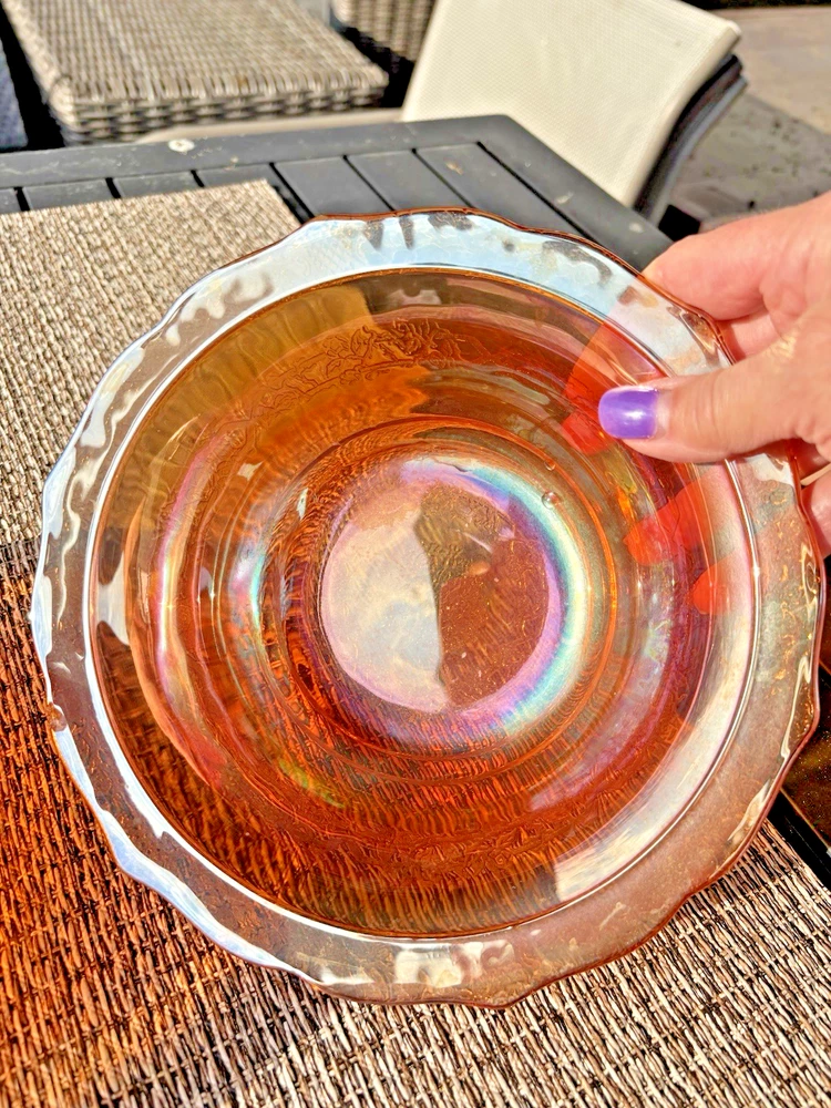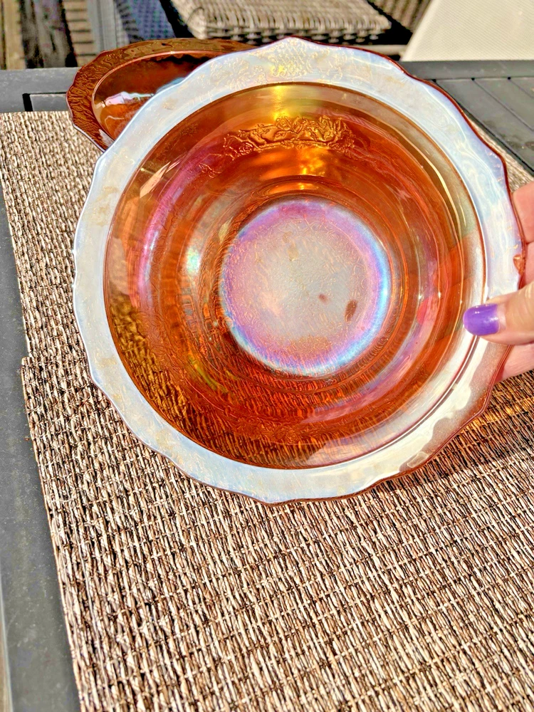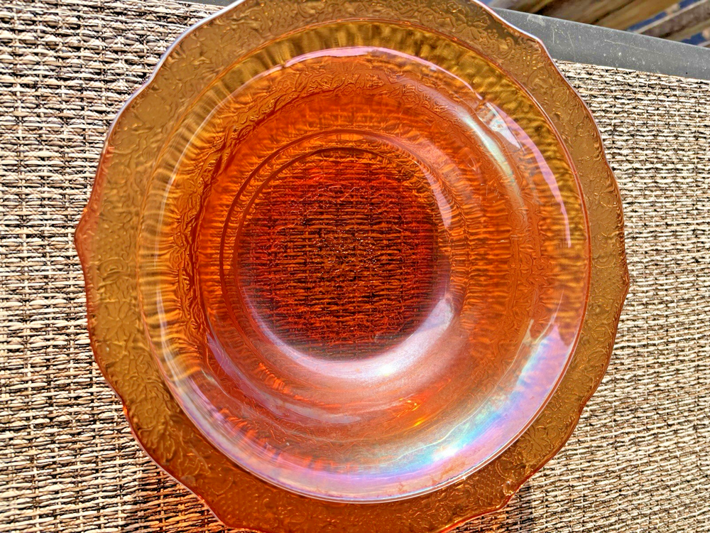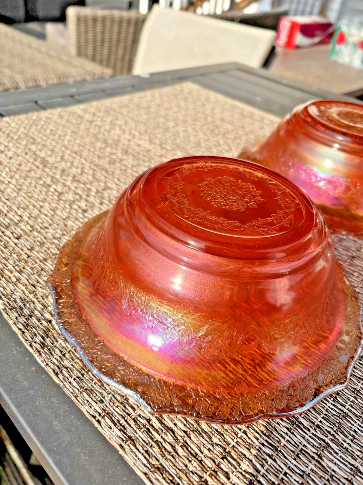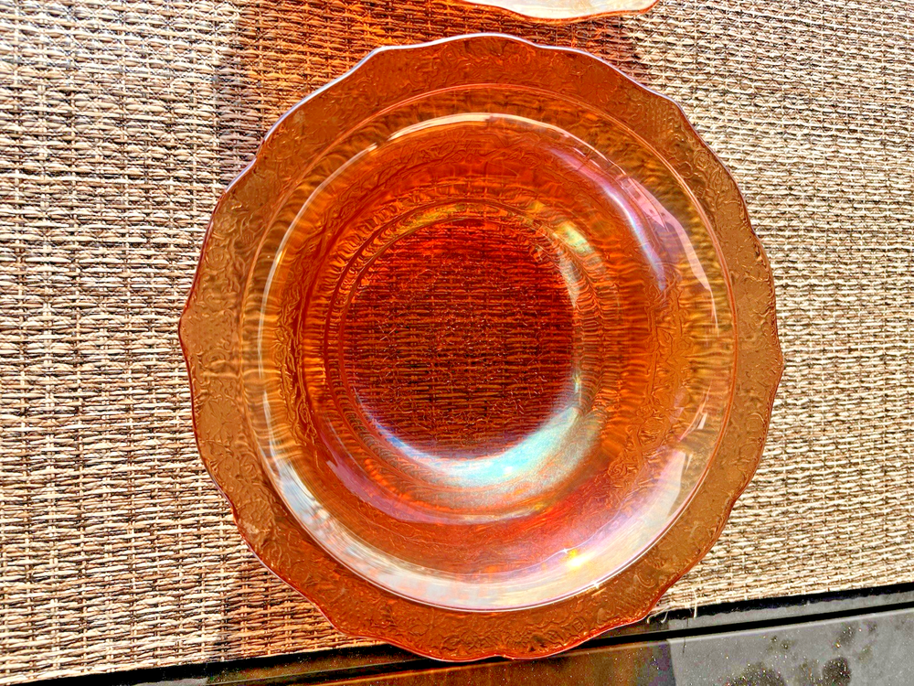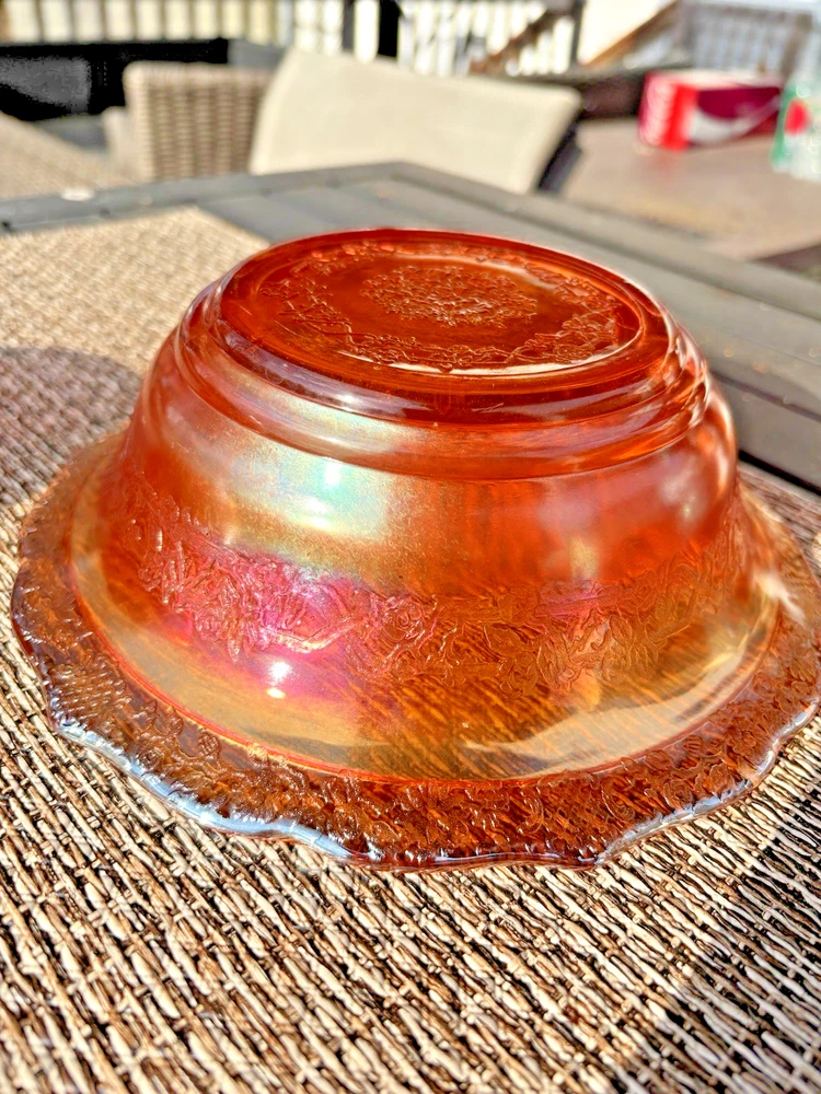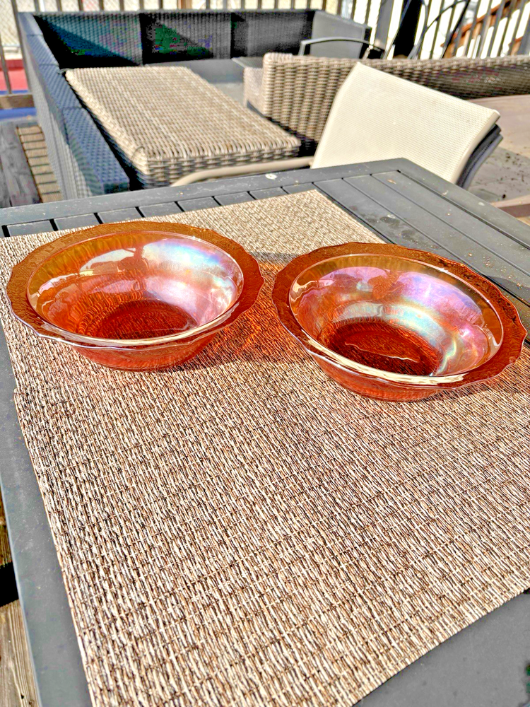 This vintage carnival glass bowl in orange and gold, dating back to the mid-1900s, features an unusual pattern that adds a unique touch to any décor. The set includes two pieces, both mid-century modern in style with an iridescent finish. Made of glass, these bowls are a nostalgic addition to any collection, perfect for displaying or serving snacks in a decorative way. With its vibrant color and vintage appeal, this set is sure to stand out in any room. **1 bowl is perfect-no chips, cracks. 1 bowl has a small chip on the rim (see last 3 pictures). Pricing is for 1 bowl. Bowl with chip is being included for free-due to chip.