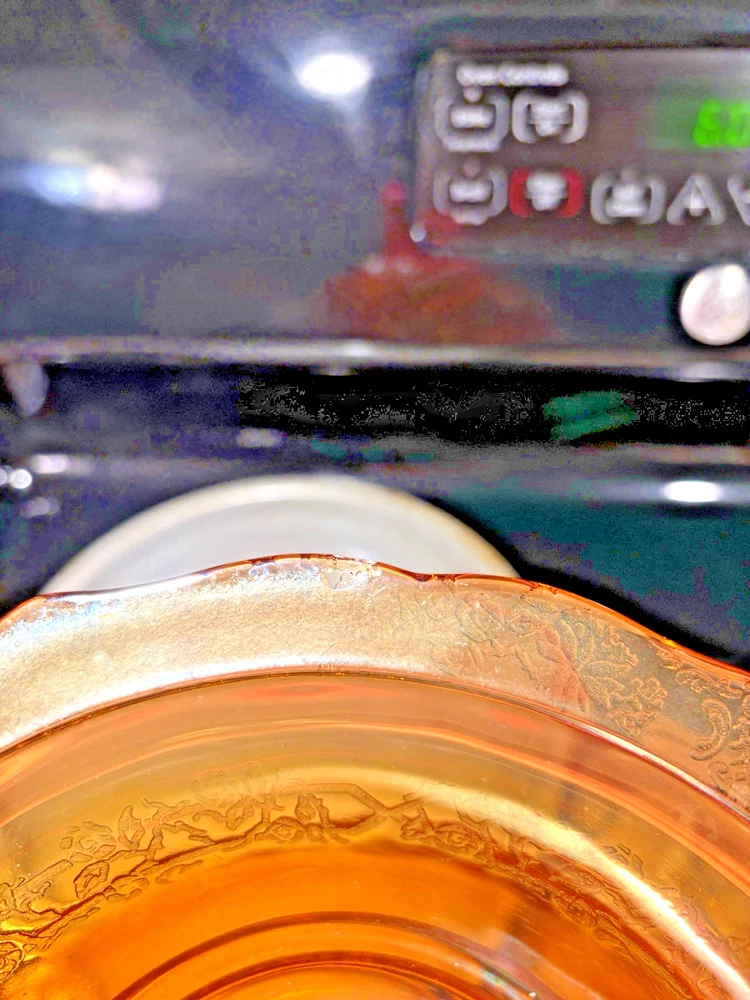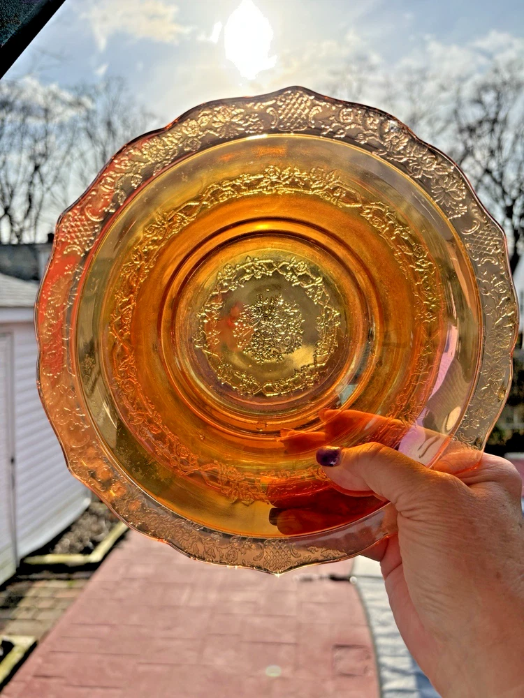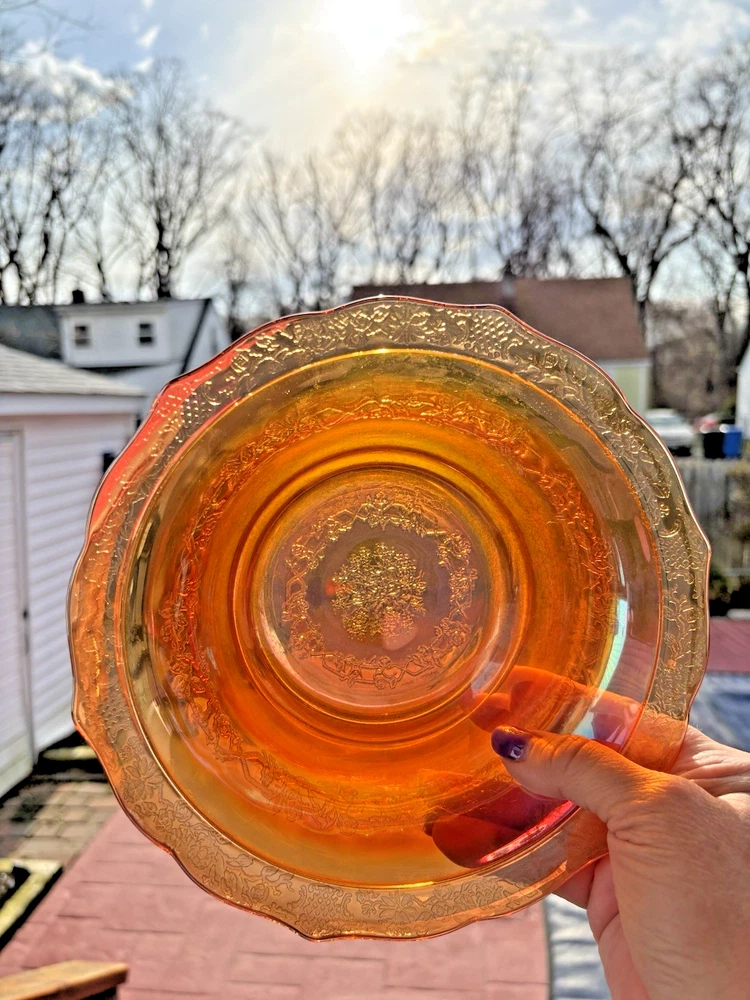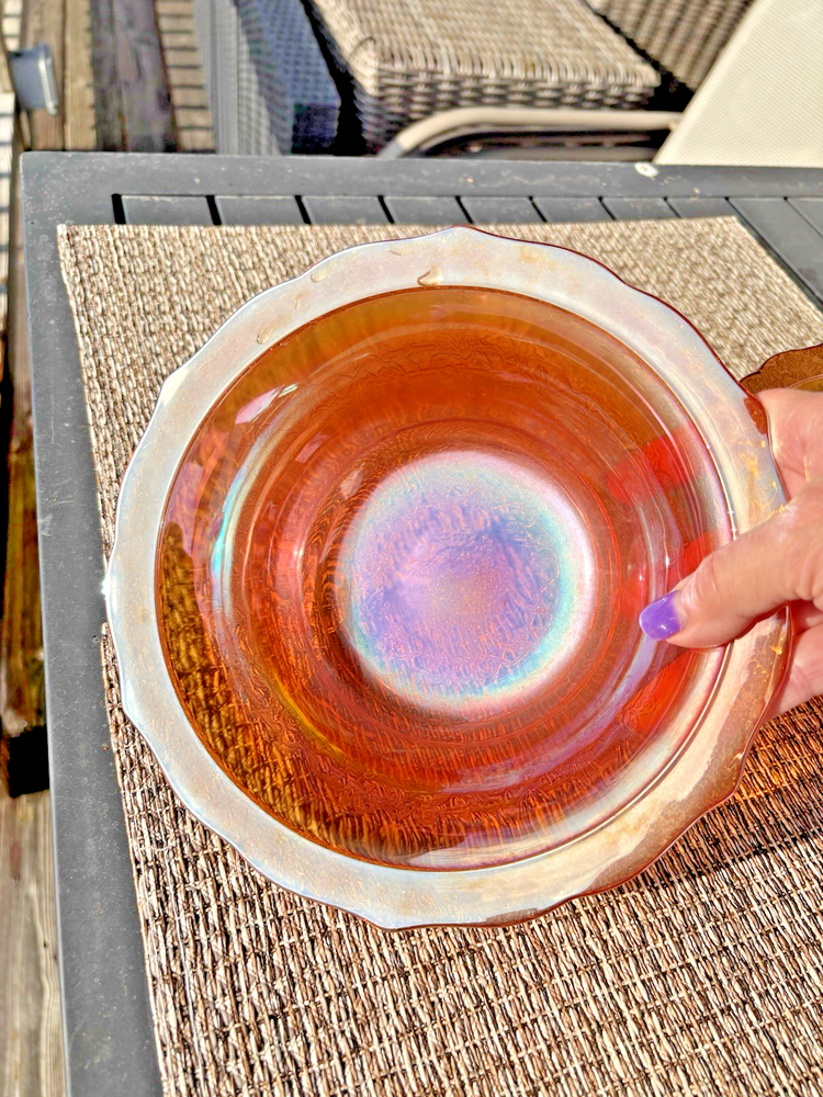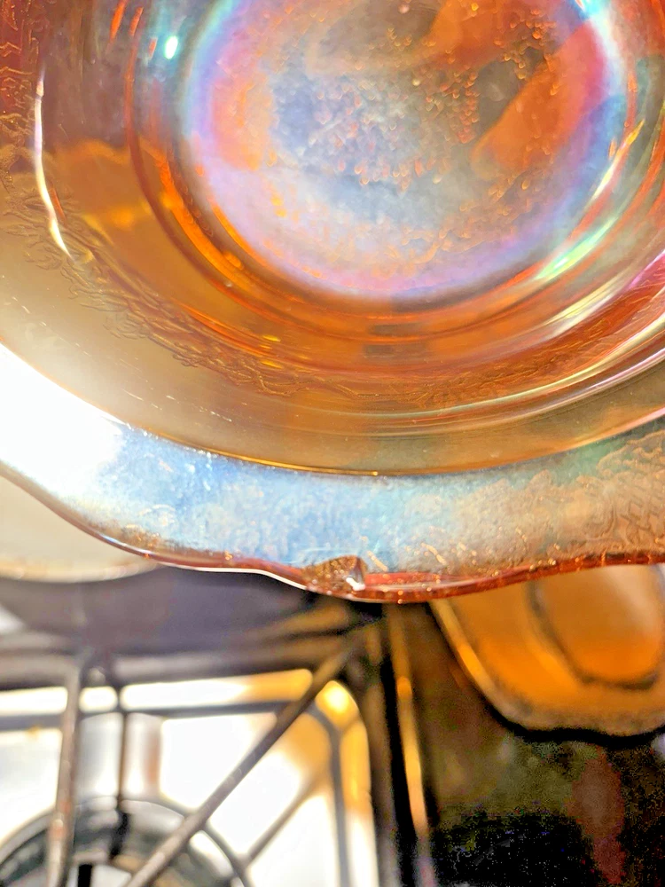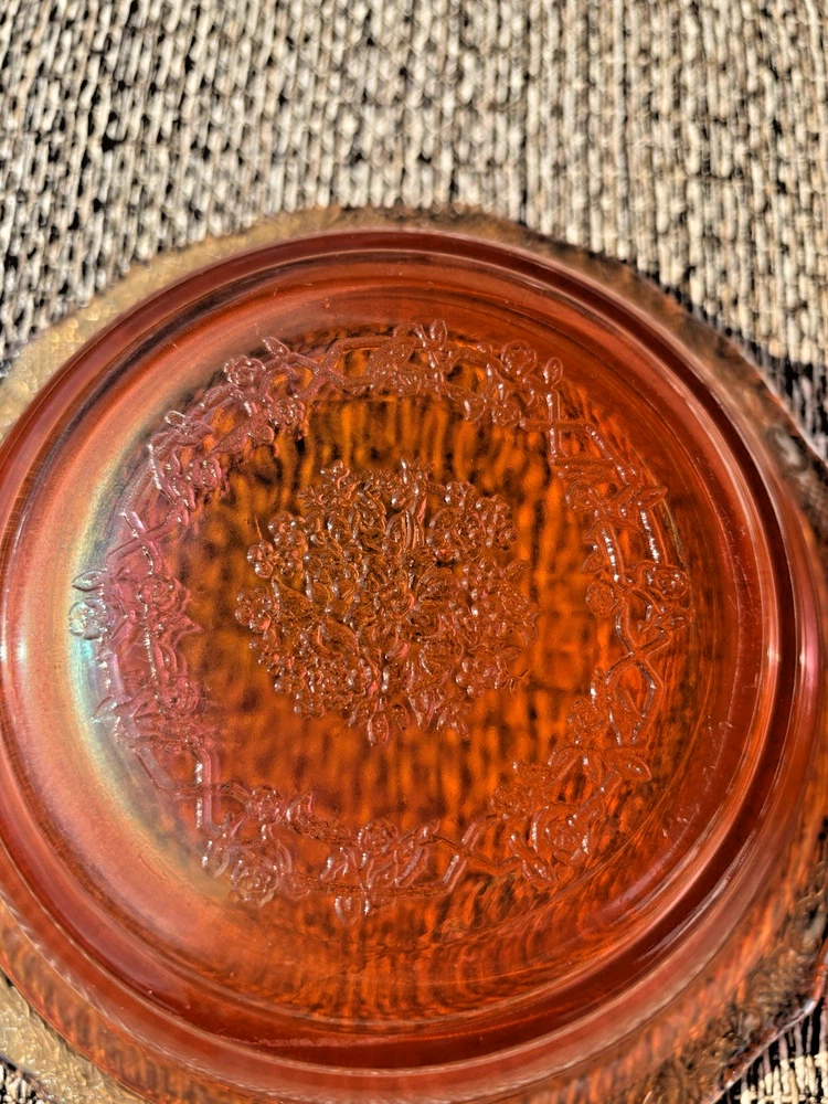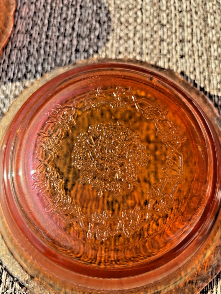 This vintage carnival glass bowl in orange and gold, dating back to the mid-1900s, features an unusual pattern that adds a unique touch to any décor. The set includes two pieces, both mid-century modern in style with an iridescent finish. Made of glass, these bowls are a nostalgic addition to any collection, perfect for displaying or serving snacks in a decorative way. With its vibrant color and vintage appeal, this set is sure to stand out in any room. **1 bowl is perfect-no chips, cracks. 1 bowl has a small chip on the rim (see last 3 pictures). Pricing is for 1 bowl. Bowl with chip is being included for free-due to chip.
