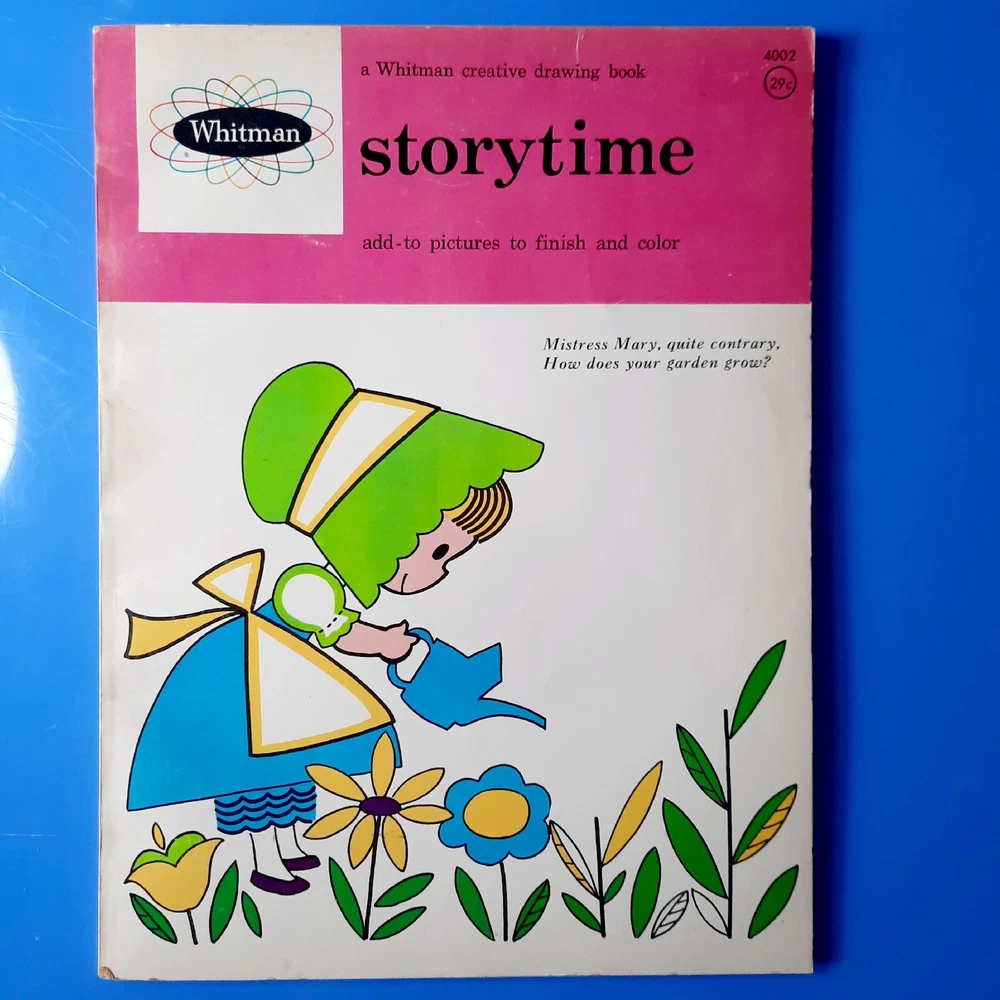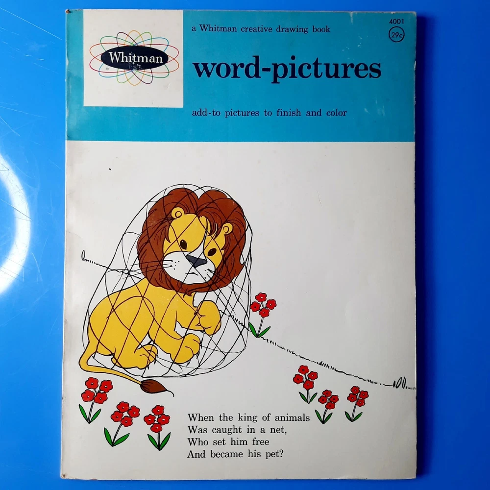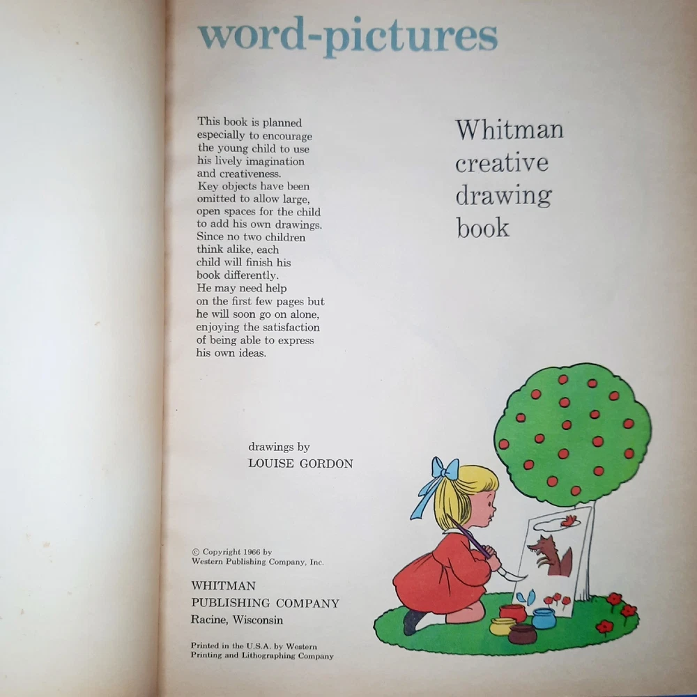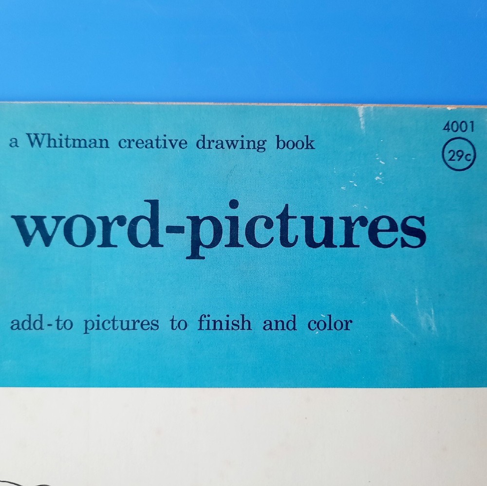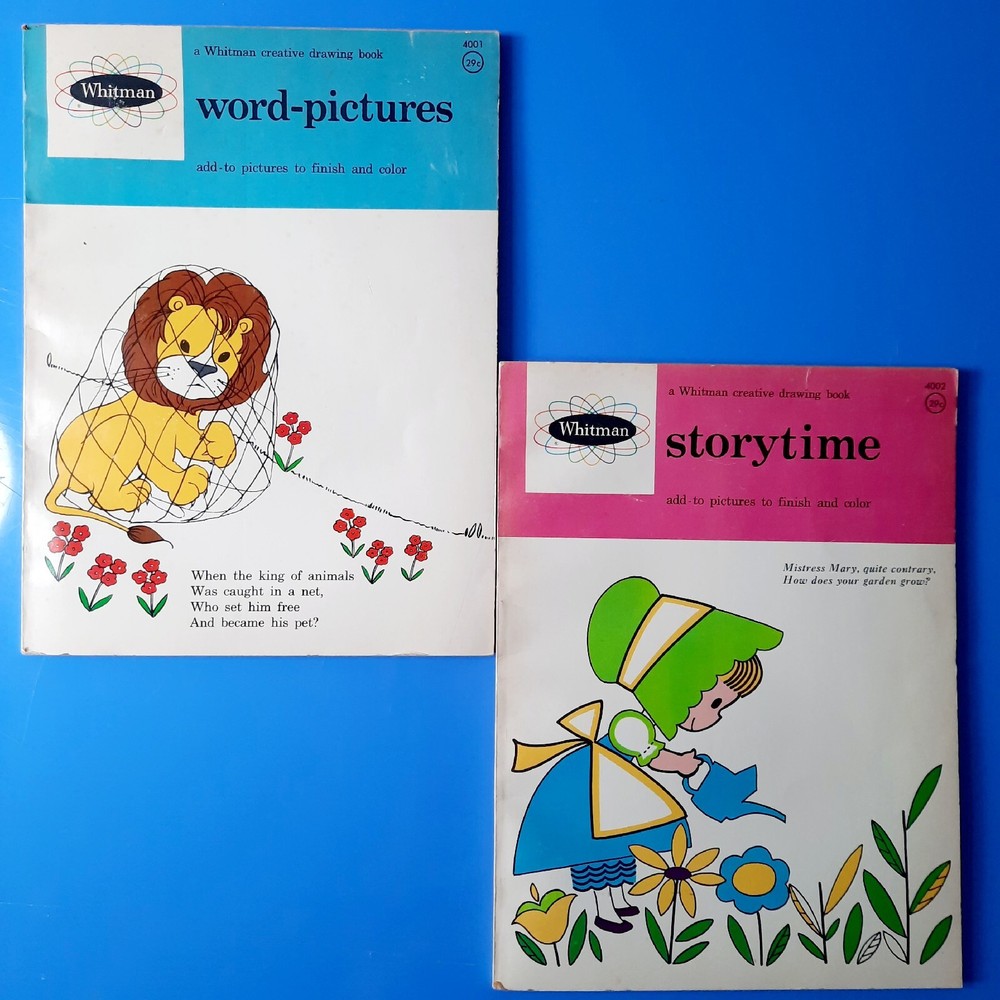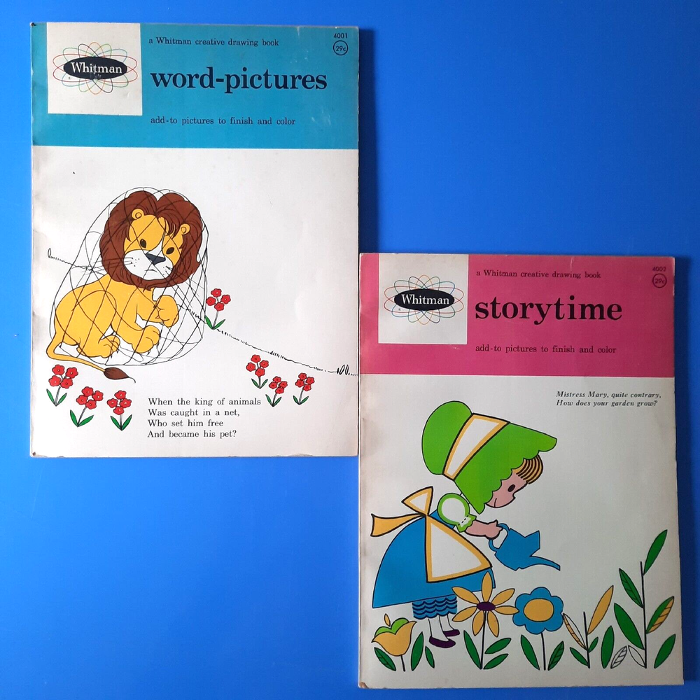 2 Whitman creative drawing books Add to pictures to finish and color Word Pictures #4001 Storytime #4002 Copyright 1966 Printed in the USA by Western Printing and Lithographing Company Vintage preowned condition - the books have not been written / drawn in, the covers have scuff marks and edge wear, the interior pages have yellowed and also have edge wear P lease save "Serendipity Juntiques" to your favorites. Check back often - new items added weekly Message me with any questions and I will gladly answer them. Thanks for looking and have a blessed day!