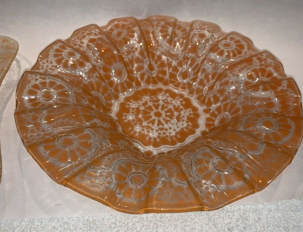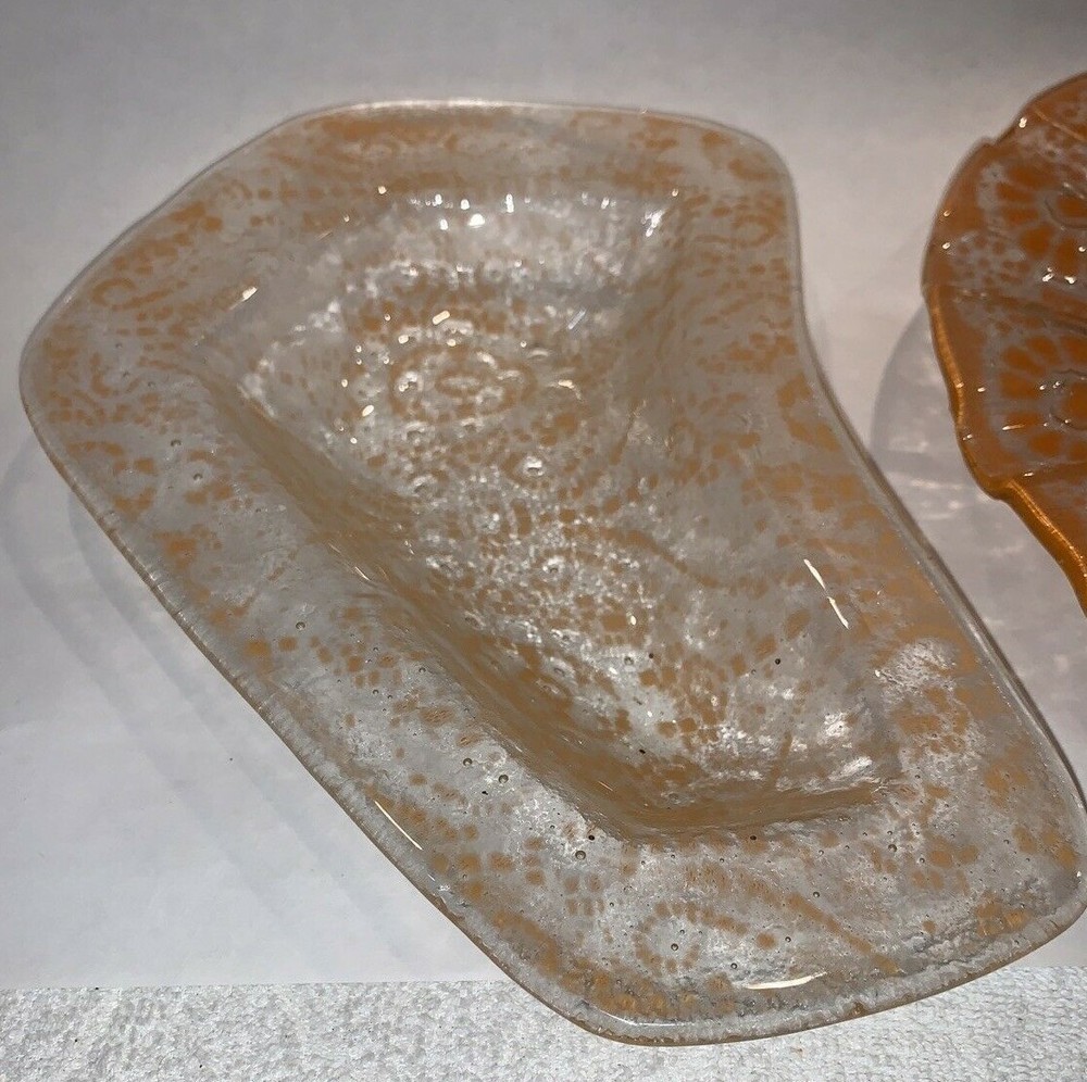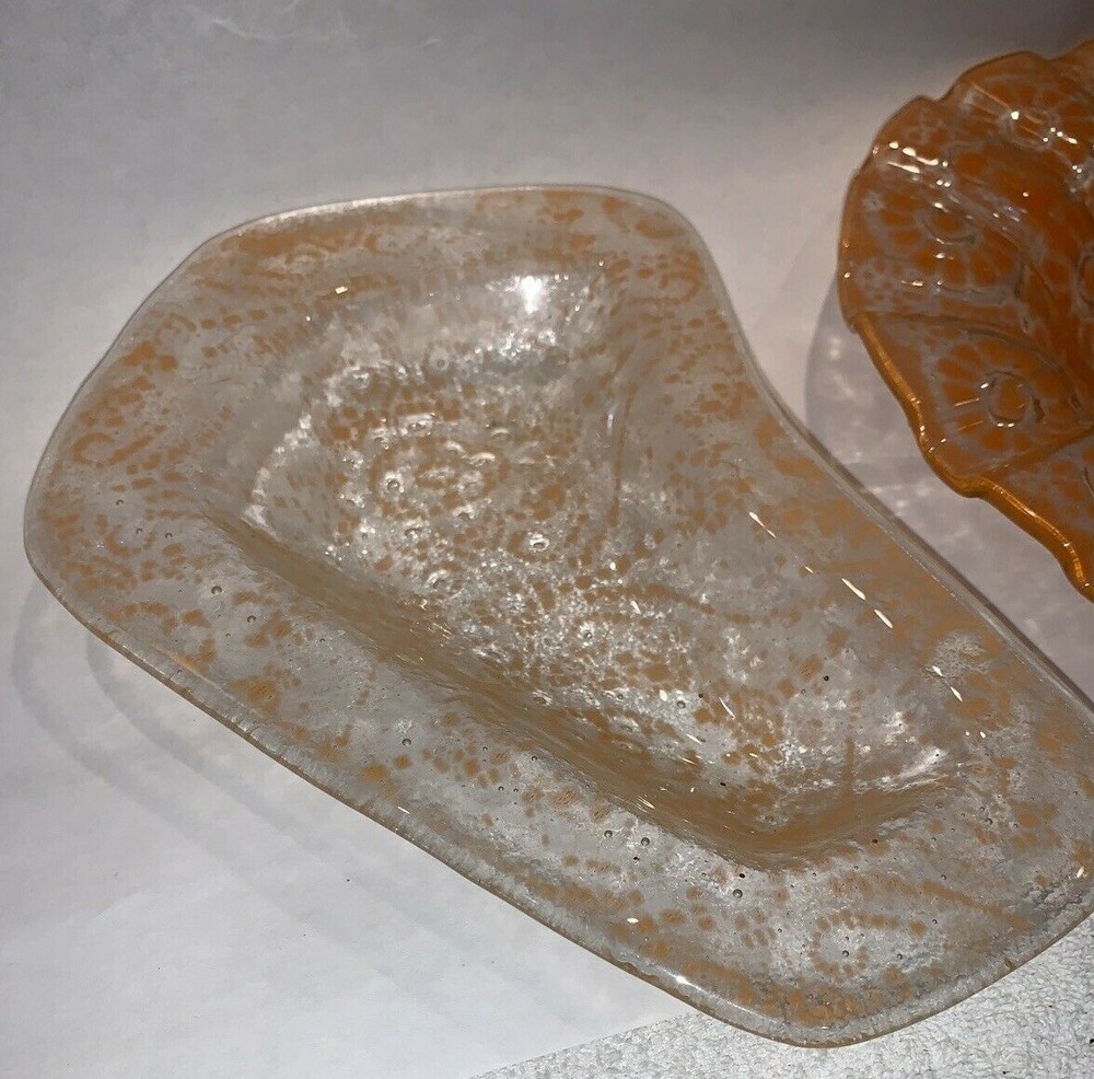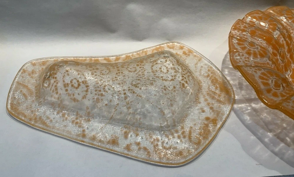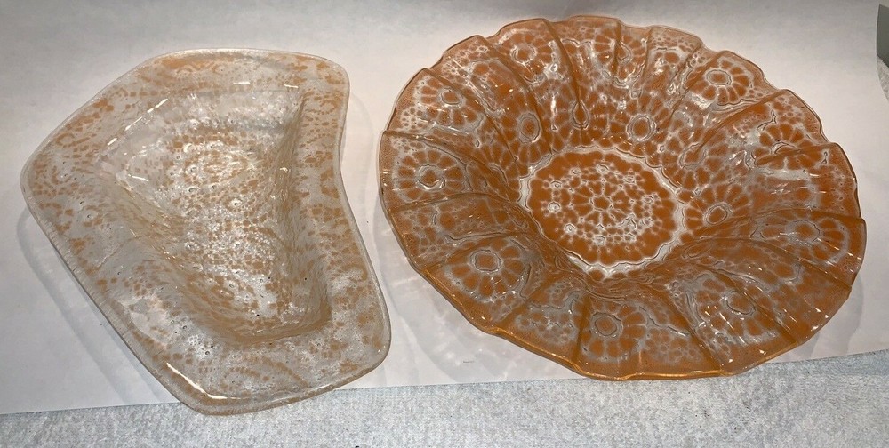 2 pieces mid century fused orange glass ruffled bowl freeform dish Walter Jacobson For your consdieration are these 2 nice pieces of mid century fused glass. First is a beautiful large, fused glass bowl which is a bit of a mystery. It appears to be a classic Sydenstricker ruffled bowl but instead of the usual Sydenstricker signature in the center of the underside, it has an incised signature apparently by the artist who created it. To me it looks like "Jacobson" but I can't be 100% sure. I don't know if artists in the Sydenstricker glassworks ever signed their pieces individually or if this is by someone else who did their own piece in the style of Sydenstricker. I found a Jacobson online who does fused glass but his pieces are quite different in style from this, which again, seems to be very much like classic Sydenstricker. Regardless of who did it, it is in excellent vintage condition. No chips, cracks or any issues to note and measures about 10-3/8” diameter x 1.75” high at the edge. The second is an interesting mid-century hot kiln formed “slumped” glass footed dish which looks to be done by the late master glass artist and Troy State Alabama University Art instructor Edwin D. Walter (1918-2001). Mr. Walter was a noted pioneer in the kiln-fired glass movement with his works exhibited in many South and Midwest Museums. Abstract orange, lacy design in clear glass. Sits on 3 feet formed in the slumping. I was unable to find a signature but the same shaped-piece with a different design can be seen on the worthpoint websight if you google "edwin walter art glass". The piece measures approximately 10" long x 7.5” at widest x 1-3/8” tall and is in excellent, undamaged condition Together they will weigh about 3 pounds packed safely. Local pickup near Boston welcome. I have other signed Sydenstricker pieces in separate listings & will combine shipping when safe and practical. Thank you!