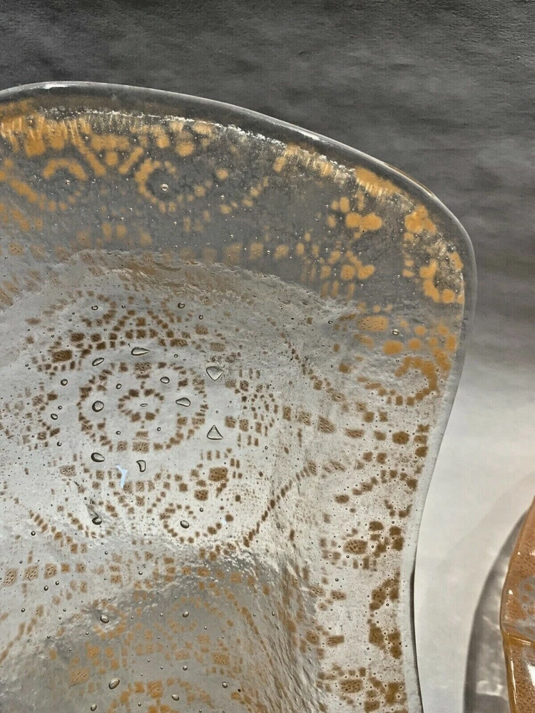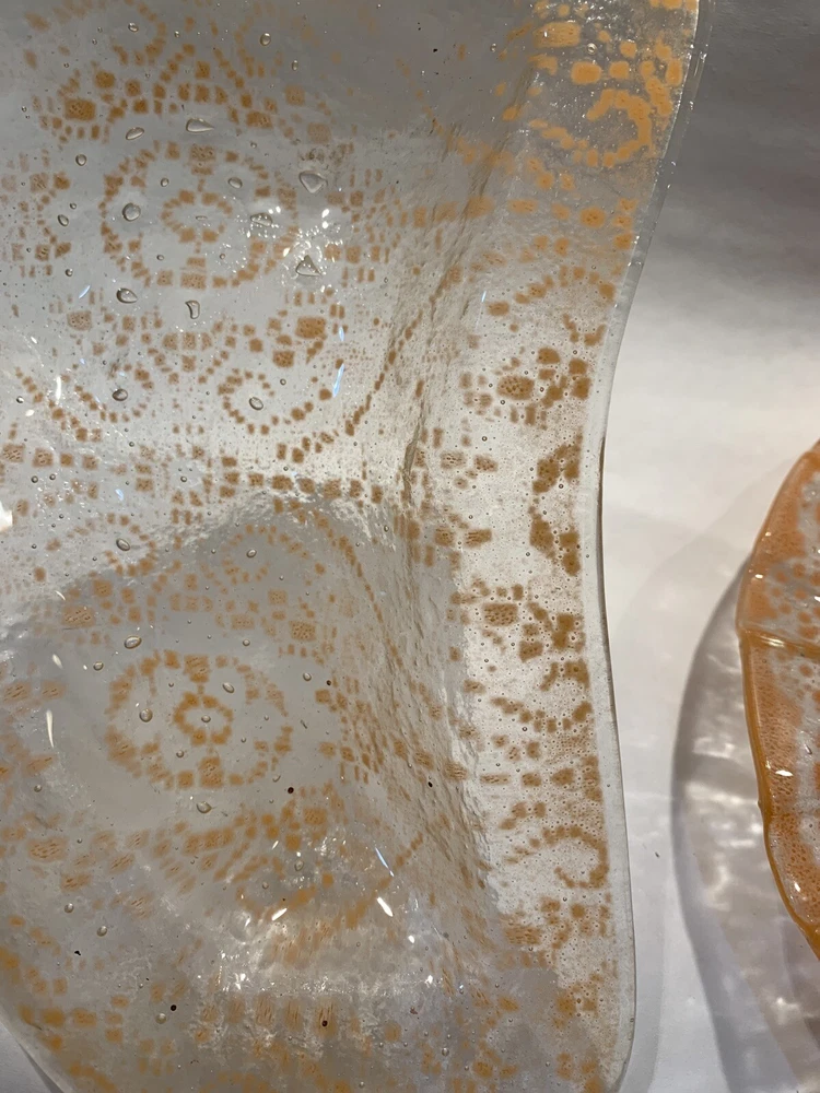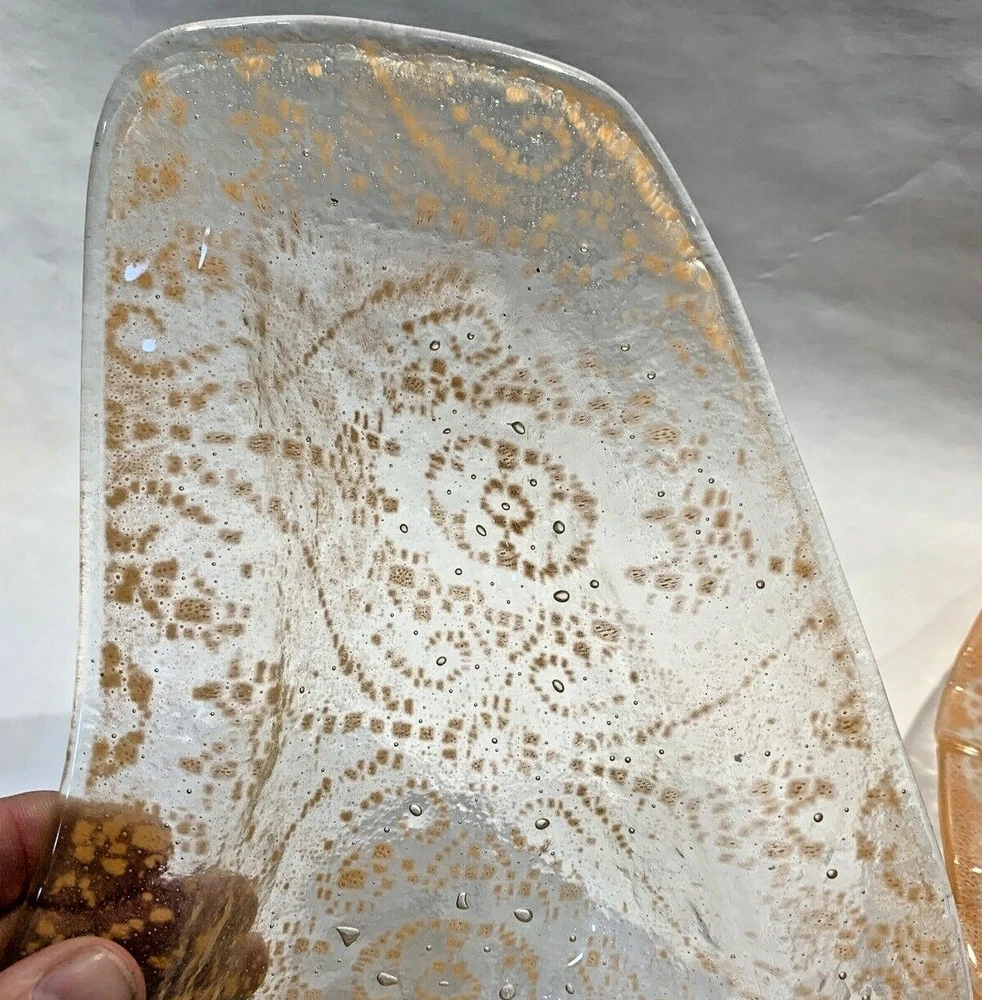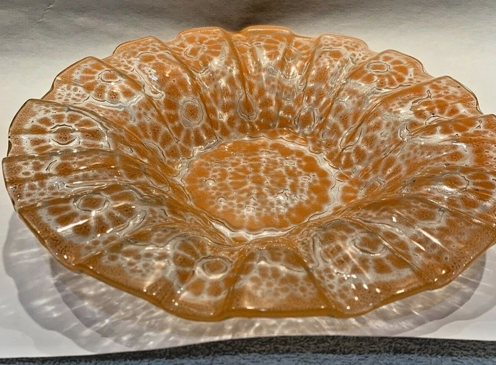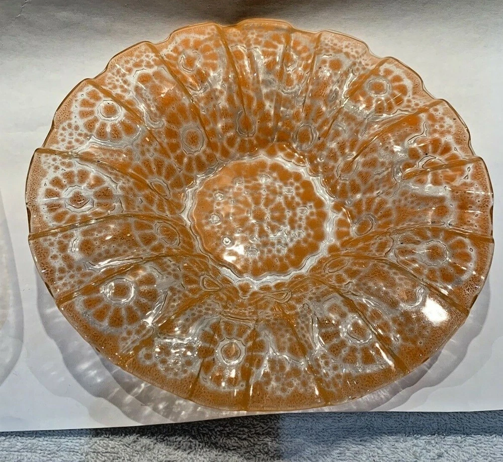 2 pieces mid century fused orange glass ruffled bowl freeform dish Walter Jacobson For your consdieration are these 2 nice pieces of mid century fused glass. First is a beautiful large, fused glass bowl which is a bit of a mystery. It appears to be a classic Sydenstricker ruffled bowl but instead of the usual Sydenstricker signature in the center of the underside, it has an incised signature apparently by the artist who created it. To me it looks like "Jacobson" but I can't be 100% sure. I don't know if artists in the Sydenstricker glassworks ever signed their pieces individually or if this is by someone else who did their own piece in the style of Sydenstricker. I found a Jacobson online who does fused glass but his pieces are quite different in style from this, which again, seems to be very much like classic Sydenstricker. Regardless of who did it, it is in excellent vintage condition. No chips, cracks or any issues to note and measures about 10-3/8” diameter x 1.75” high at the edge. The second is an interesting mid-century hot kiln formed “slumped” glass footed dish which looks to be done by the late master glass artist and Troy State Alabama University Art instructor Edwin D. Walter (1918-2001). Mr. Walter was a noted pioneer in the kiln-fired glass movement with his works exhibited in many South and Midwest Museums. Abstract orange, lacy design in clear glass. Sits on 3 feet formed in the slumping. I was unable to find a signature but the same shaped-piece with a different design can be seen on the worthpoint websight if you google "edwin walter art glass". The piece measures approximately 10" long x 7.5” at widest x 1-3/8” tall and is in excellent, undamaged condition Together they will weigh about 3 pounds packed safely. Local pickup near Boston welcome. I have other signed Sydenstricker pieces in separate listings & will combine shipping when safe and practical. Thank you!